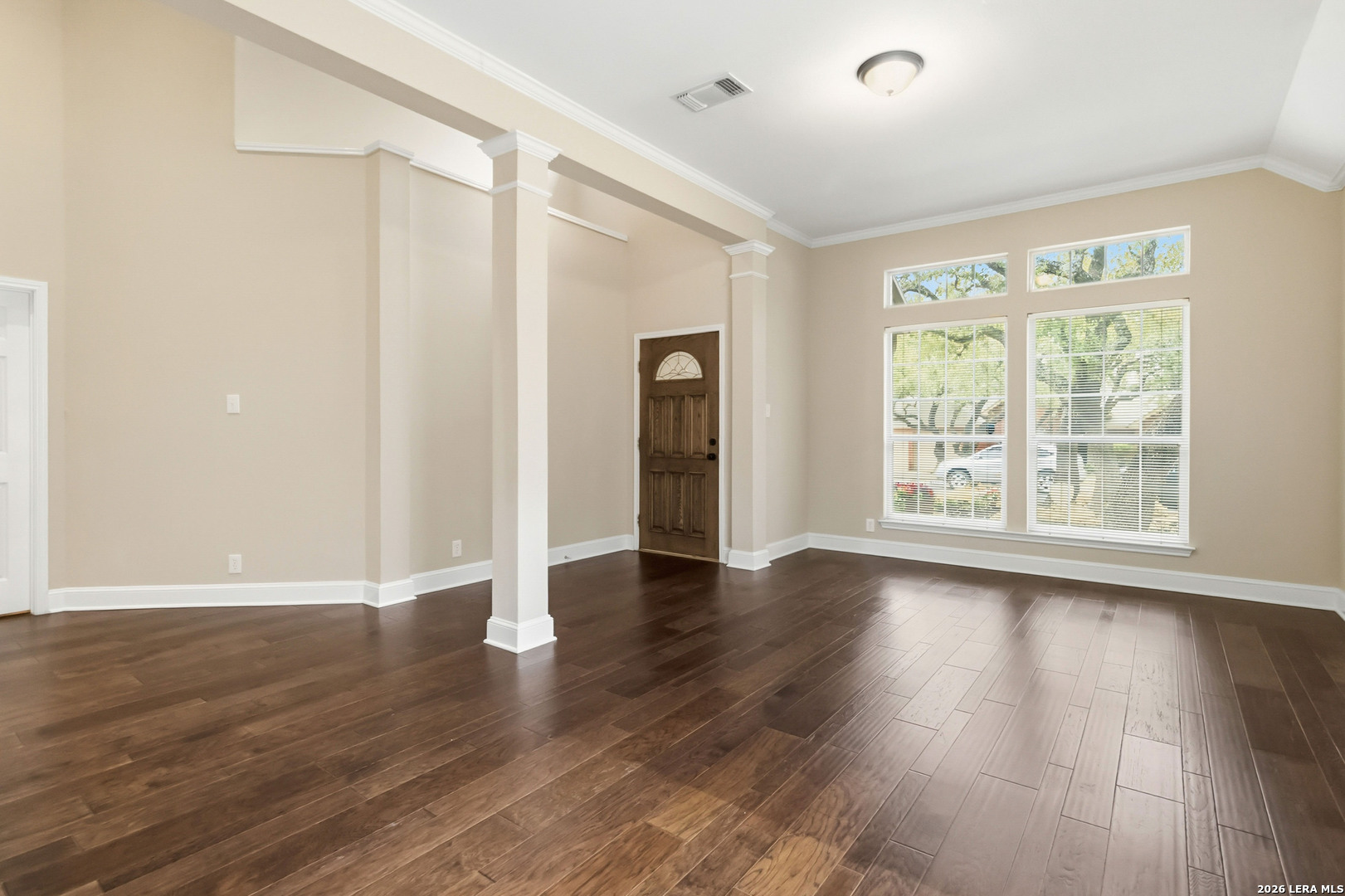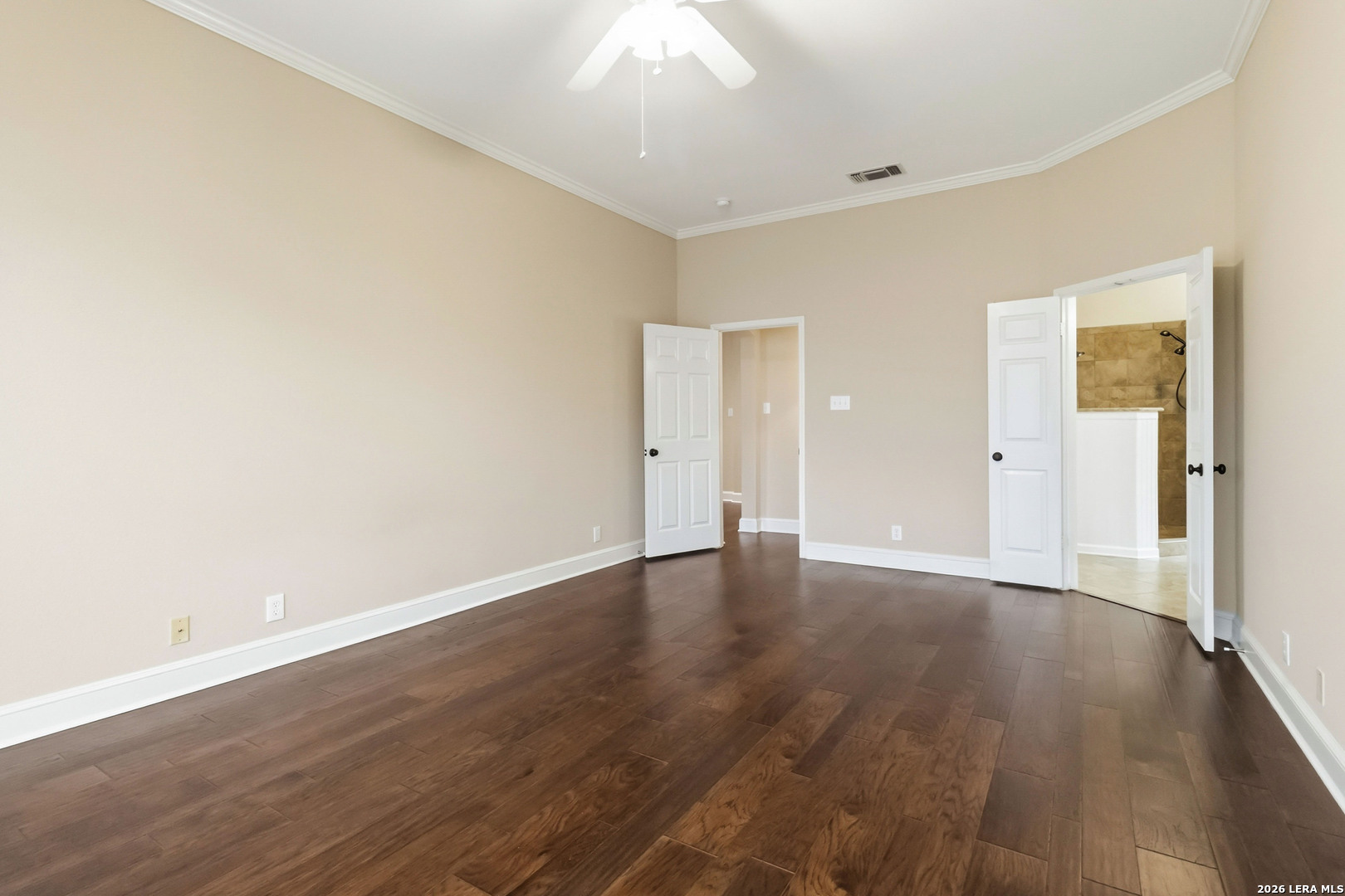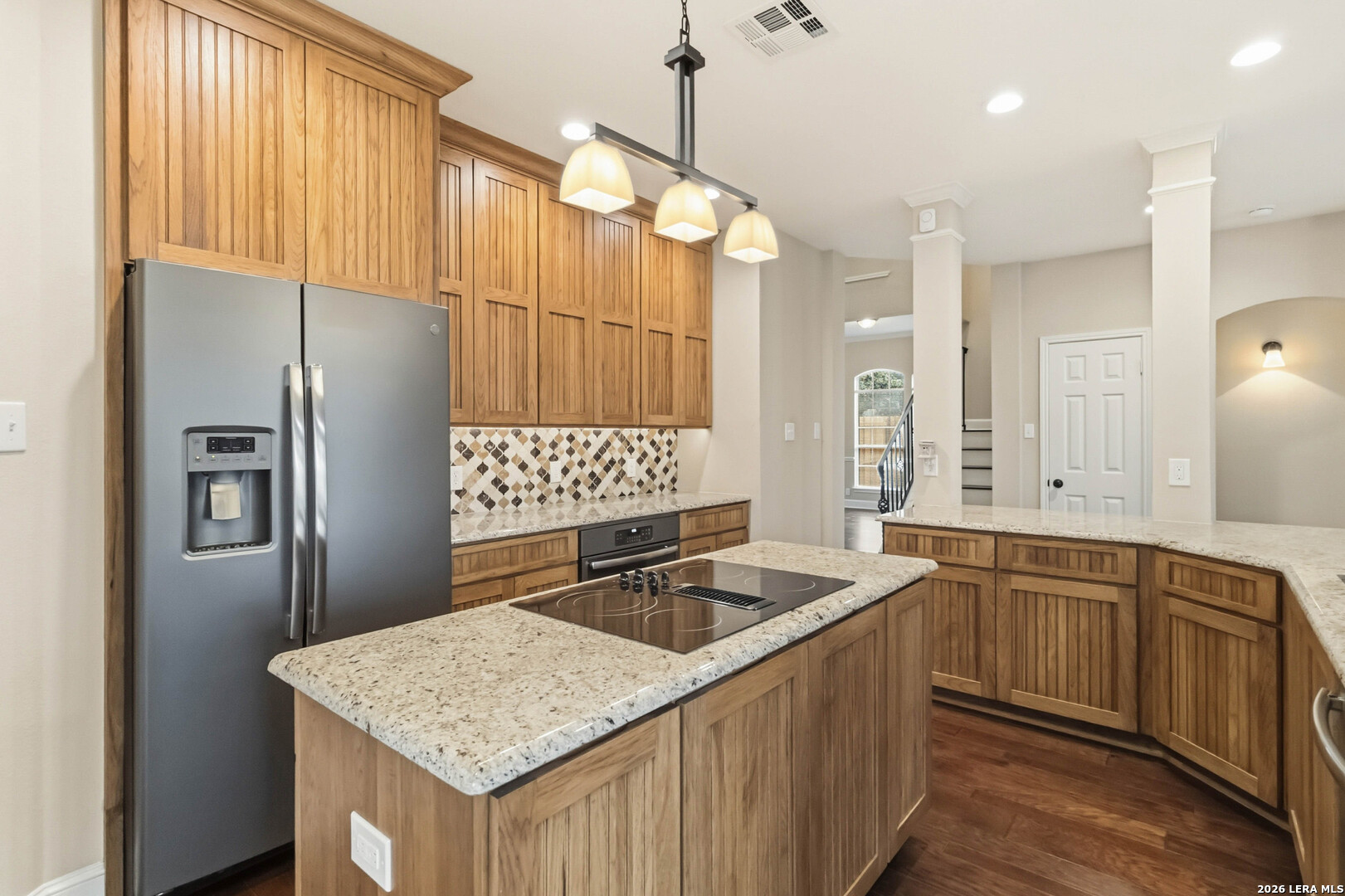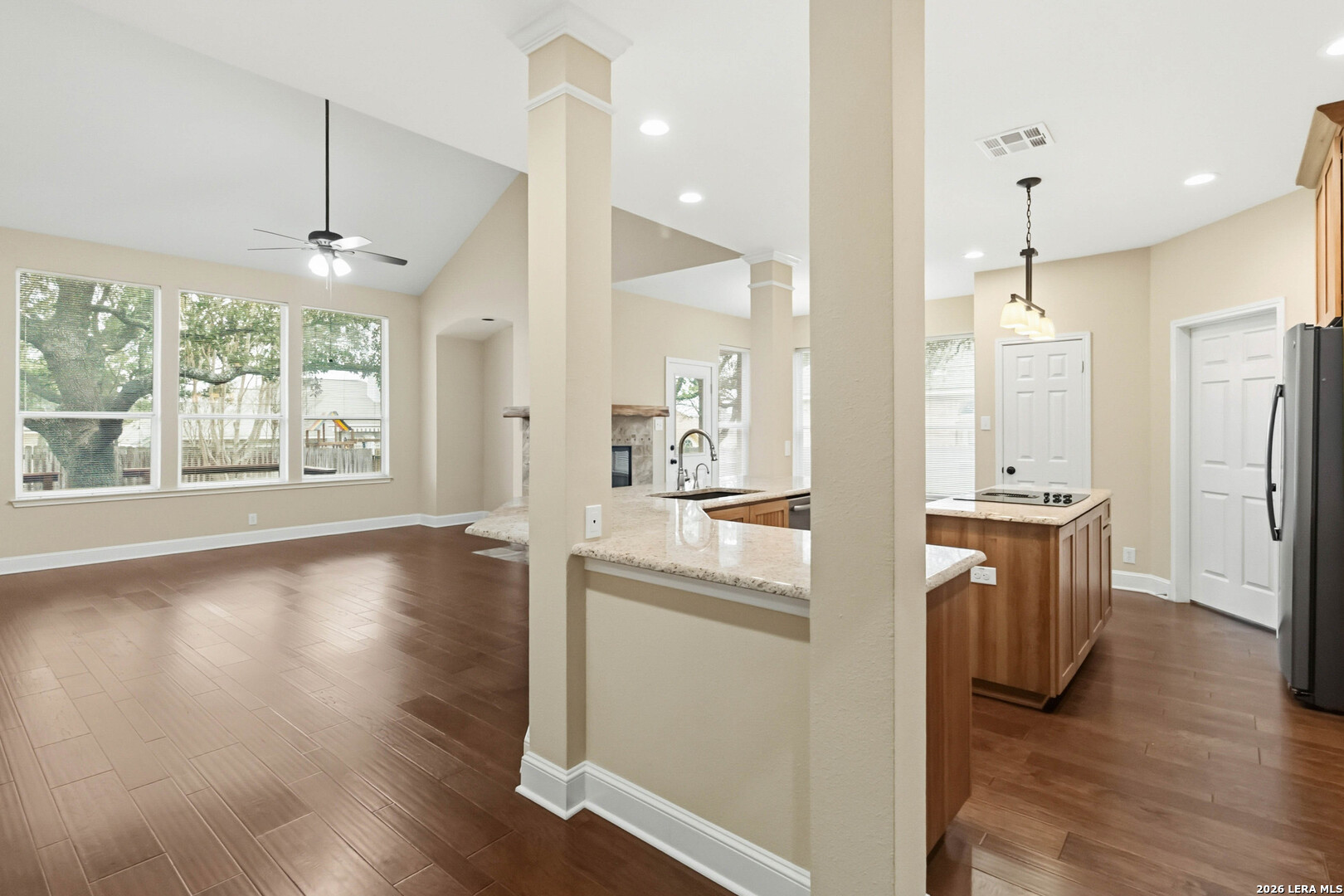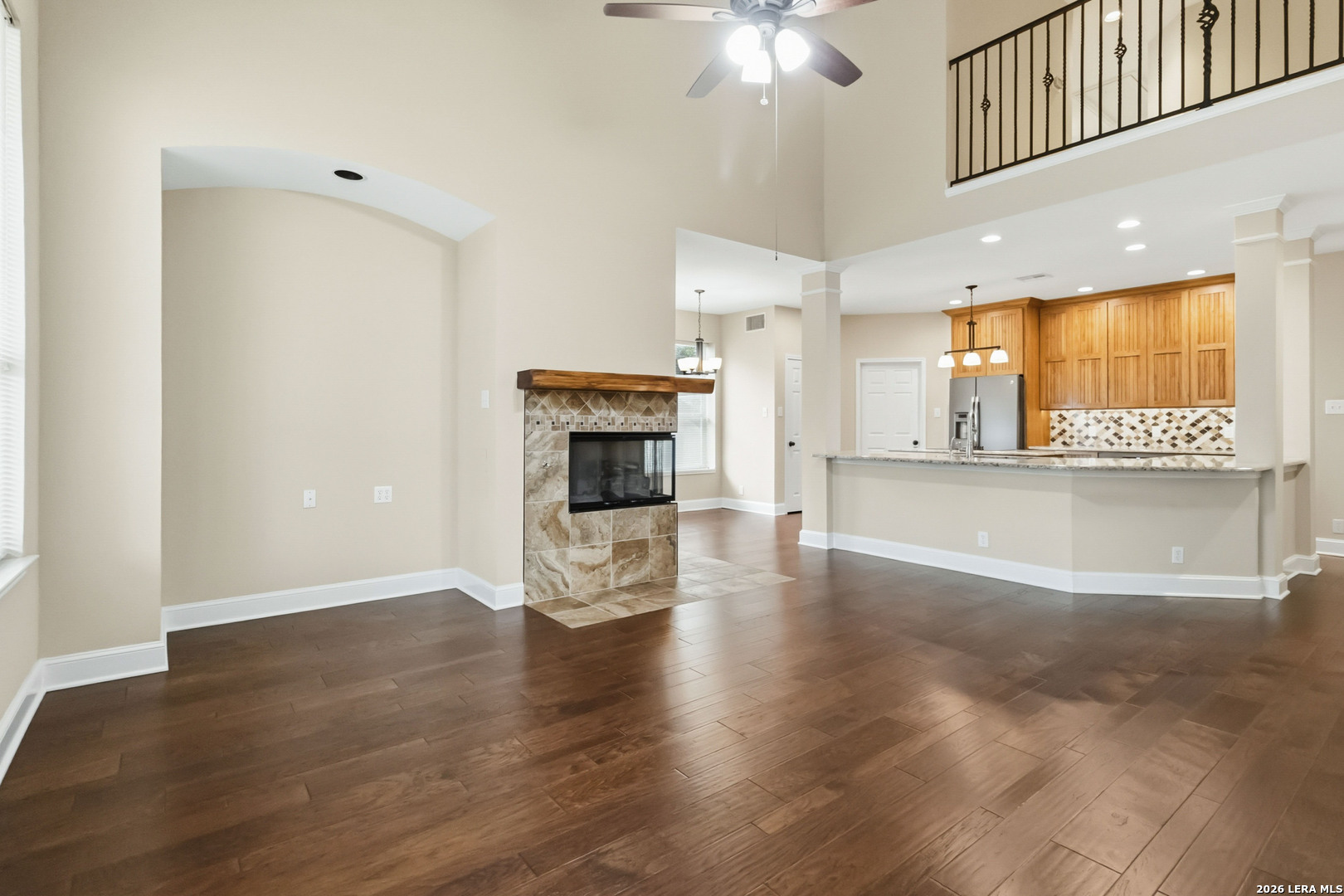 As you approach this home nestled beneath majestic oak trees in Santa Fe Trails, you immediately feel its timeless charm and welcoming presence. Stepping through the front door, your eyes are drawn upward to the soaring ceilings that create an open, airy, and light-filled atmosphere. Gorgeous wood floors guide you through the main living areas, adding warmth, character, and a seamless flow from room to room. To your left, the first living area feels perfect for conversation or quiet relaxation, while straight ahead the second expansive living space invites you to gather, entertain, or simply unwind in comfort. As you move toward the heart of the home, the beautifully updated kitchen shines - featuring custom cabinetry, gleaming granite countertops, and a stainless-steel refrigerator that conveys with the sale. You can easily imagine cooking, hosting, and making memories in this bright and functional space. Tucked away on the main level, the primary suite offers a peaceful retreat with charming bay window views overlooking the backyard. Inside, the refreshed spa-like walk-in shower and oversized closet make this space feel both luxurious and practical. Heading upstairs, you discover three additional bedrooms plus two flexible living areas - ideal for a home office, library, game room, study space, or cozy sitting area. New carpet, fresh paint, and updated ceiling fans make this entire level feel crisp and move-in ready. Back downstairs and out the back door, the home continues to impress with a relaxing pergola deck, a spacious yard, and a storage shed for extra convenience - perfect for outdoor living and entertaining. A three-car garage paired with a level driveway provides abundant parking and storage options. With added energy-efficient features like a tankless water heater, water softener, Seal & Insulate TAP Pest Control attic insulation, and a full sprinkler system, this home blends beauty, comfort, and smart living.