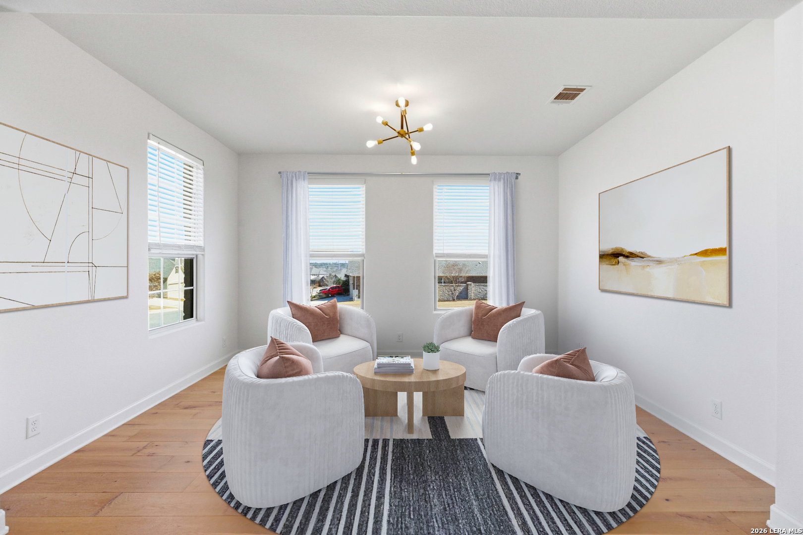 Modern luxury meets functional design in this stunning 4-bedroom, 3.5 bath residence featuring a versatile layout across two levels and sits on an oversized corner lot. The first floor offers high ceilings and custom wood flooring throughout. The formal dining room features a custom dry bar with a built-in wine refrigerator, stone countertops and custom lighting. Located across from the dining room is additional open living space. The heart of the home is the open kitchen, boasting white cabinetry, stone countertops, a gas range with a stainless vent hood, and a massive walk-in pantry. This area flows into the family room, centered by a floor-to-ceiling gas stone fireplace. A private study near the center of the home provides a quiet workspace. The primary retreat is located on the main floor for maximum privacy. It features a spa-inspired ensuite bath with dual vanities, a garden tub, and a separate glass shower. This suite is completed with dedicated his and hers walk-in closets. The second level of the home offers a massive game room that serves as a third family area and features 3 additional bedrooms and 2 full baths. Step outside to an extended covered patio with an additional attached paved terrace with planters. The backyard also includes a built-in playscape making it wonderful for summer BBQ's and winding down in the evening. Essential features include a mudroom with a built-in bench, a large utility room, water softener, sprinkler system, security system and a two-car garage. Experience the outdoors at the community pool or the park and playground! Go for a walk or bike ride along the extra wide path that follows Arcadia Path or stroll or jog the wandering nature trails throughout 200 acres of open green space. This home is located in NISD with award winning schools and near tons of shopping, dining, and major highways. Do not miss the opportunity to make this your new home!