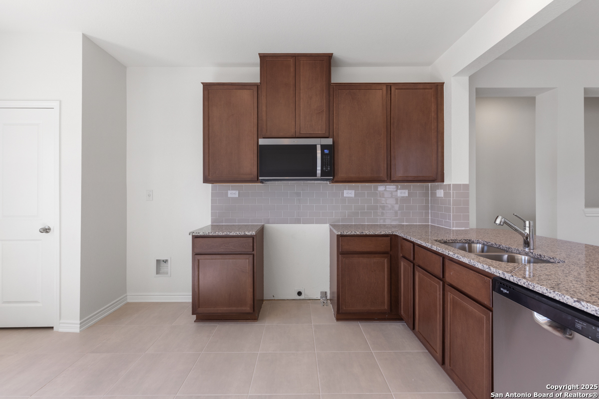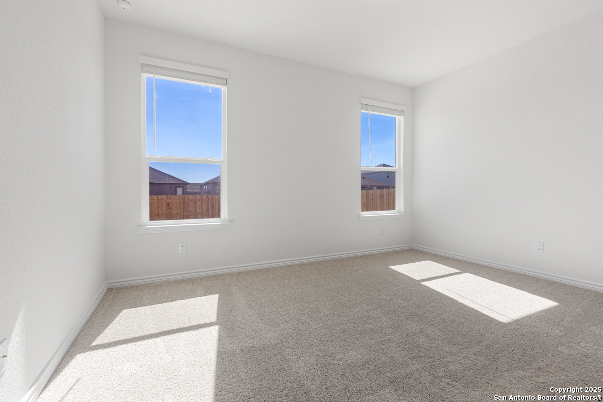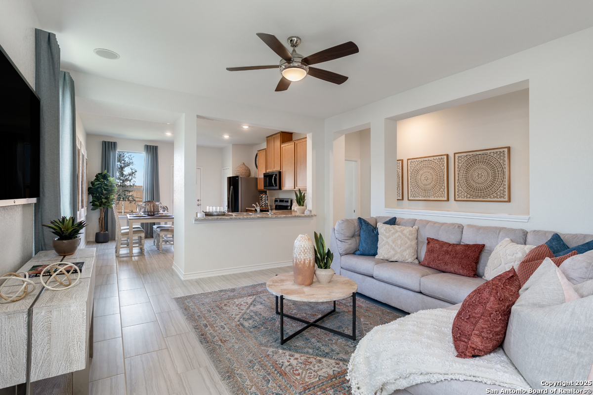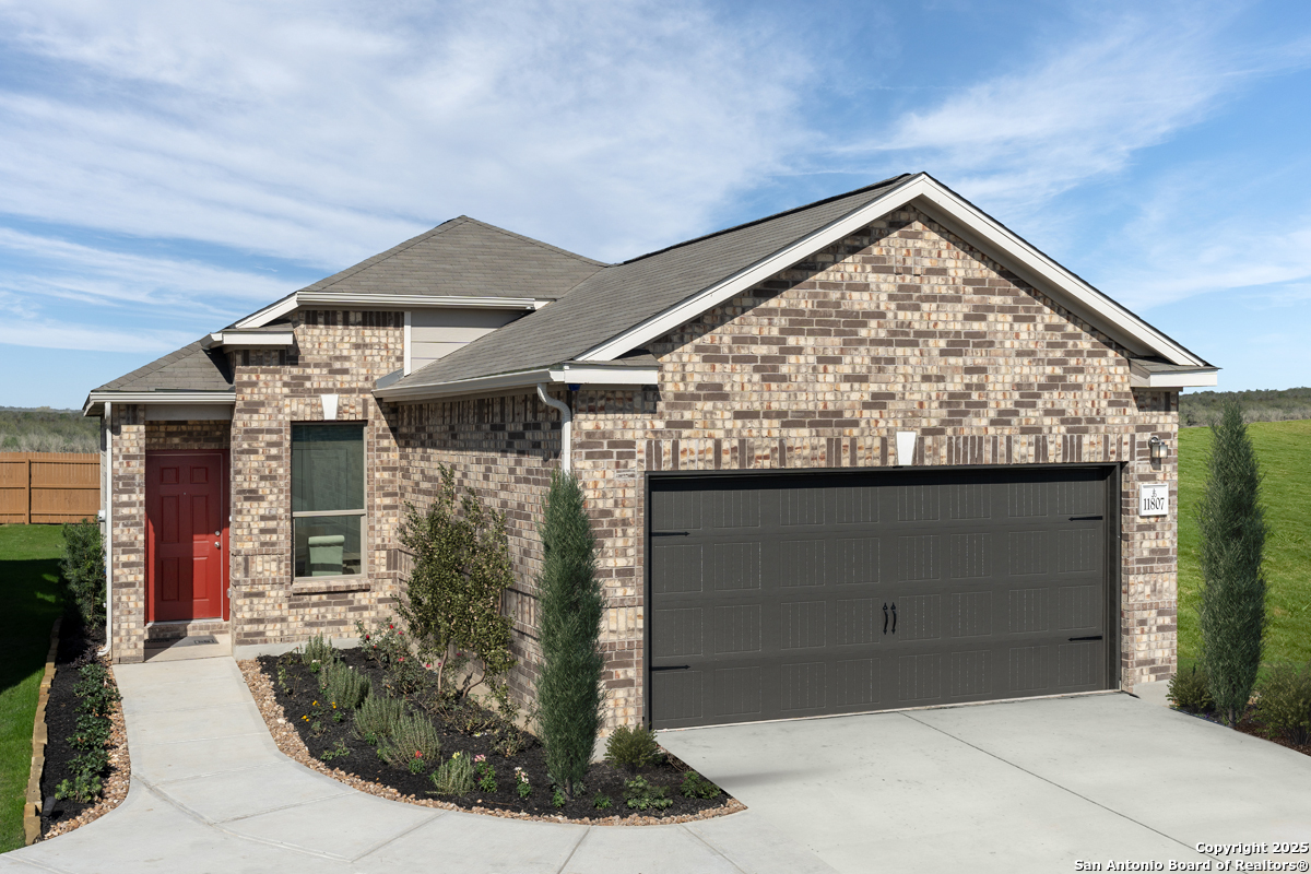 Step into comfort and style with this beautifully designed home featuring 9-ft. ceilings on the first floor for an open, airy feel. The kitchen boasts Whirlpool stainless steel appliances, Woodmont Cody 42-in. upper cabinets, granite countertops in Barcelona, a Daltile tile backsplash, and an extended breakfast bar-perfect for casual dining. The primary bath offers a spa-like retreat with a raised vanity, upgraded cabinets, and a 42-in. garden tub/shower accented by a Daltile tile surround. Decorative touches include a Carrara-style entry door, Kwikset Polo interior hardware, 2-in. faux wood blinds, and Stella Vista ceramic tile flooring in key areas. Enjoy added peace of mind with a wireless security system and a fully sodded yard ready for outdoor enjoyment.