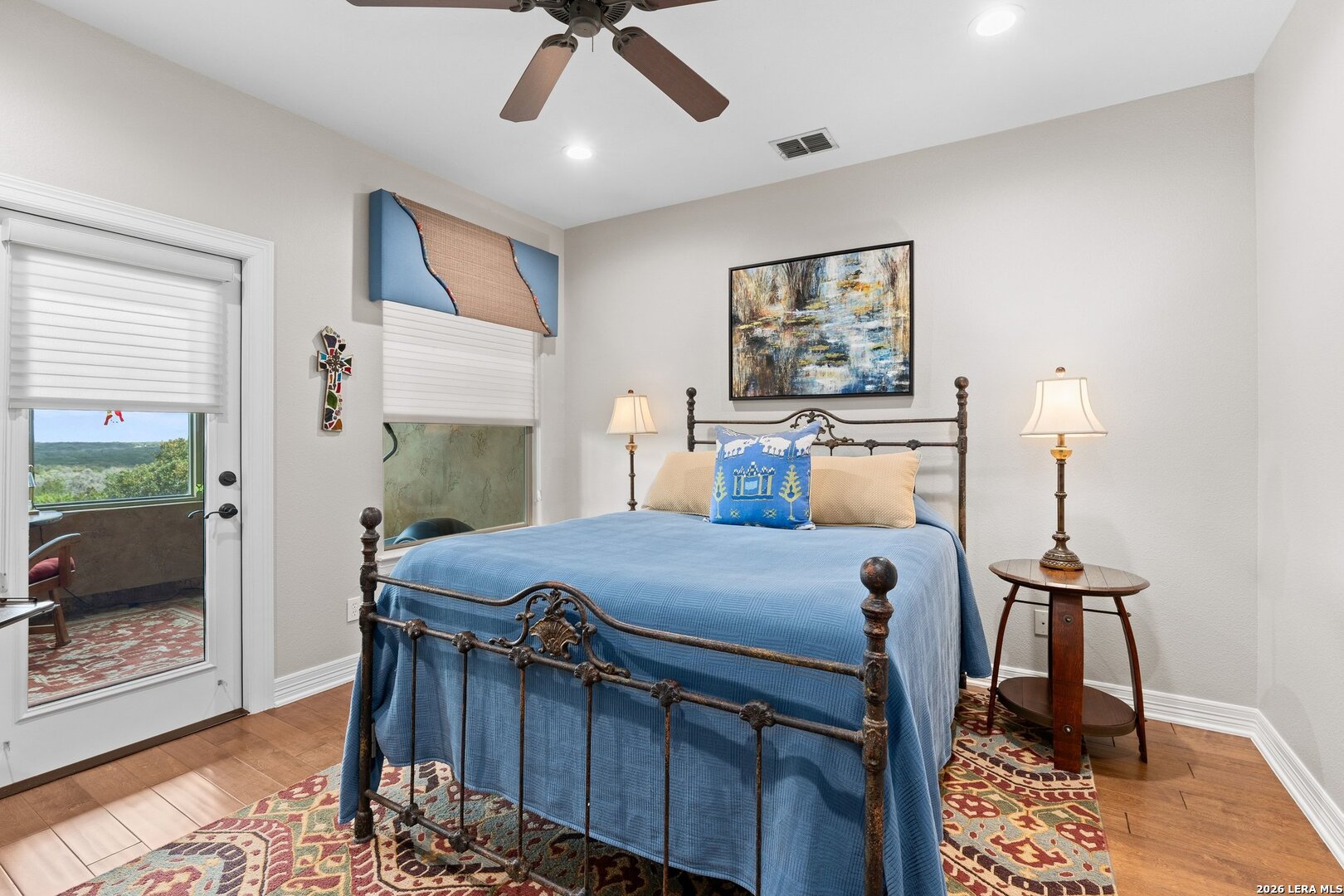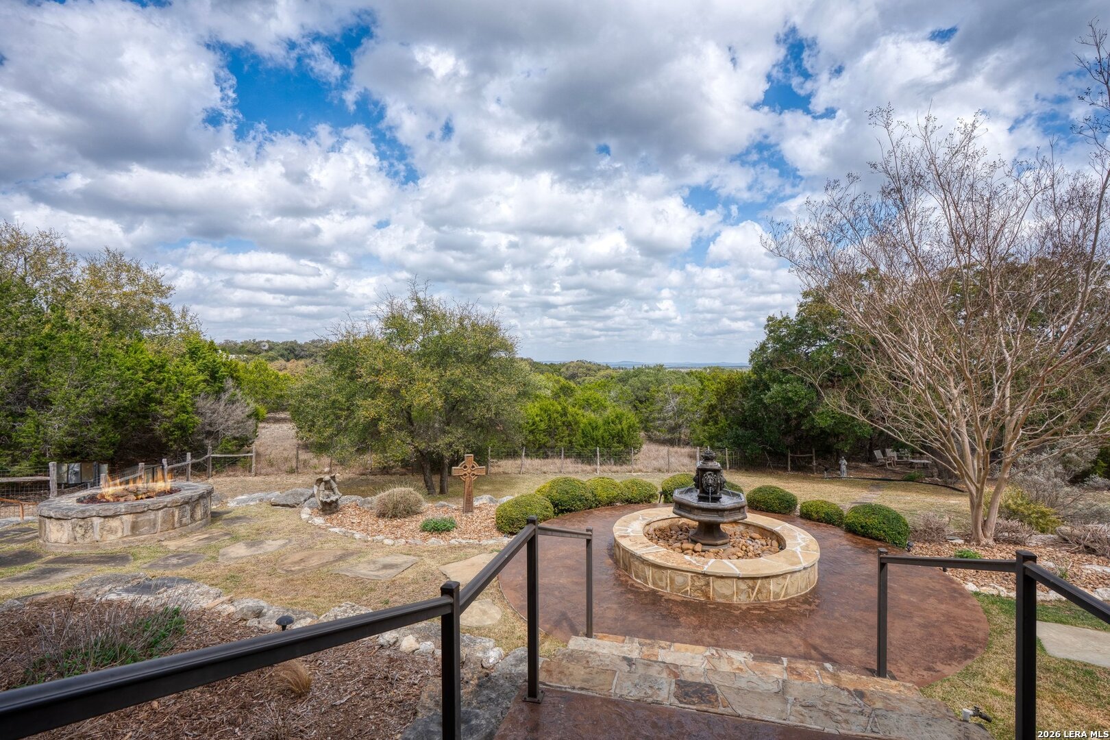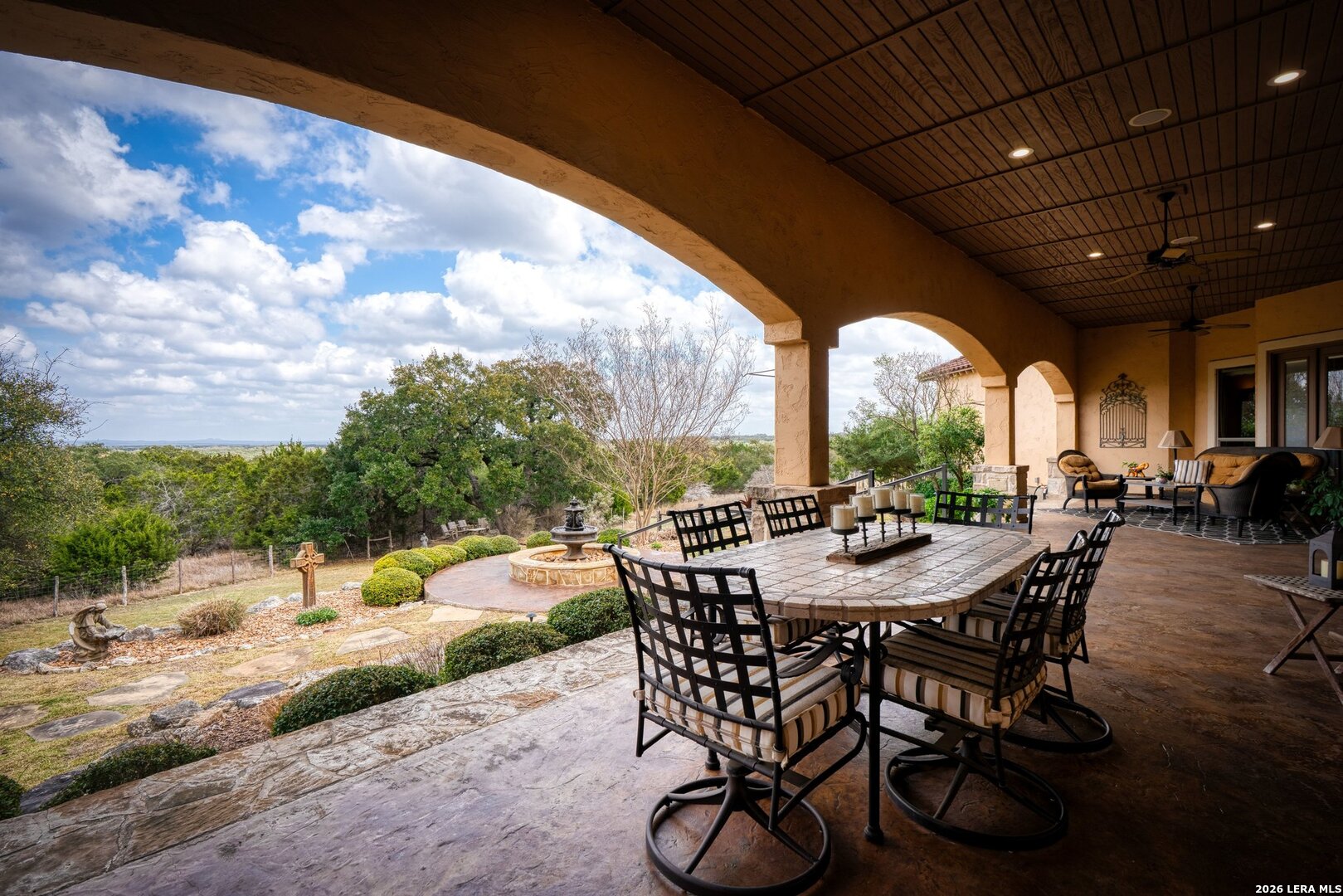 Perched high above the breathtaking Guadalupe River Valley, 136 Park Ridge is a rare legacy property occupying 4.67 acres within the prestigious Cordillera Ranch. Commanding 20 mile panoramic views from one of the community's most coveted elevations, this 5,087 square foot custom residence offers refined Hill Country living at its finest-along with exceptional privacy rarely found in a community setting. Built in 2004 by Burdick and Christofilis and thoughtfully designed by renowned architect Ken Woolley, the home blends timeless architecture with exceptional craftsmanship and modern comfort. A distinctive foyer welcomes you into beautifully curated spaces that include a private study with custom built-ins and abundant storage, an elegant dining room with integrated cabinetry, and a richly detailed beamed family room anchored by gas logs. Surround stereo sound extends throughout the home, garage, and outdoor patio, and the residence is fully networked for seamless internet connectivity. The open-concept kitchen is designed for both entertaining and everyday living, featuring an expansive island, a large walk-in pantry, a wine refrigerator, and an ice maker, all flowing effortlessly into the main living areas and outdoor spaces. The home offers four spacious bedrooms, four full baths each with a built-in closet, and a powder bath downstairs. Upstairs, a private library suite with built-ins and its own refrigerator provides a flexible retreat for guests or extended family, complemented by a large storage room and a dedicated exercise room. A well-appointed laundry room adds everyday convenience. The primary suite serves as a private sanctuary, highlighted by two exceptionally large his-and-her closets complete with packing stations. The spa-inspired primary bath features heated floors, separate water closets and vanities, an oversized walk-in shower, and a large soaking tub designed for relaxation. Thoughtful upgrades and mechanical improvements include three HVAC systems replaced in 2020 and 2021, two 50-gallon water heaters installed in 2021, a central vacuum system, water softener, RO system for drinking water, local alarm system, pest control dispersal system, interior shutters across the front of the home, and smoke detectors, ceiling fans, and integrated stereo speakers throughout. Designed to maximize its extraordinary vantage point overlooking the Guadalupe River Valley, the outdoor living areas are equally impressive and remarkably private. An under-roof patio with stereo sound creates the perfect setting for entertaining, while the outdoor kitchen, refurbished in 2025, enhances the experience. A propane fire pit, fountain water feature, and two separate outdoor sitting areas invite you to relax and take in the sweeping views in complete seclusion. The approximately 0.6-acre fenced backyard includes a pet access door and is supported by a 13-station sprinkler system reconditioned in 2025. The three-car garage offers additional storage and epoxy flooring, and the home is crowned by a Mexican tile roof just recently resealed. This exceptional high-elevation estate offers architectural pedigree, extensive updates, extraordinary privacy, and truly unmatched long-range views, all within one of the Texas Hill Country's most exclusive country club communities.