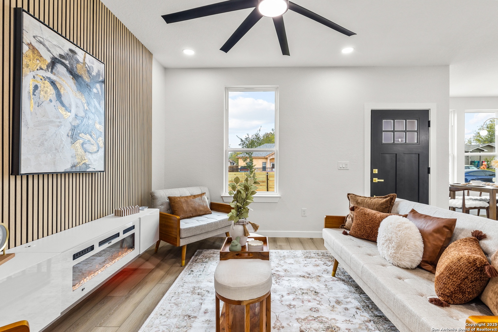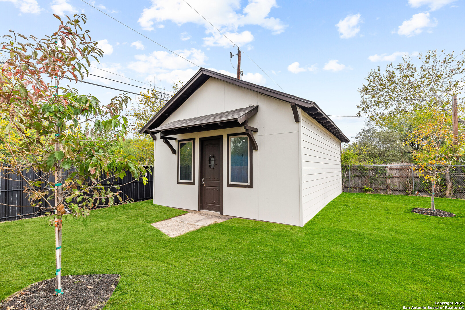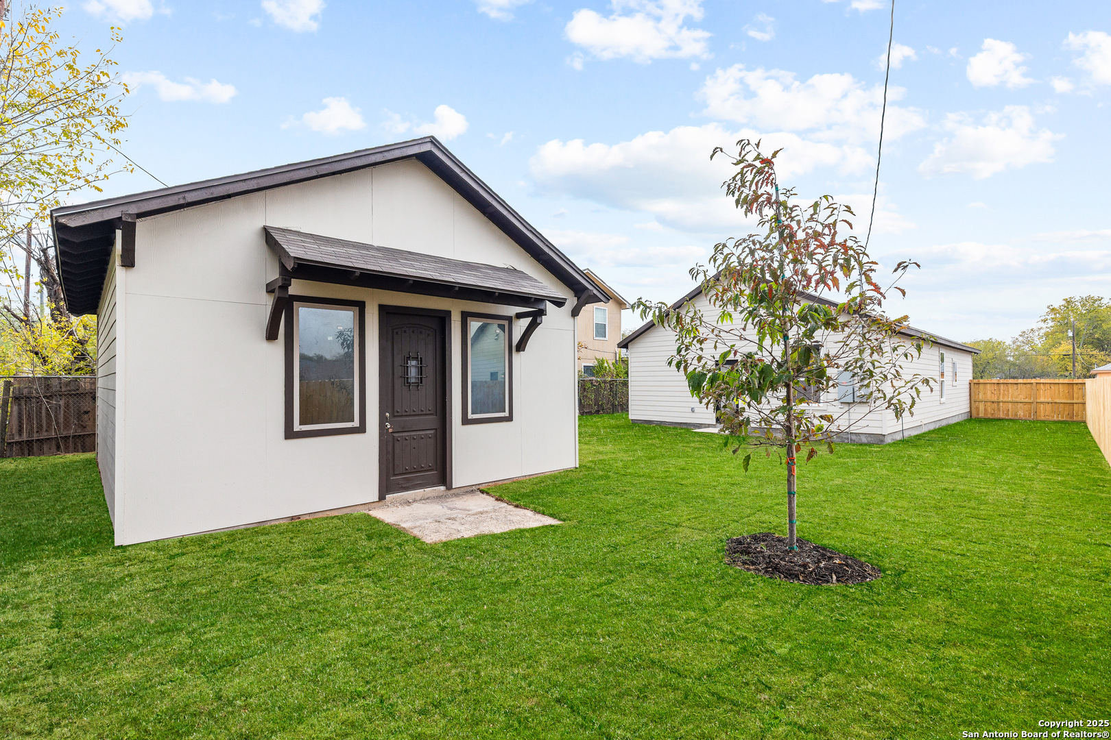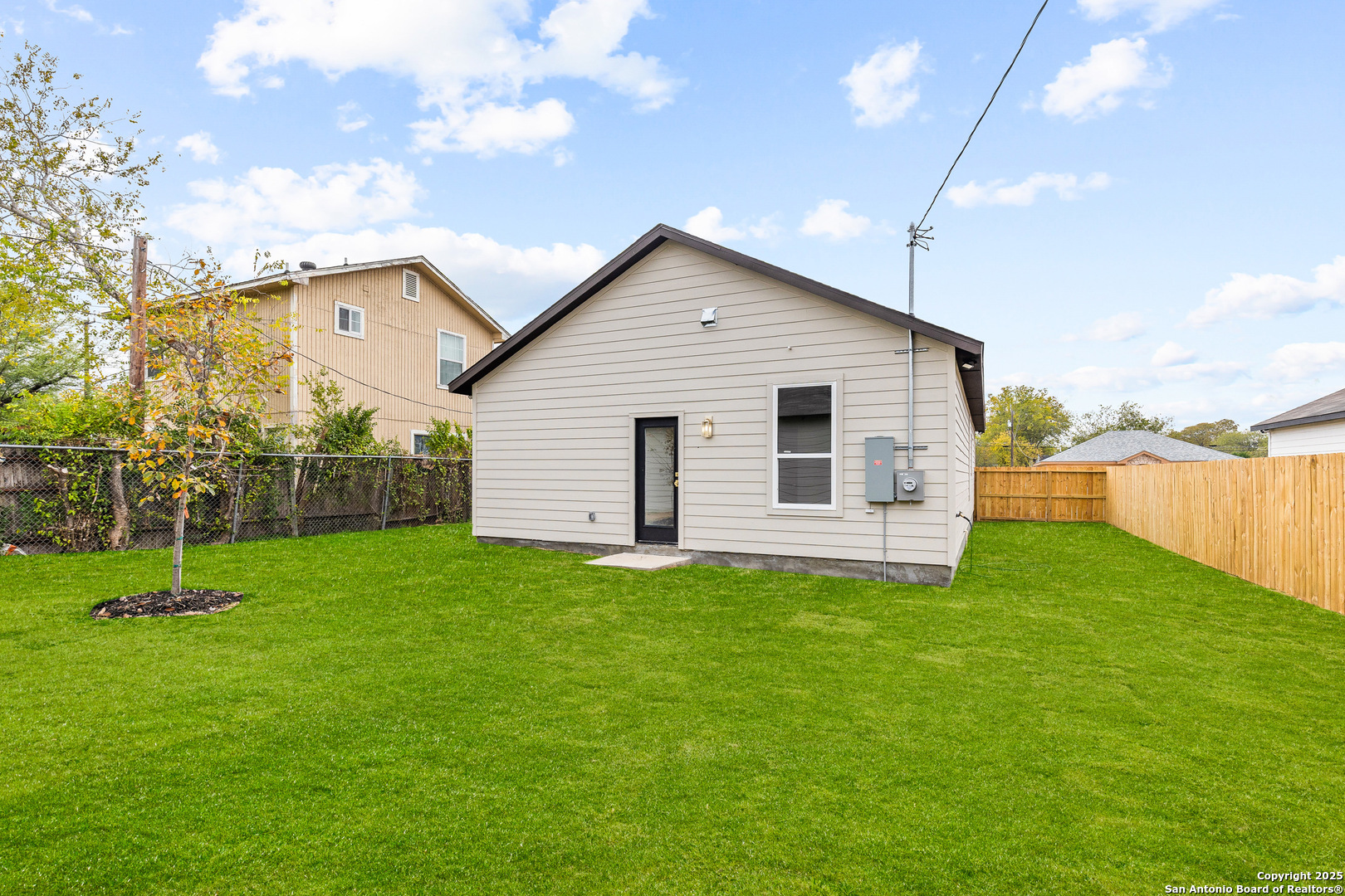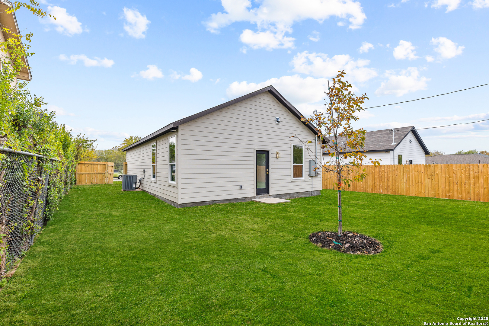 Brand-new construction with modern style and NO HOA! This 3-bedroom, 2-bath home offers 1,300 sq ft of thoughtfully designed living space with a bright, open floor plan and high-end finishes throughout. Enjoy luxury vinyl plank flooring, a statement accent wall with a sleek fireplace, and a seamless flow from the living area into the kitchen. The kitchen features soft-close wood cabinets, quartz countertops, stainless steel appliances, and a large island perfect for everyday living and entertaining. The private primary suite includes a beautifully finished bathroom with quartz countertops, modern fixtures, and designer tile. Outside, you'll love the contemporary curb appeal, covered front entry, fresh sod, and fully fenced yard ideal for pets or outdoor enjoyment. Conveniently located on San Antonio's Southside near major roads, shopping, and dining. Move-in ready, modern, and built to last! Don't miss this opportunity.