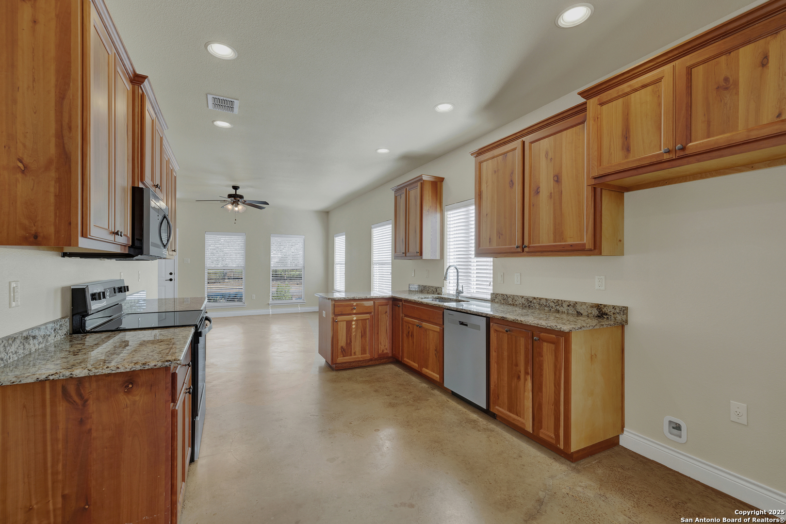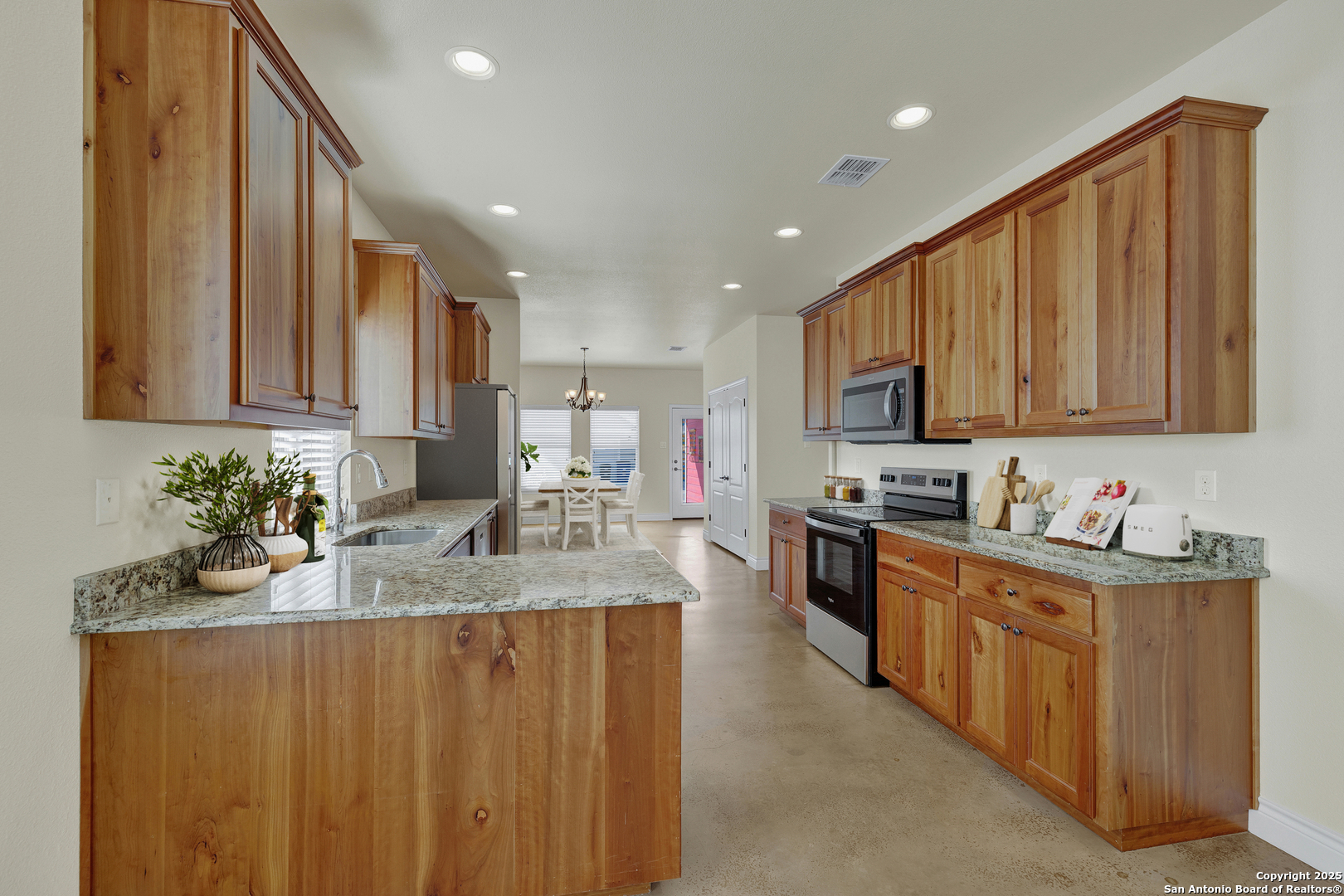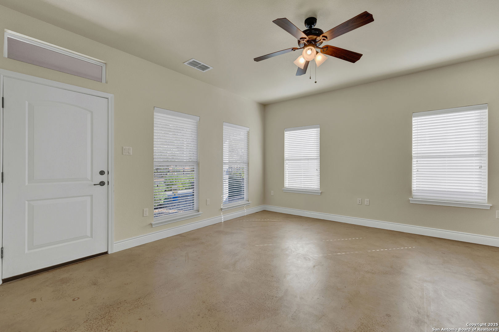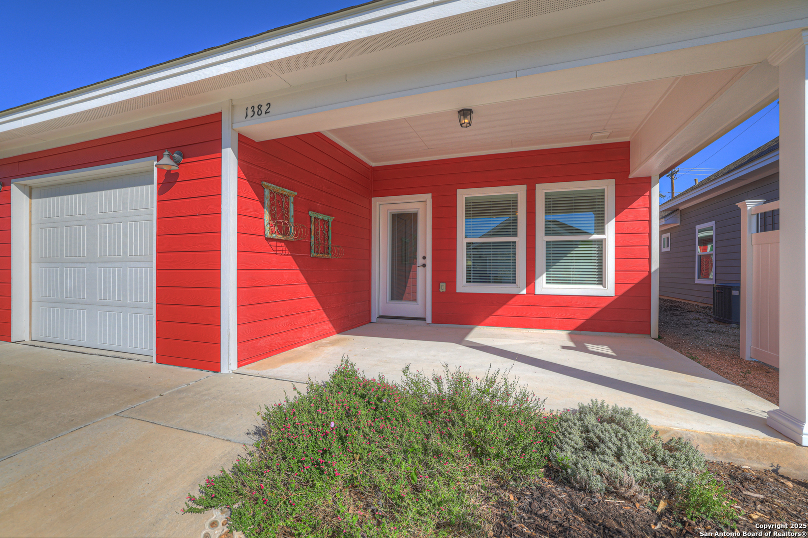Do not miss this 2-bedroom 2-bath home that is close to shops, restaurants, and all that Gruene has to offer. It has easy access to Gruene by golf cart, car, or a short walk. The home has easy access to downtown New Braunfels, 1-35 and Hwy 46/337. The home features a nicely xeroscaped front yard, a one car garage, and a concrete pad for tandem parking. It has beautiful concrete floors, upgraded lighting, and trim molding. The home offers custom-stained cabinets, granite countertops, 2025 stainless steel microwave, oven, and dishwasher. Other upgrades include a walk-in closet, and a bathroom with ample storage and upgraded cabinets. Other features include front 2-inch blinds, tiled walk-in shower, upper cabinets in laundry room, and multiple drawers for easy storage in the kitchen. Enjoy the covered patio, a small green area for a pet, and a great place for a morning coffee or a get-together with friends and family. Come by and take a look!