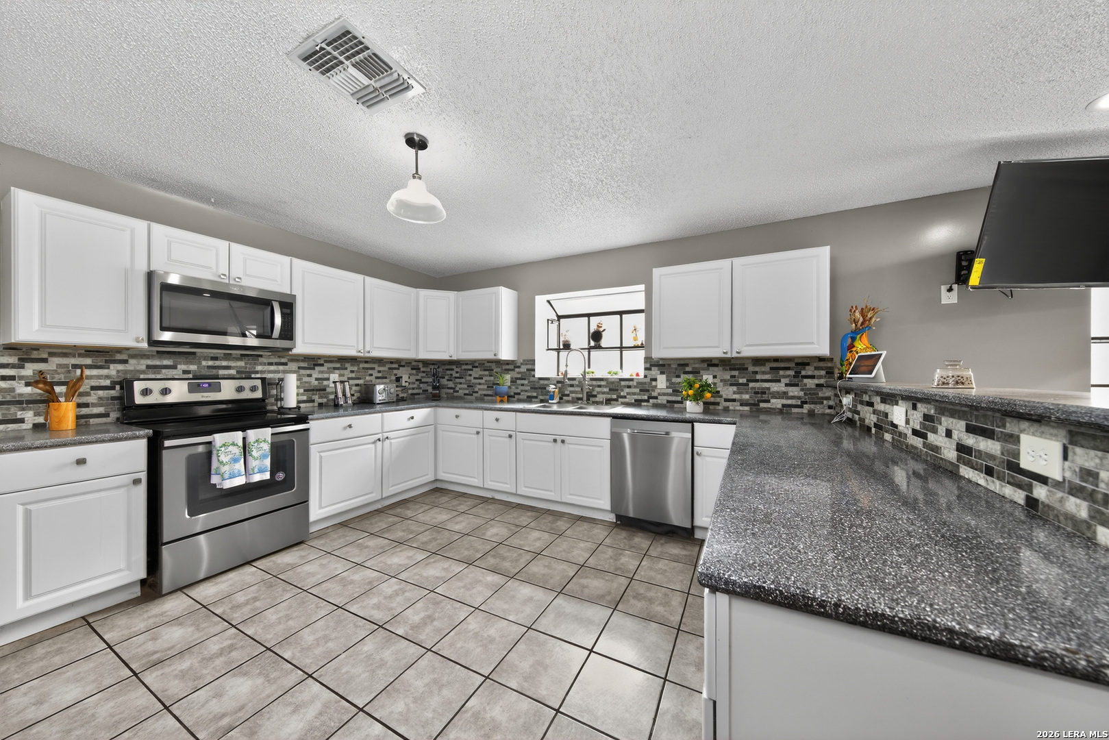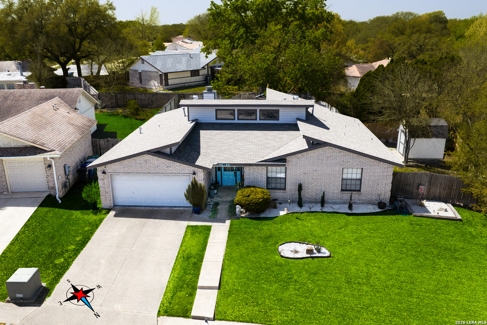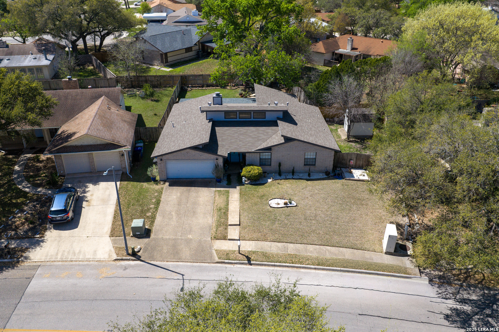 This beautifully updated, single-story home sits in the heart of North Central San Antonio and features thoughtful upgrades, soaring vaulted ceilings and welcomes you home with a bright and spacious feeling from the moment you walk in. The inviting living area is filled with natural light and anchored by a striking floor-to-ceiling stone fireplace. The living space opens to the expansive kitchen with stainless steel appliances, a tiled backsplash, tons of countertop space, and plenty of cabinets for ample storage. Charming garden windows compliment the dine-in breakfast bar and dining area and make for a perfect spot to grow fresh herbs and bring in more natural light. Off the living room, two French glass doors open to a large, dedicated office complete with Smart Alexa lighting and a built-in doggie door that leads to a private dog run, one of the many thoughtful and practical touches throughout the home. On the other wing of the home, the primary suite is a relaxing retreat with an oversized walk-in closet and an updated bathroom featuring a spacious walk-in shower, large soaking tub and modern finishes. The two additional guest bedrooms have easy access to the secondary full bathroom with an updated micro-cement countertop and custom tree trunk epoxy sink that blends character and contemporary design. Durable laminate and tile flooring run throughout the main living spaces and primary bedroom, offering both style and easy maintenance. Back outside, enjoy your oversized lot and backyard oasis designed for year-round enjoyment. The covered patio is fully equipped with electricity, fans, and a TV mount, ideal for entertaining or unwinding. Walk a beautifully landscaped, solar-lit pathway to a custom-designed pergola outfitted with lighting, fans and even built-in speakers, creating a peaceful and perfect outdoor retreat. Additional highlights include a Tuff storage shed & water softener (only 2 years old!), hidden built-in safe, smart Alexa-enabled lighting, motion-sensor hallway lights, custom closet built-ins in a secondary bedroom, and consistent home maintenance including quarterly pest control for added peace of mind. Plus, the location is unbeatable! You're minutes from Hwy 281, Loop 1604, the San Antonio International Airport, and downtown. Daily conveniences like H-E-B, shopping, and dining are right around the corner, and outdoor enthusiasts will love being less than five minutes from McAllister Park, offering nearly 1,000 acres of trails, dog parks, and recreational amenities. If you've been looking for a move-in ready home that offers space, character and thoughtful upgrades, this is the kind of home that checks all the boxes and then some!