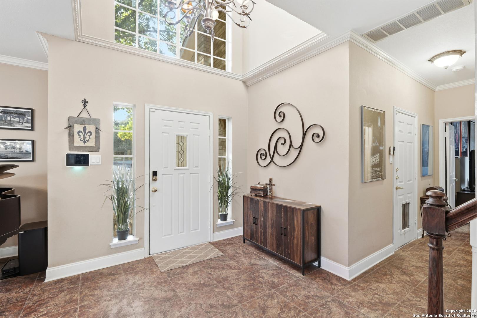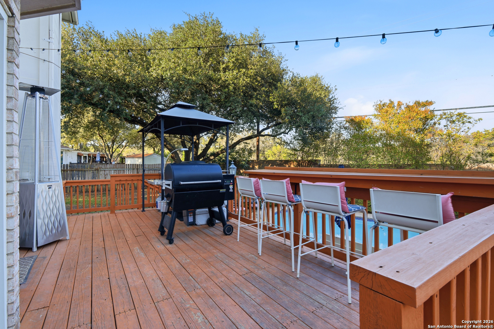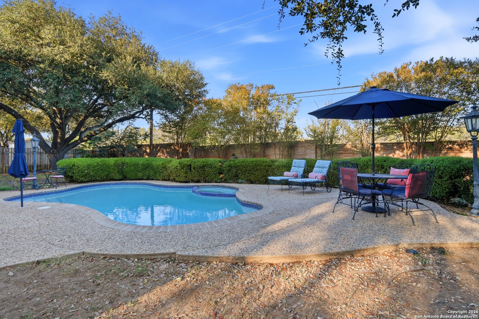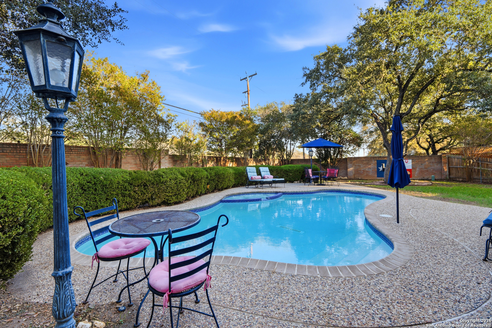 Nestled at the end of a quiet cul-de-sac in Bluffview Heights, this beautifully maintained 5-bedroom, 3-bath residence offers 3,088 square feet of thoughtfully designed living space on an expansive 0.29-acre lot. A soaring, high-ceiling entry welcomes you into the two-story home, where an open and airy floor plan creates an inviting atmosphere throughout. The renovated kitchen shines with quartz countertops, a classic subway tile backsplash, updated hardware, modern lighting, and a newly installed vent hood. It opens seamlessly to a sunny breakfast nook and spacious living area centered around a warm fireplace-ideal for everyday living and entertaining alike. From here, step out onto the oversized deck overlooking the in-ground pool and spa, creating a private outdoor retreat perfect for gatherings or relaxation. The main level also includes a bedroom currently used as a home office and a tastefully updated full bathroom. Upstairs, the generous primary suite is a true escape, featuring dual vanities, a garden tub, a separate walk-in shower with extended glass enclosure, and two walk-in closets. Significant improvements enhance both comfort and peace of mind, including a roof replacement (2016), HVAC system (2017), fresh interior paint and carpeting (2020), siding repairs, lifetime-warranty gutters, and an upgraded electrical panel with generator readiness. Pool updates completed in 2024 include a new pump, plaster finish, and in-pool cleaning jets. Additional touches include updated lighting in multiple living spaces, an outdoor deck bar, upgraded kitchen fixtures, a Vivint security system with five exterior cameras and enhanced floodlighting, and a leased Kinetico water softener. An oversized garage provides abundant room for storage, projects, or extra vehicles. Conveniently located near Hwy 281, Wurzbach Parkway, and a variety of shopping and dining options, this home delivers the perfect balance of location, functionality, and elevated living.