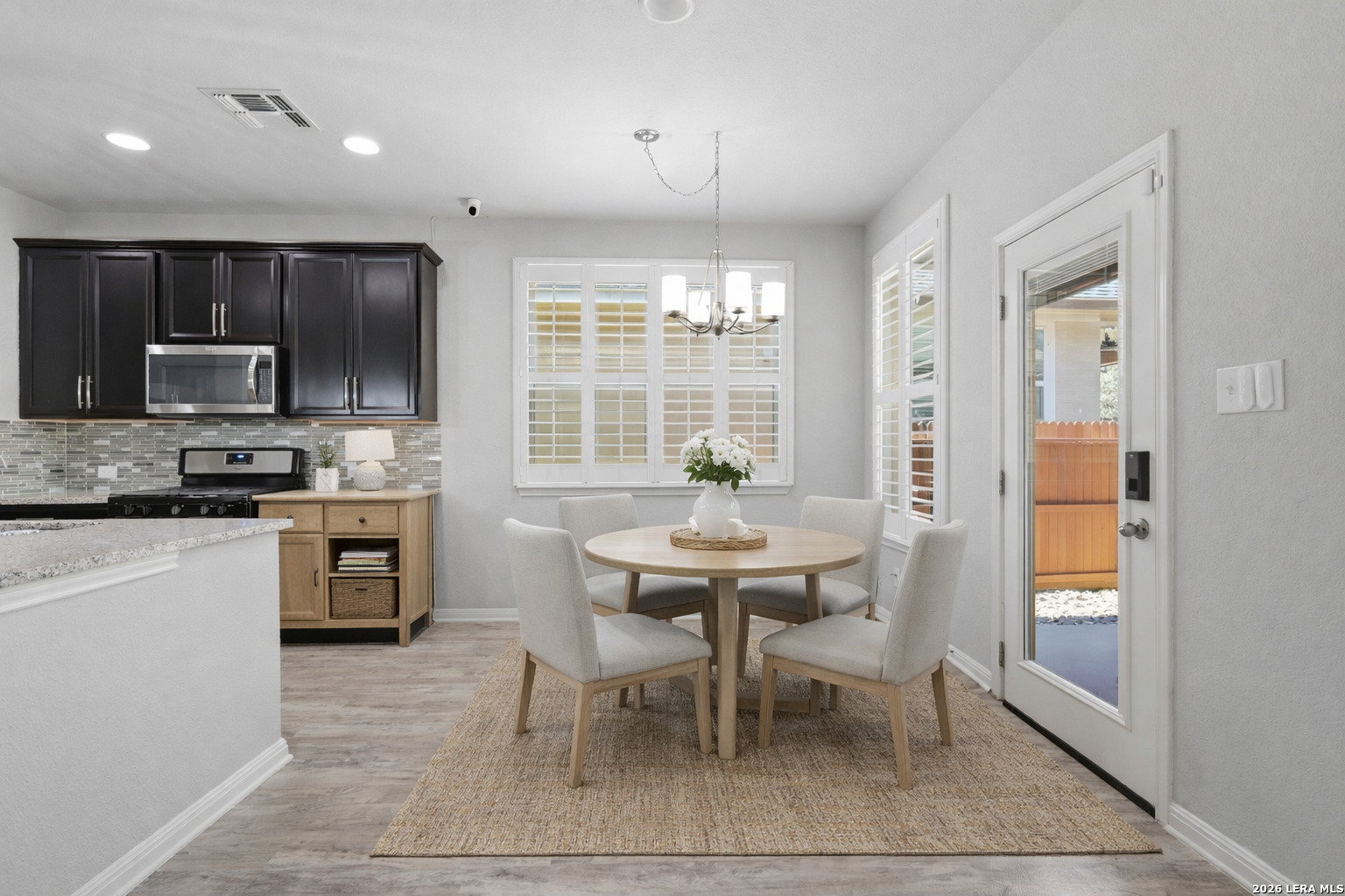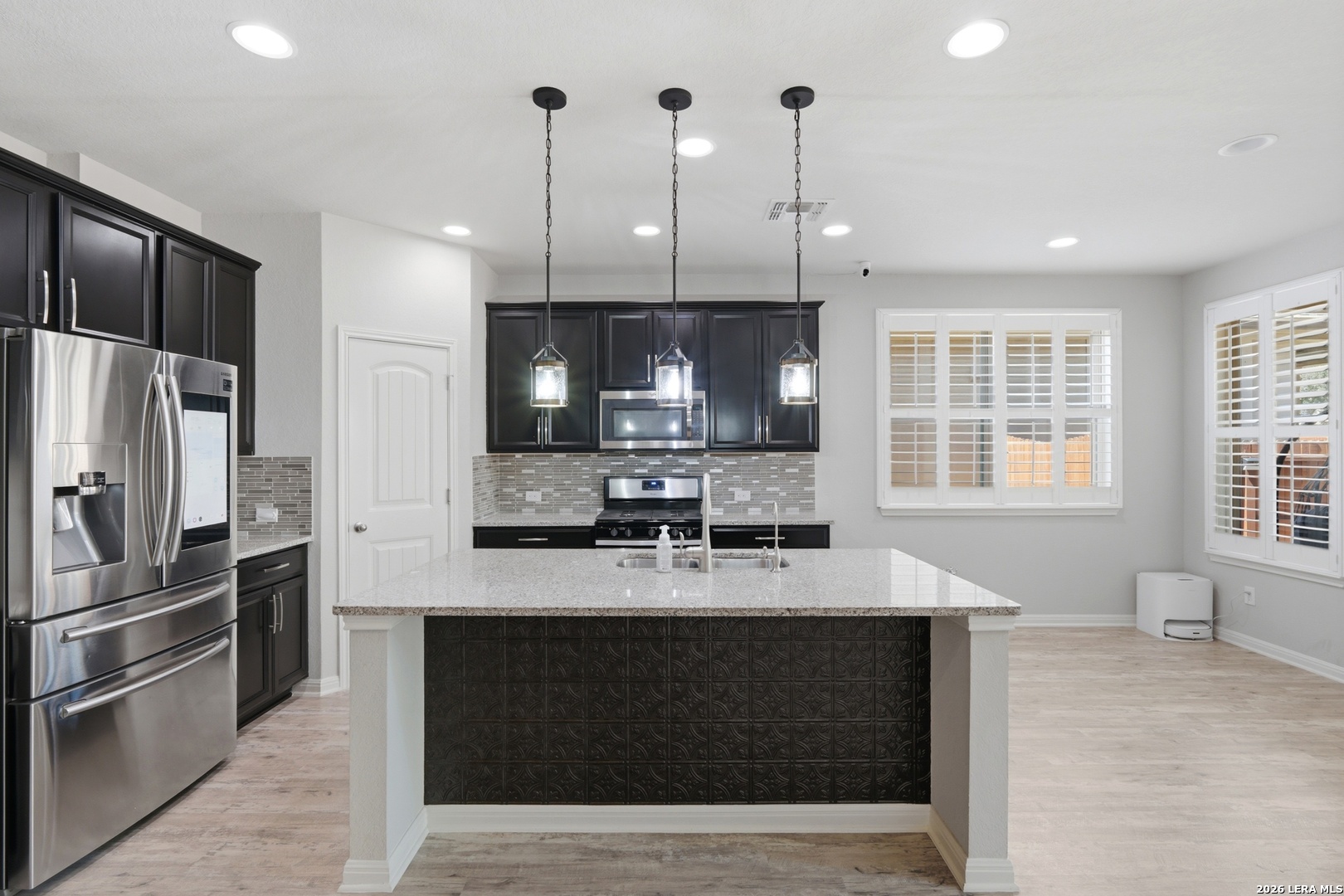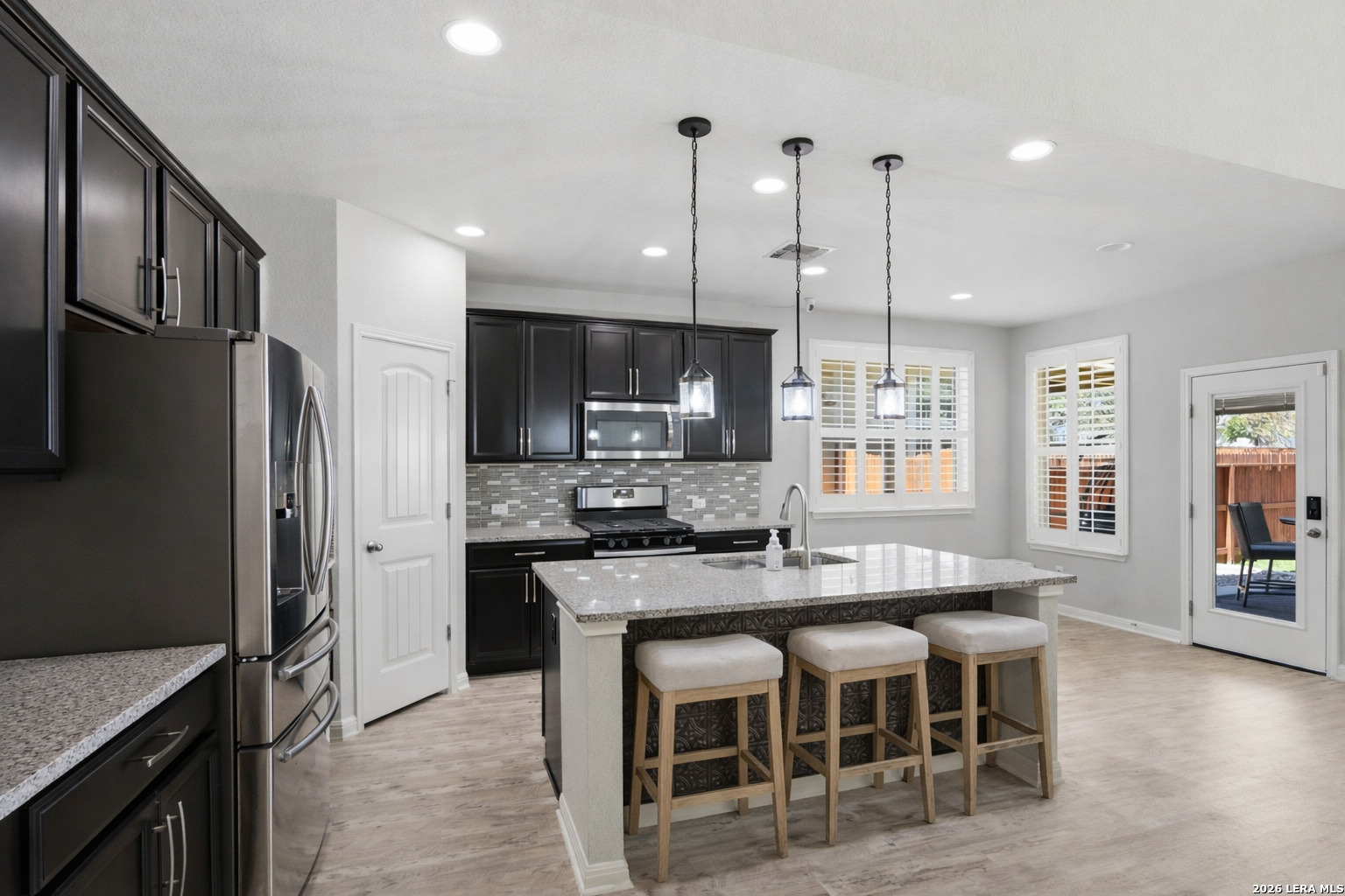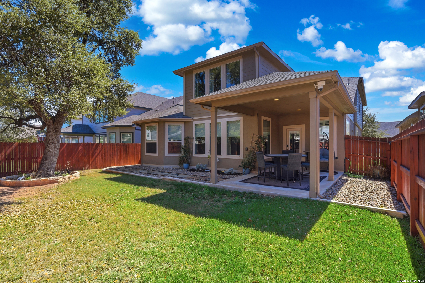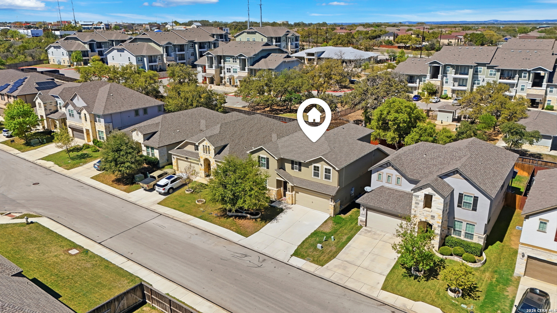 Movie nights will never be the same in this incredible in home theater experience. The upstairs media room is fully equipped with a 110 inch projector screen, 4K projector, in wall surround sound speakers, and a Denon AV receiver supporting Dolby Atmos for true cinematic sound. The setup even includes a concession style station with popcorn machine, drink fridge, and candy display, creating the ultimate space for hosting friends, family, and unforgettable movie nights. Welcome to 13871 Tribeca, a Meritage built home in the Arcadia Ridge community offering 3,226 square feet of thoughtfully designed living space. This two story Craftsman style home features 4 bedrooms, 3 full bathrooms, and a half bath with an open layout and high ceilings that create a bright and inviting feel from the moment you enter. The island kitchen serves as the heart of the home with solid countertops, gas cooking, a walk in pantry, and generous cabinetry, flowing seamlessly into the living and dining areas for everyday living or entertaining. The primary suite is privately located downstairs with a relaxing garden tub, while the main level also includes a study, guest suite, and convenient laundry room. Step outside to enjoy a private backyard retreat with a patio, mature trees, sprinkler system, and privacy fence. The outdoor space is perfect for relaxing or entertaining and includes a patio table with seating for six, a propane fire ring centerpiece, and a zero gravity egg chair for the perfect place to unwind at the end of the day. Located in Arcadia Ridge, residents enjoy access to a community pool, park, and jogging trails within Northside ISD and close proximity to shopping, dining, and major highways.
