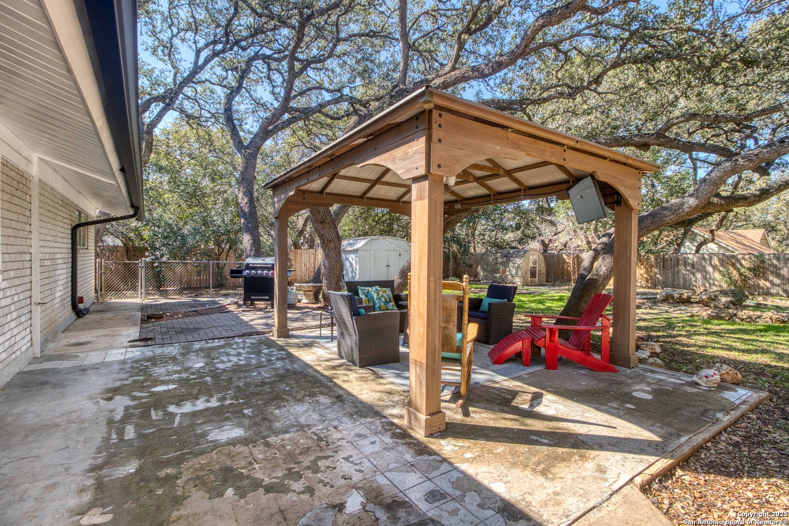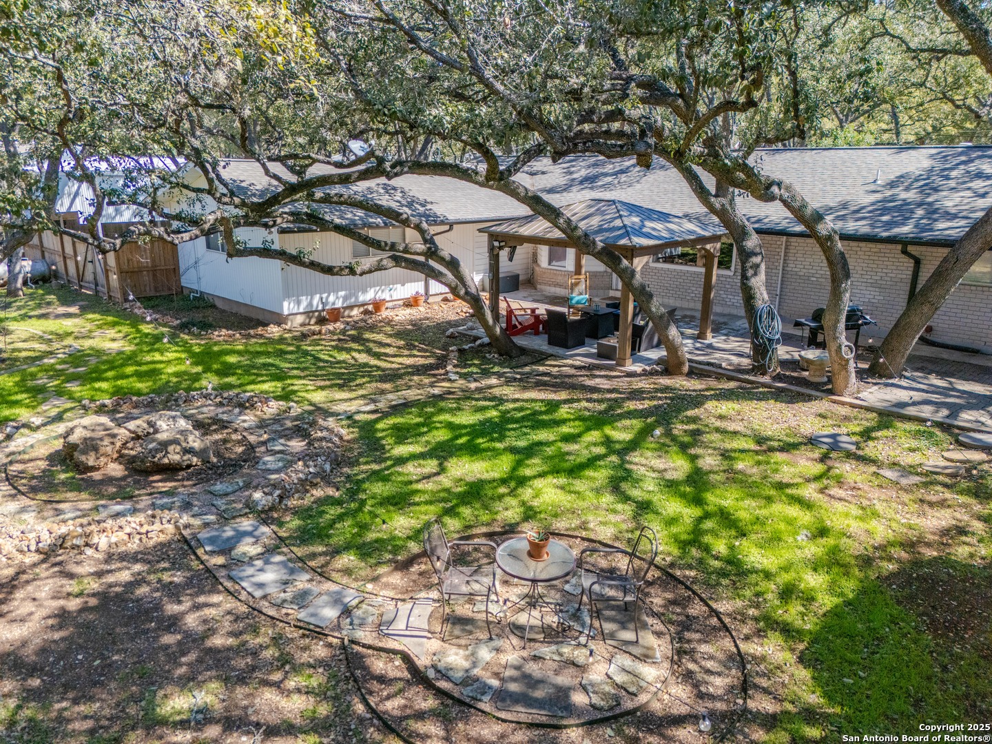 Back on Market with a brand-new septic and irrigation system! This allows for peace of mind that major issues will not occur with this beautifully updated Hollywood Park single-story Gem. This home offers a total of 4 bedrooms and 3 1/2 bathrooms. It empowers modern updates beginning upon entry highlighted by the designer kitchen with top-of-the-line granite, showcase shelving, recent appliances, and custom cabinets. Enjoy the large master suite with a spa-like bath featuring a walk-in shower and separate luxury tub. Dual masters within the split floor plan offer multiple layout options and allows those working from home to separate from the main living area for privacy. An open concept between the kitchen, breakfast area, dining and family room. Enjoy the Fall evenings under the lighted and cooled erected gazebo while enjoying the mature trees shading most of the yard. It is ready for you to make it your home just before the Holidays! --