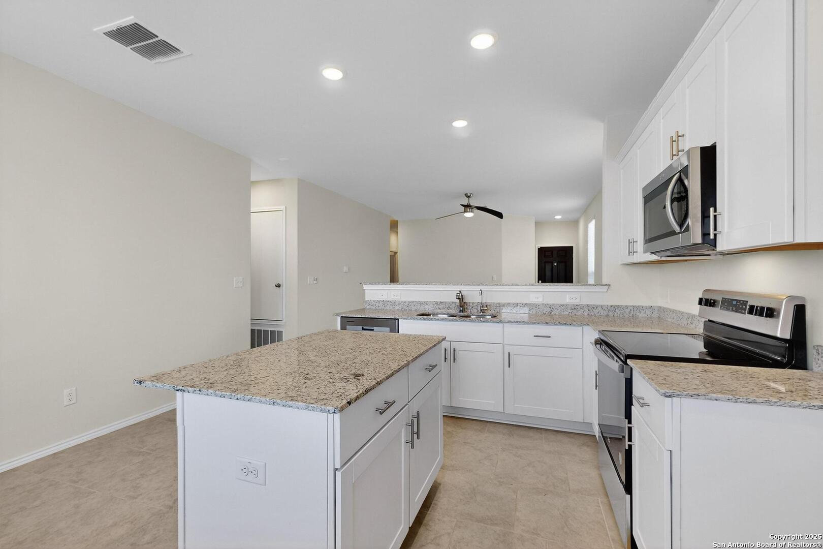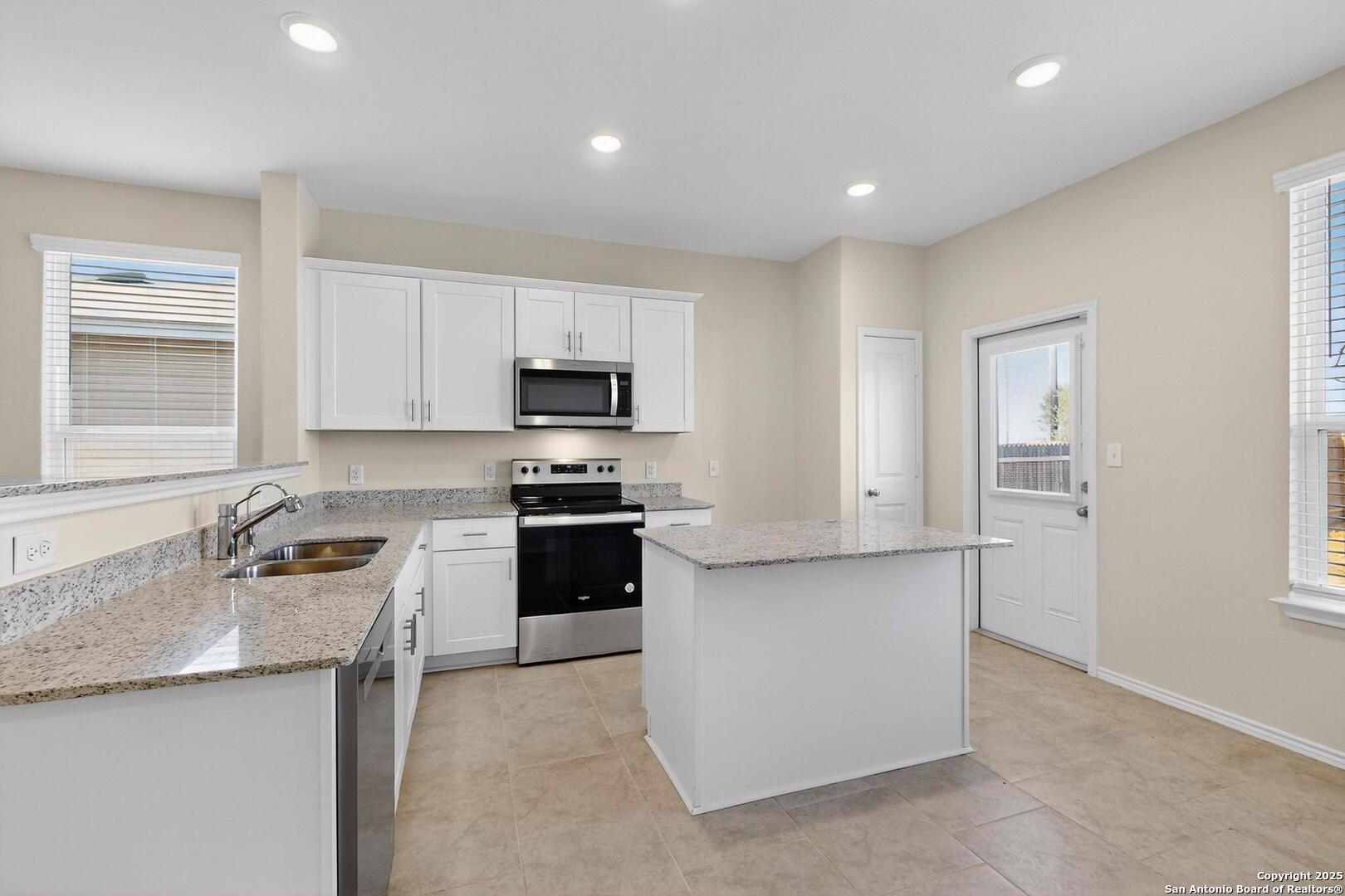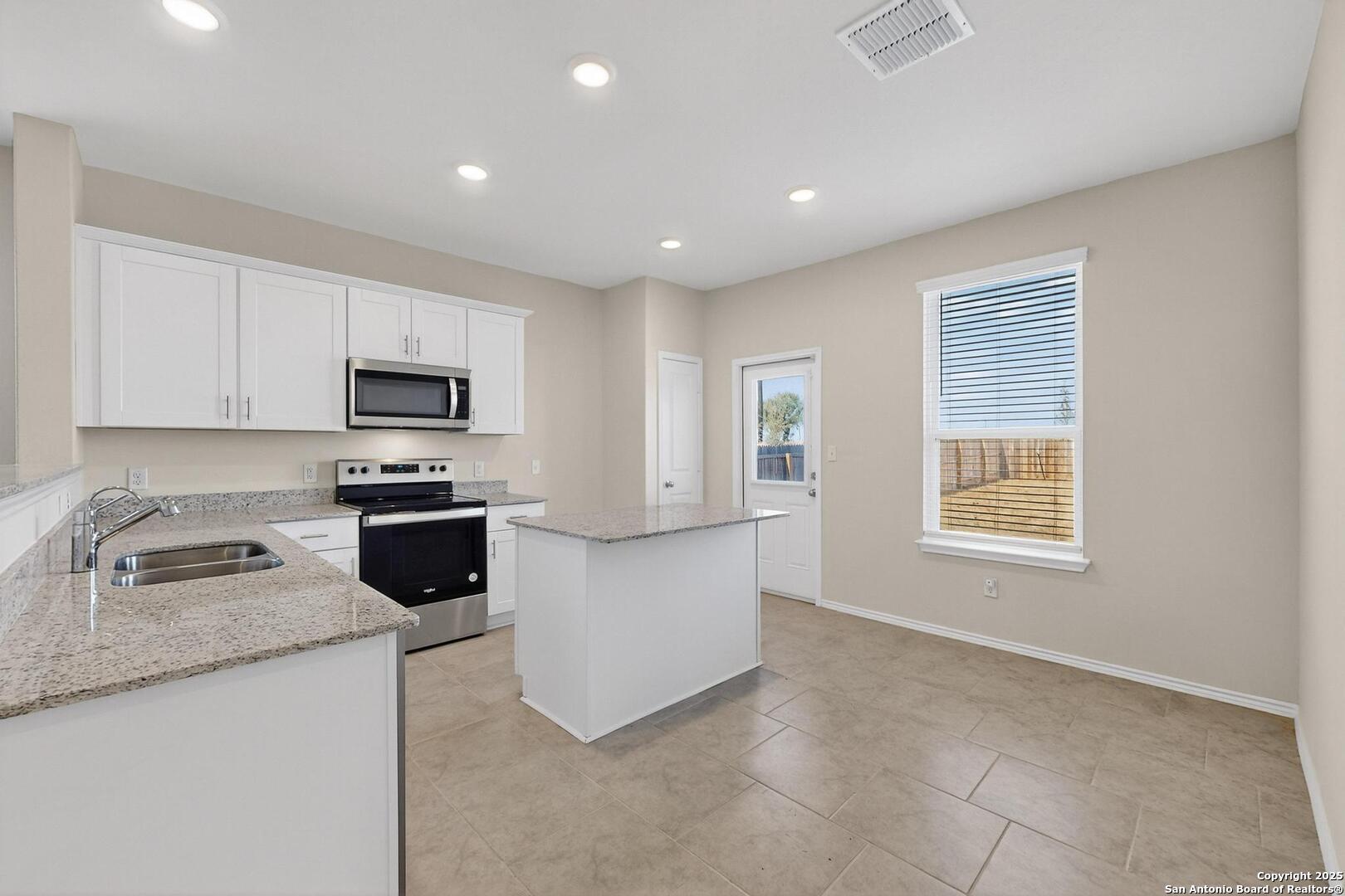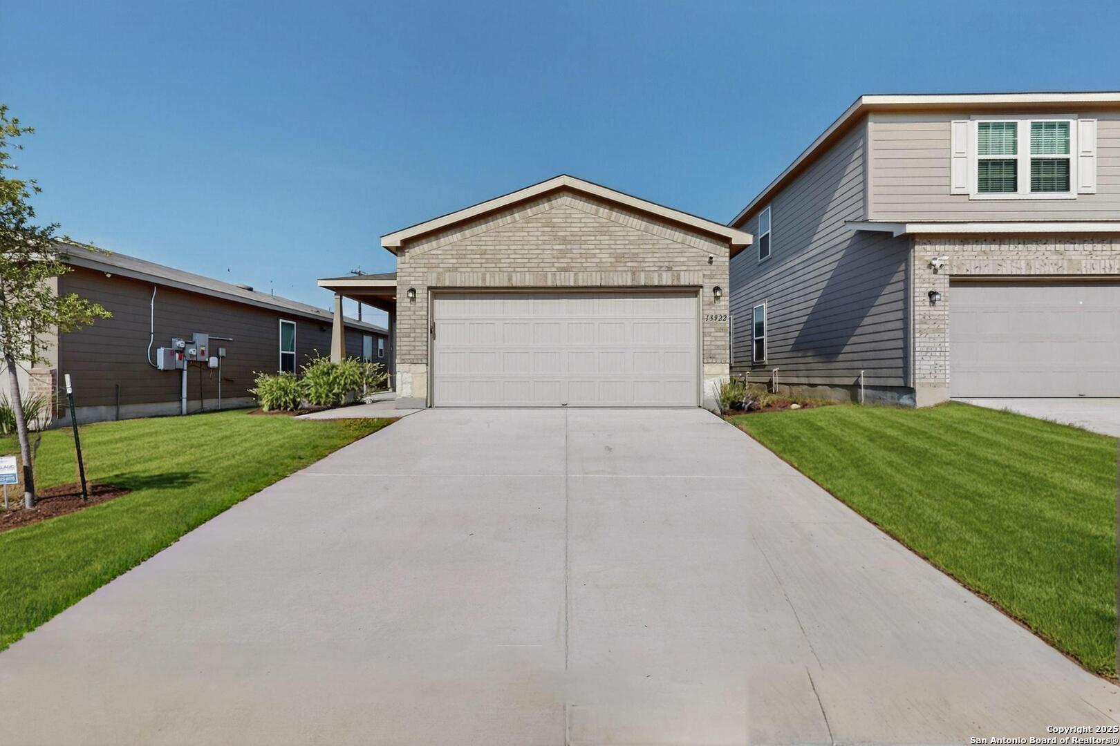 Move in Ready single story, with brick elevation and welcoming front porch. Open floorplan with nine foot ceilings, with an open kitchen. Kitchen features an island, granite countertops, stainless steel appliances and 36" kitchen cabinets. Ceramic tile in main living areas and carpet in the bedrooms. Primary Bedroom has full bath with walk in shower. Exterior has no backyard neighbors and good sized backyard. Located just minutes from Lackland AFB, SeaWorld, shopping, dining, and more. This home has it all-plus a excellent price that makes it one of the best deals in the area! Schedule your showing today before it's gone!