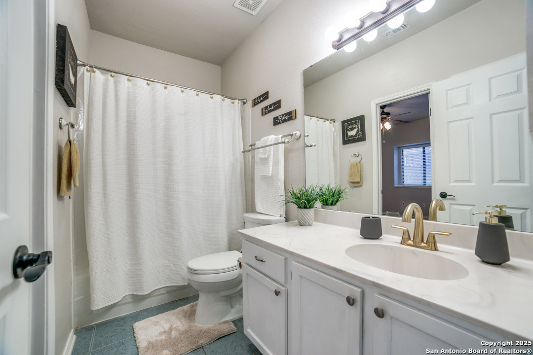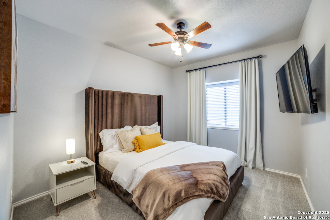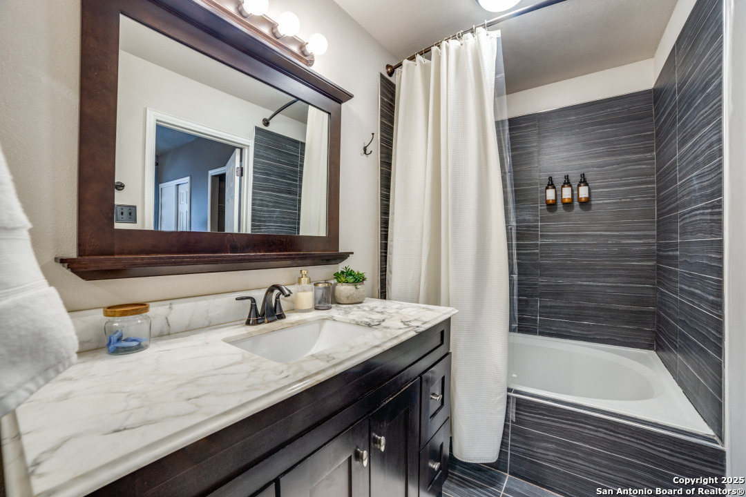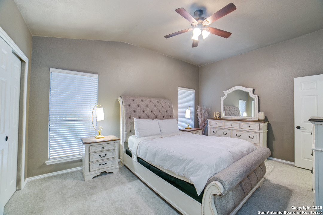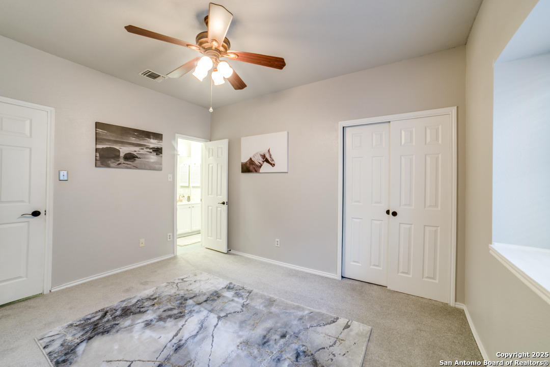 Prime location of San Antonio! Right off NW Military Highway and Salado Creek Trail. Highly sought after schools and lots of amenities close by including shopping and dining. Beautiful well kept one story, 3 bedroom, 2 bath home with a 2 car garage. Unique floor plan, with high ceilings throughout, two secondary bedrooms, one with an access door to a full bathroom. The spacious master bedroom was painted a dark grey for a deeper sleep on the weekends and the master bath has upgraded tile throughout with a tub/shower garden tub combo, oil rubbed bronze fixtures, a single vanity and a separate door to the toilet. Carpets replaced 2021, roof replaced 2022 and HVAC recently serviced. Four extra parking spaces with an elongated driveway! spacious 2 car garage as well. Pets are negotiable. Schedule your showing today!
