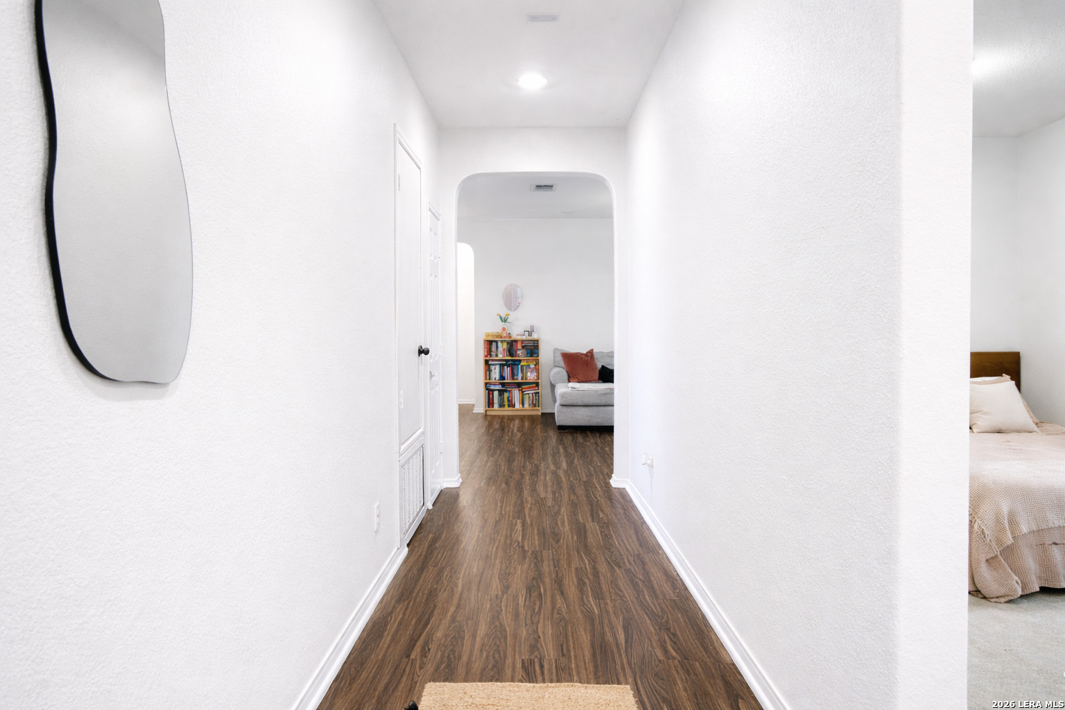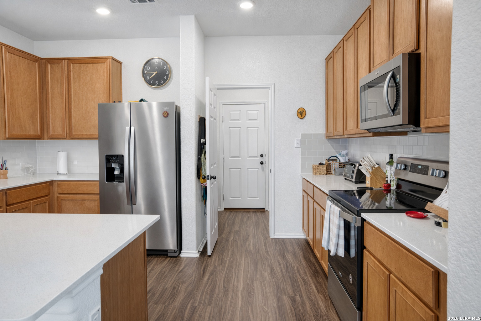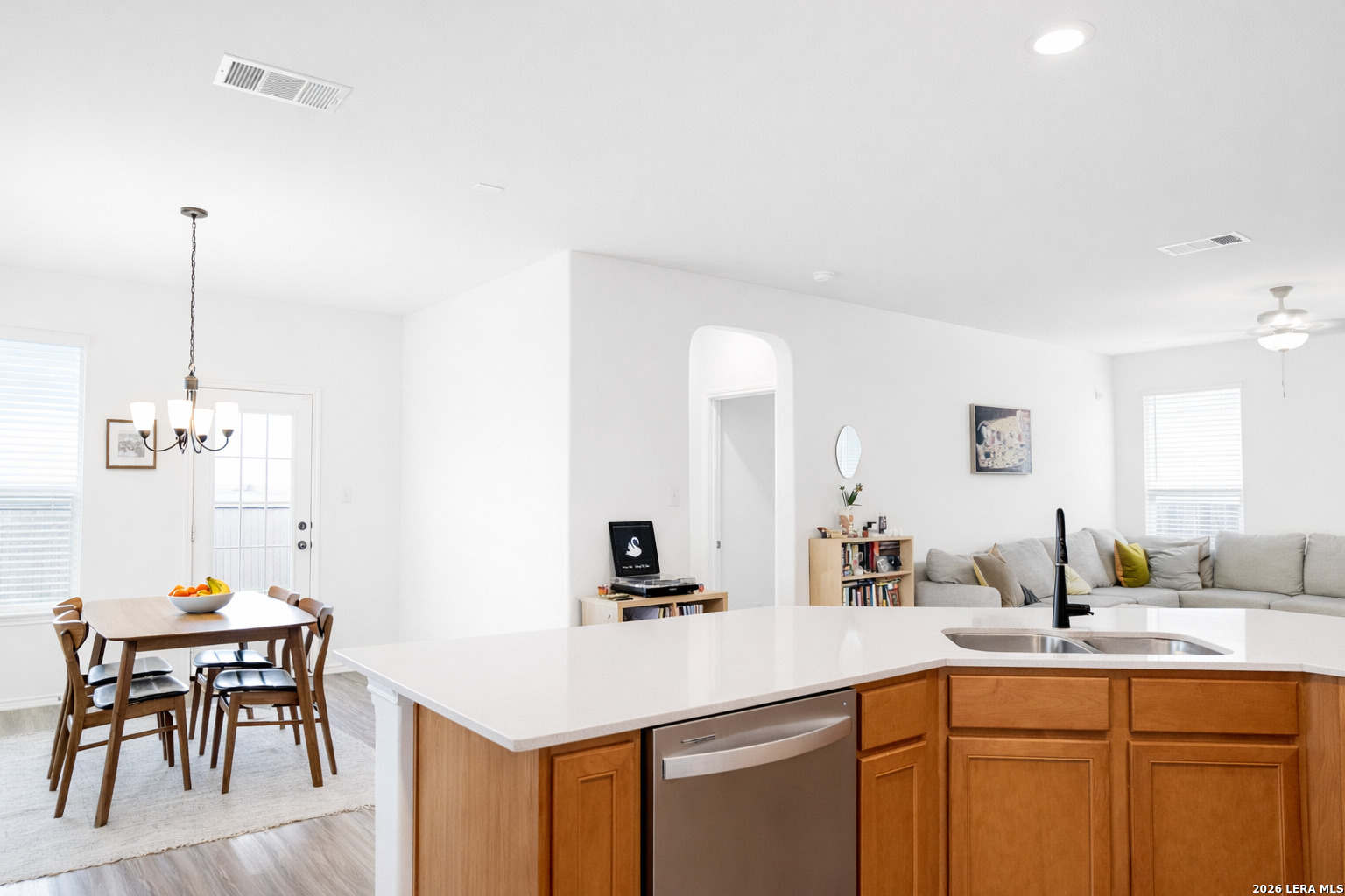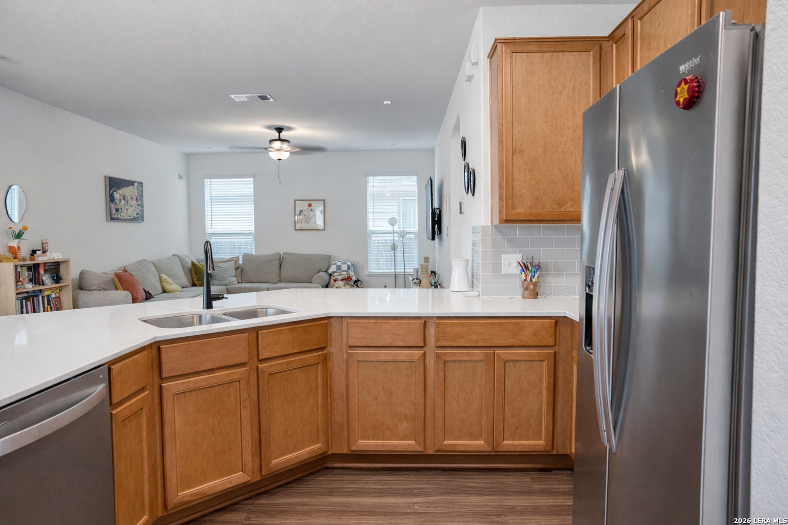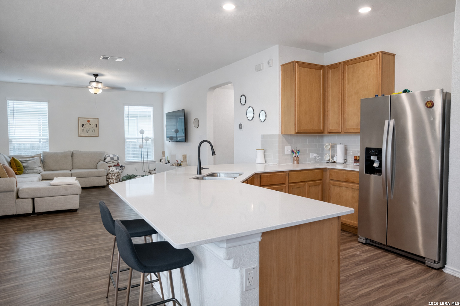Welcome to this beautifully maintained home offering standout curb appeal with a covered front porch and elegant stone and brick accents. Inside, you're greeted by a light-filled open-concept layout that effortlessly connects the living, dining, and kitchen spaces-ideal for both everyday living and entertaining. The kitchen features warm oak cabinetry, generous counter space, and a functional layout designed for ease and style. The spacious, well-appointed bedrooms invites flexibility for guests, a home office, or additional living space. Bathrooms are finished with sleek, modern touches, creating a clean and warm atmosphere throughout. A versatile garage space adds even more functionality, ideal for storage, a home gym, or workspace. Thoughtful details like a walk-in closet and dedicated laundry/pantry area add everyday convenience. The backyard offers a true retreat, complete with a fire pit and hammock area-perfect for relaxing or hosting. Enjoy enhanced privacy with a solid cement back fence and no rear neighbors, giving you a peaceful, secluded setting. Ideally located less than a mile from an upcoming shopping and entertainment development, this home also offers walking distance to neighborhood amenities including a park/playground, walking trails, basketball court and pavilion-adding to the lifestyle appeal. Combined with comfort, style, privacy and location- this home is ready for its next owner to enjoy.