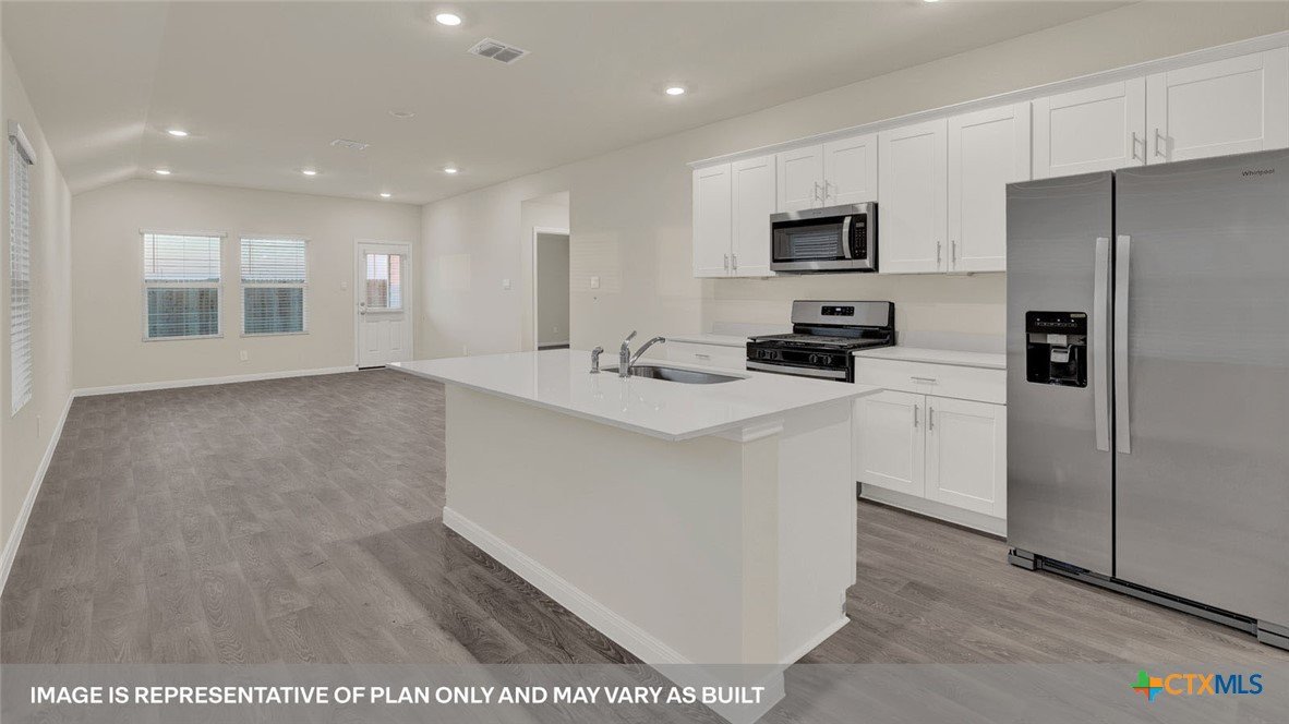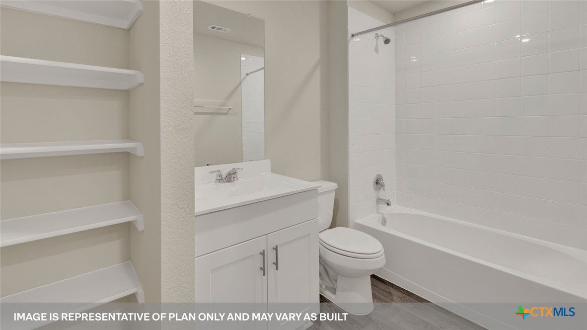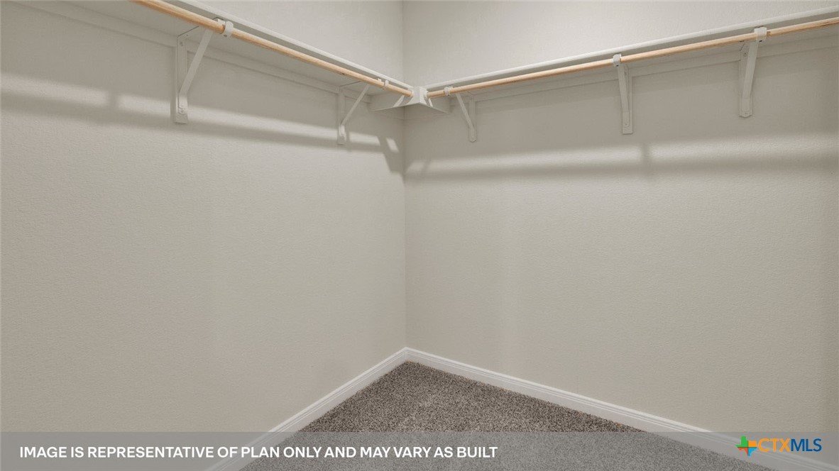 JANUARY ESTIMATED COMPLETION. Check out the Caroline, one of our one story new homes available at Whisper South in San Marcos, Texas. This 3 bedroom, 2 bathroom home includes a 2 car garage all within 1,489 square feet of comfortable living space. Our homes in Whisper South feature three-sided masonry exteriors and the Caroline plan is available with 2 exterior options to choose from. From the covered front porch, step inside the home and cross through the foyer and long hallway. The utility room is tucked away off the hall and connects to the garage, making it a perfect mud room. The heart of the home is the open concept living space. The kitchen, dining and family room flow seamlessly into the other, making this space perfect for creating lasting memories. The kitchen features quartz countertops, an island with undermount sink, stainless steel appliances, pantry closet, and 36” upper cabinets. Enjoy the natural light from the side and rear windows plus the 8’ to 9’ sloped ceilings in this comfortable room. The primary bedroom is located off the family room and includes an attached bathroom. Start your mornings off right in the private space that includes a walk-in shower, double vanity with marble counter tops, private door to the toilet area, and a walk-in closet. The secondary bedrooms and bathroom are tucked away off the kitchen. Each secondary bedroom includes a closet with wood shelving and the hall bathroom includes a shower/tub combination. The Caroline includes vinyl flooring throughout the common areas of the home, and carpet in the bedrooms. All our new homes feature a covered back patio, full sod, irrigation system in the front and back yard, and a 6’ privacy fence around the back yard. This home includes our America’s Smart Home base package, which includes the Amazon Echo Pop, Front Doorbell, Front Door Deadbolt Lock, Home Hub, Thermostat, and Deako® Smart Switches.