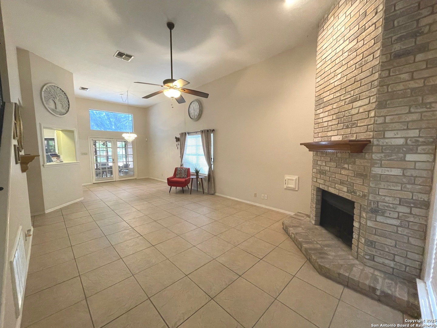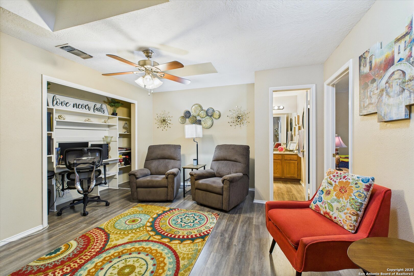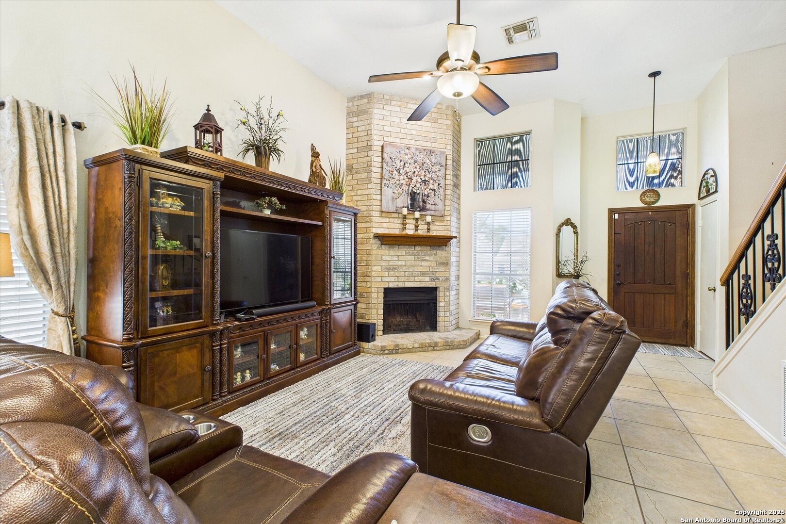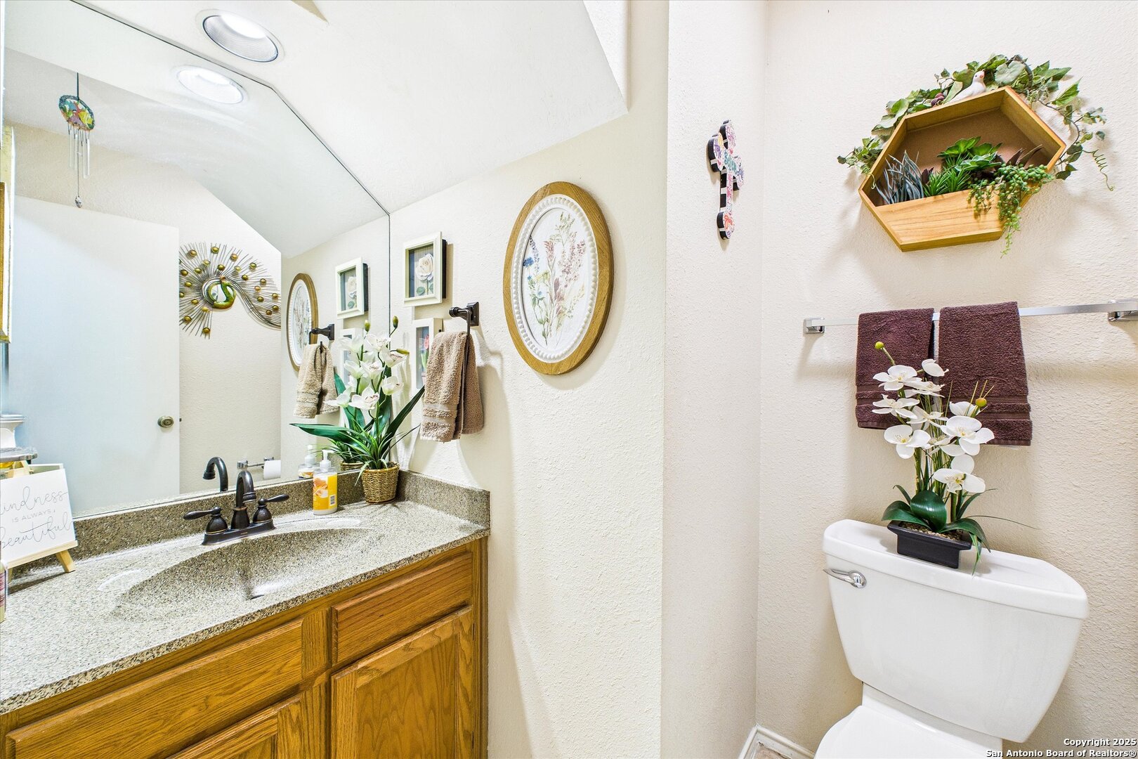 Exceptionally maintained 3 bed, 2.5 bath, two-story home with Primary Bedroom Downstairs located in Northern Hills Golf Course community. LOADED with updates: Roof 2022, A/C replaced 4/21, Rain gutters added in 2019, Luxury Vinyl Plank flooring 2019, New blinds in the bedrooms, and 3 new toilets! Convenient to Loop 1604, Hwy 281, I-35 and Wurzbach Pkwy. North East ISD schools. Enjoy the custom landscaped, low-maintenance backyard. Enclosed patio is perfect for a peaceful retreat for your morning coffee, or a bustling playroom/craft room/home-schooling area. The home features an open floor plan with 12' high ceilings, lots of natural light and NO carpet!! Gas or wood burning fireplace in the living room. Bright & cheery kitchen with breakfast area, granite countertops, new microwave, and 2 yr old stove! Stainless steel French door fridge stays! Primary bath has a step-in shower! Upstairs you will find a loft with built-in office space, two secondary bedrooms, and a full bath. Additional features: attached 2-car garage, solar screens and security system (owned). HVAC serviced regularly, and it has a 10-yr transferable warranty from the install date!. Voluntary HOA. Walk across the street to the golf course! Being a public golf course...after the last pairing goes through (after 8 PM) residents can walk or use the fairway for personal use- lots of people play ball or walk their dogs. (The signature green =12th Hole is right there across the street from the home).