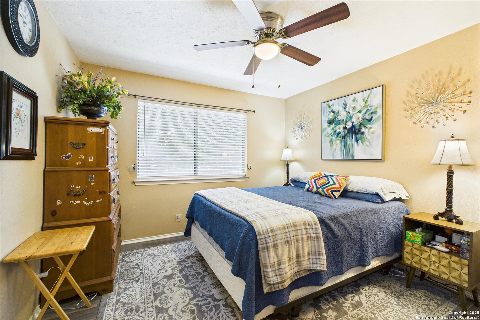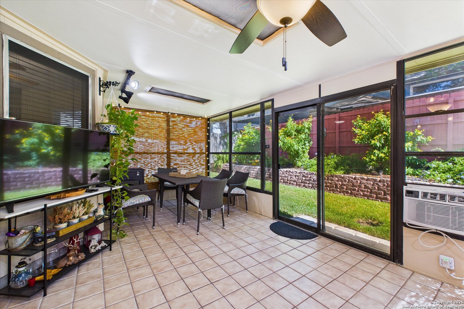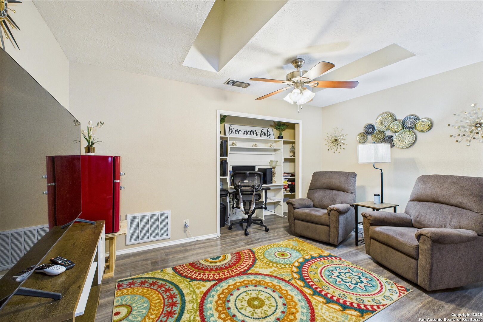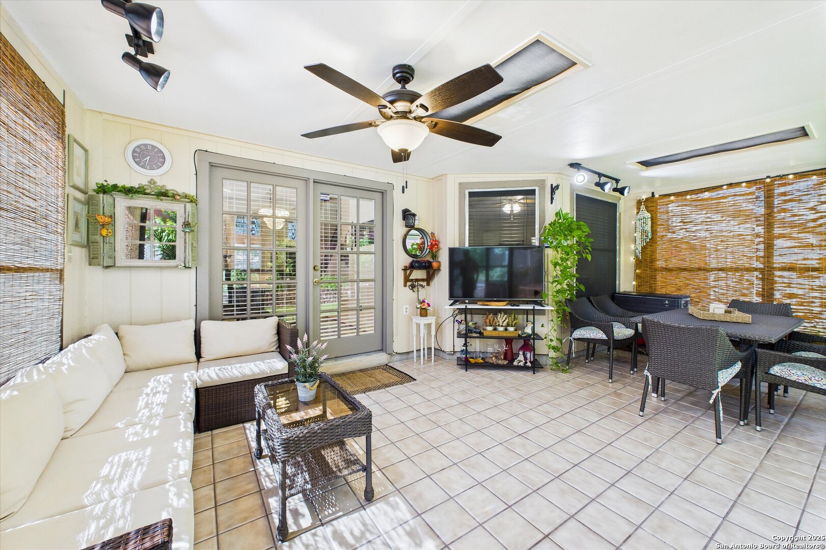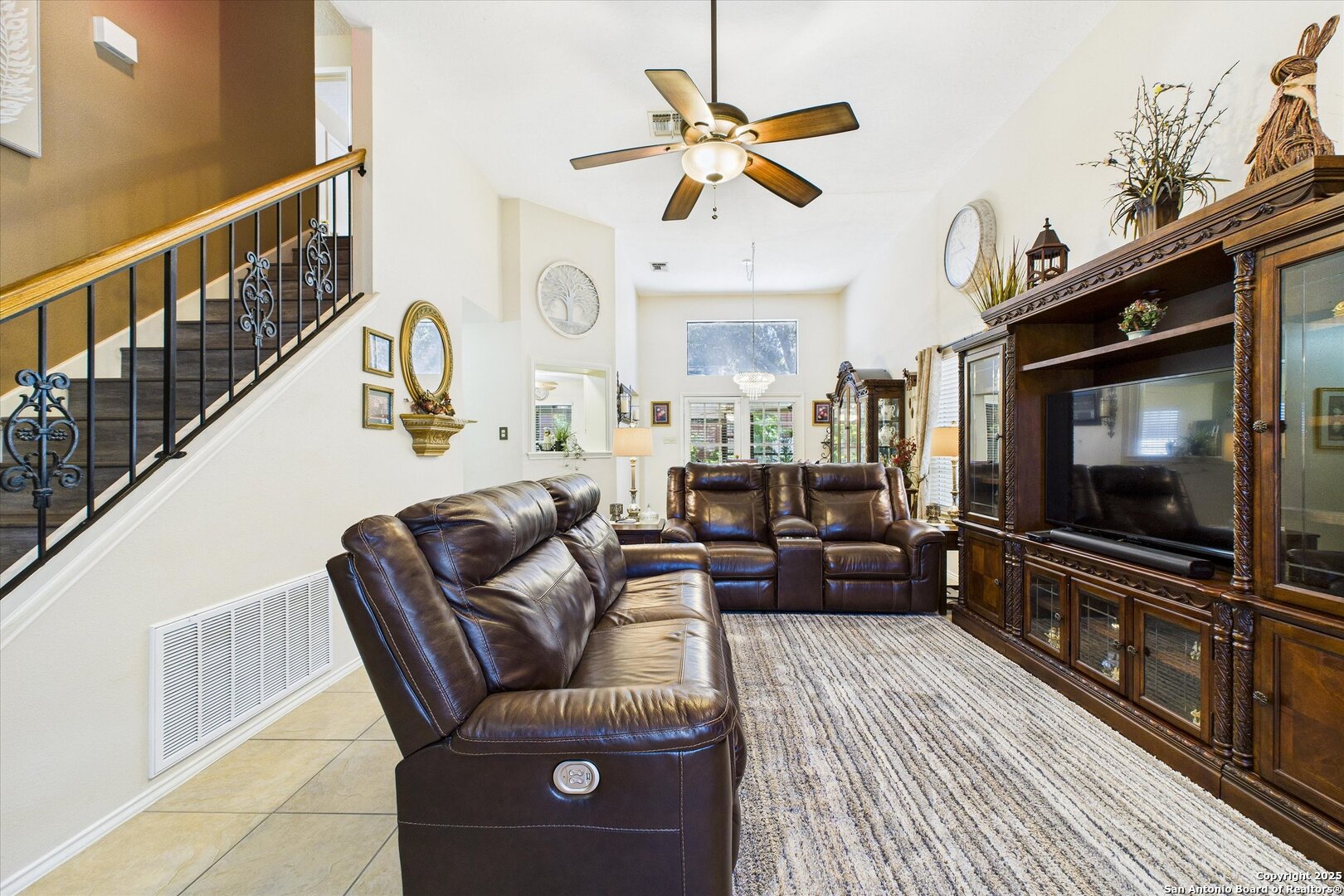 Exceptionally maintained 3 bed, 2.5 bath, two-story home with Primary Bedroom Downstairs located in Northern Hills Golf Course community. LOADED with updates: Roof 2022, A/C replaced 4/21, Rain gutters added in 2019, Luxury Vinyl Plank flooring 2019, New blinds in the bedrooms, and 3 new toilets! Convenient to Loop 1604, Hwy 281, I-35 and Wurzbach Pkwy. North East ISD schools. Enjoy the custom landscaped, low-maintenance backyard. Enclosed patio is perfect for a peaceful retreat for your morning coffee, or a bustling playroom/craft room/home-schooling area. The home features an open floor plan with 12' high ceilings, lots of natural light and NO carpet!! Gas or wood burning fireplace in the living room. Bright & cheery kitchen with breakfast area, granite countertops, new microwave, and 2 yr old stove! Stainless steel French door fridge stays! Primary bath has a step-in shower! Upstairs you will find a loft with built-in office space, two secondary bedrooms, and a full bath. Additional features: attached 2-car garage, solar screens and security system (owned). HVAC serviced regularly, and it has a 10-yr transferable warranty from the install date!. Voluntary HOA. Walk across the street to the golf course! Being a public golf course...after the last pairing goes through (after 8 PM) residents can walk or use the fairway for personal use- lots of people play ball or walk their dogs. (The signature green =12th Hole is right there across the street from the home).