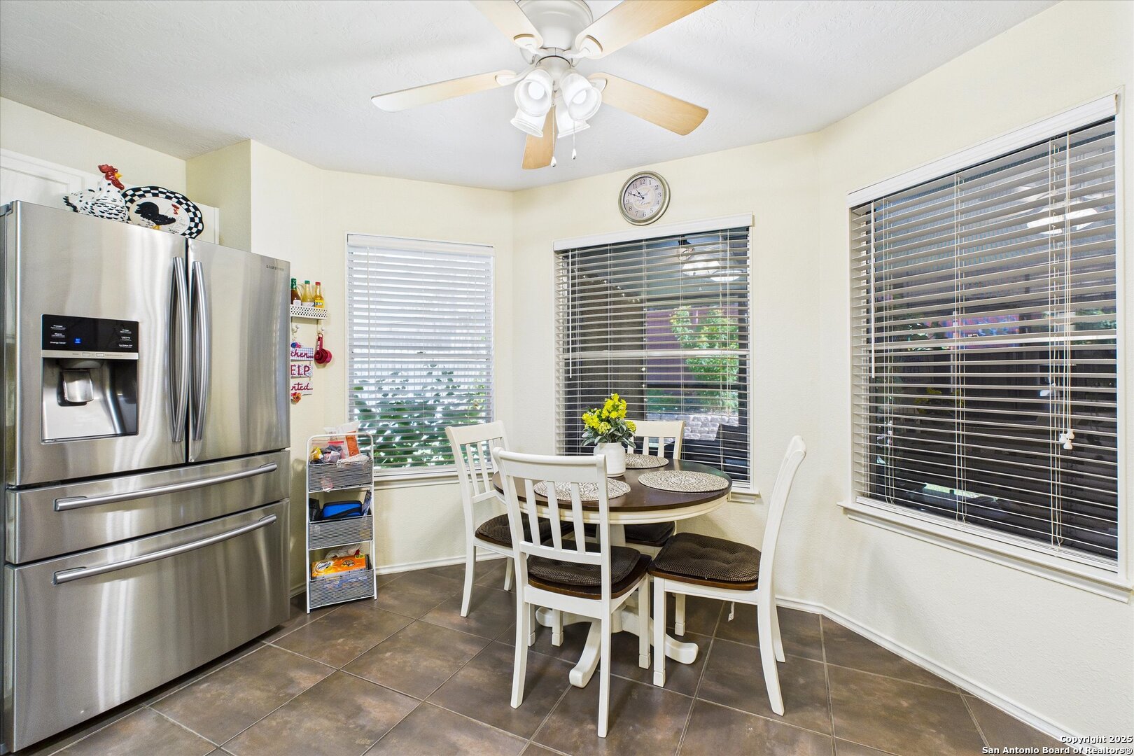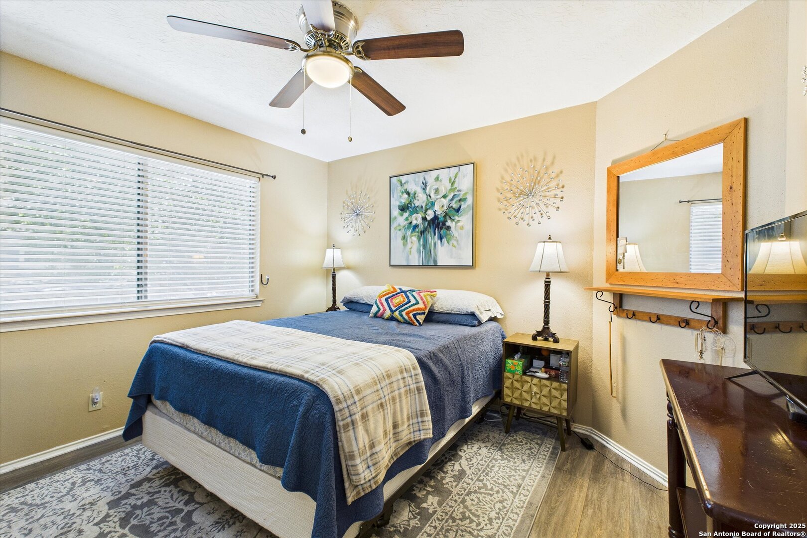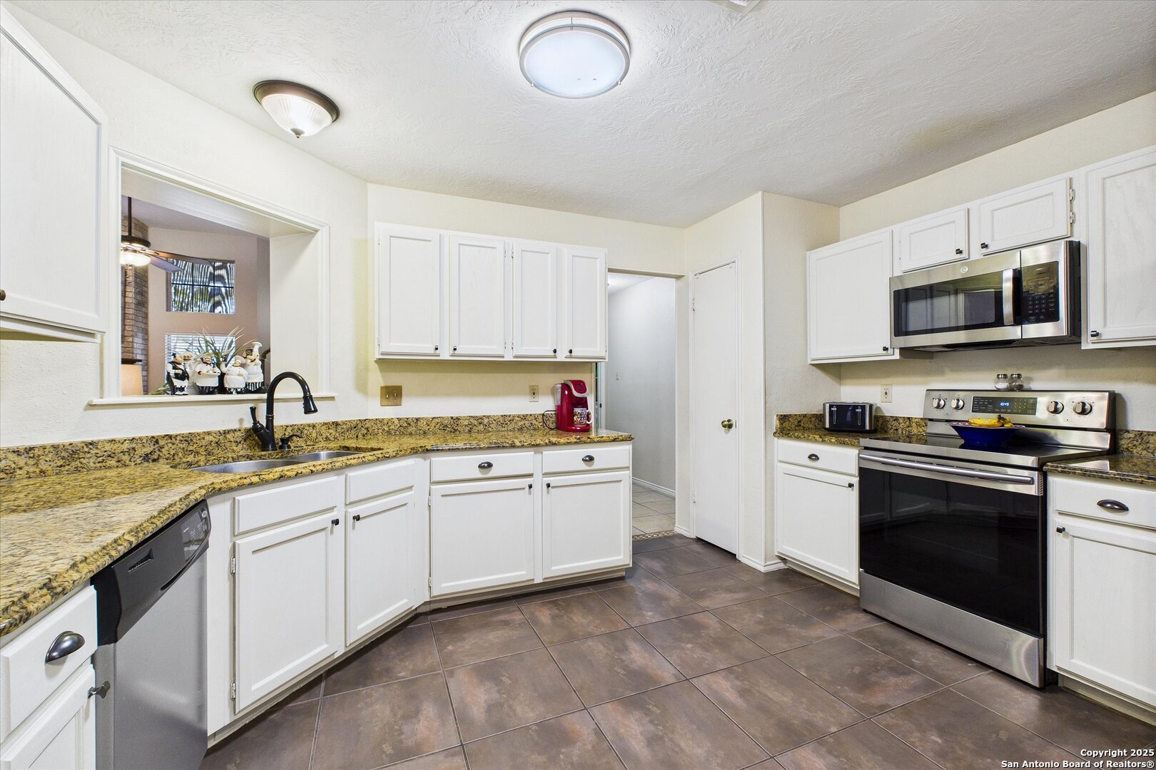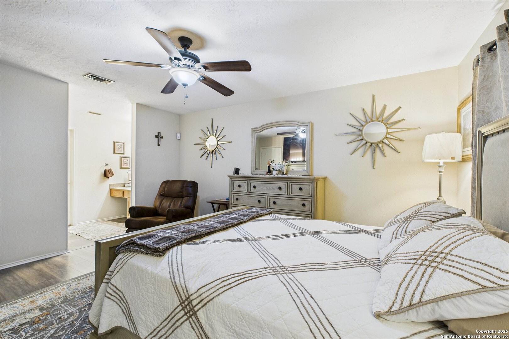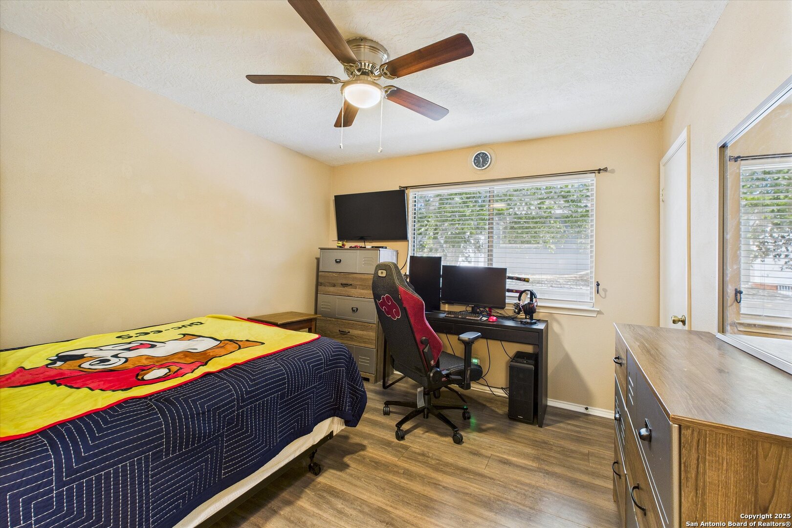 Exceptionally maintained 3 bed, 2.5 bath, two-story home with Primary Bedroom Downstairs located in Northern Hills Golf Course community. LOADED with updates: Roof 2022, A/C replaced 4/21, Rain gutters added in 2019, Luxury Vinyl Plank flooring 2019, New blinds in the bedrooms, and 3 new toilets! Convenient to Loop 1604, Hwy 281, I-35 and Wurzbach Pkwy. North East ISD schools. Enjoy the custom landscaped, low-maintenance backyard. Enclosed patio is perfect for a peaceful retreat for your morning coffee, or a bustling playroom/craft room/home-schooling area. The home features an open floor plan with 12' high ceilings, lots of natural light and NO carpet!! Gas or wood burning fireplace in the living room. Bright & cheery kitchen with breakfast area, granite countertops, new microwave, and 2 yr old stove! Stainless steel French door fridge stays! Primary bath has a step-in shower! Upstairs you will find a loft with built-in office space, two secondary bedrooms, and a full bath. Additional features: attached 2-car garage, solar screens and security system (owned). HVAC serviced regularly, and it has a 10-yr transferable warranty from the install date!. Voluntary HOA. Walk across the street to the golf course! Being a public golf course...after the last pairing goes through (after 8 PM) residents can walk or use the fairway for personal use- lots of people play ball or walk their dogs. (The signature green =12th Hole is right there across the street from the home).