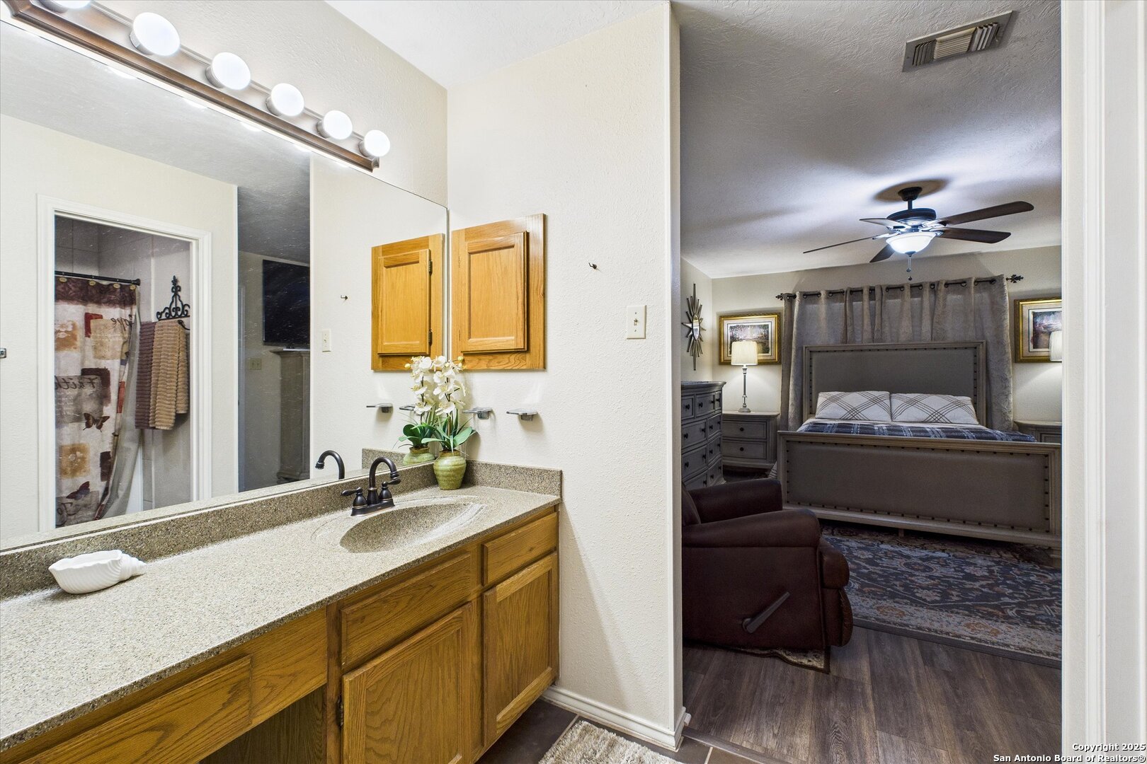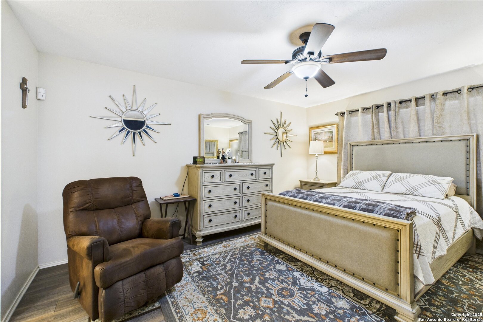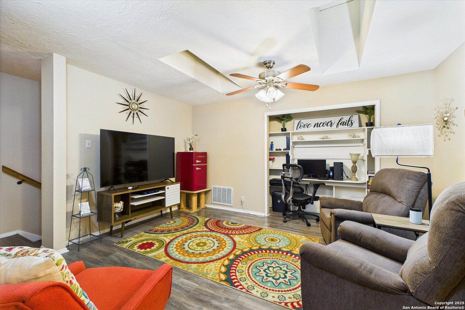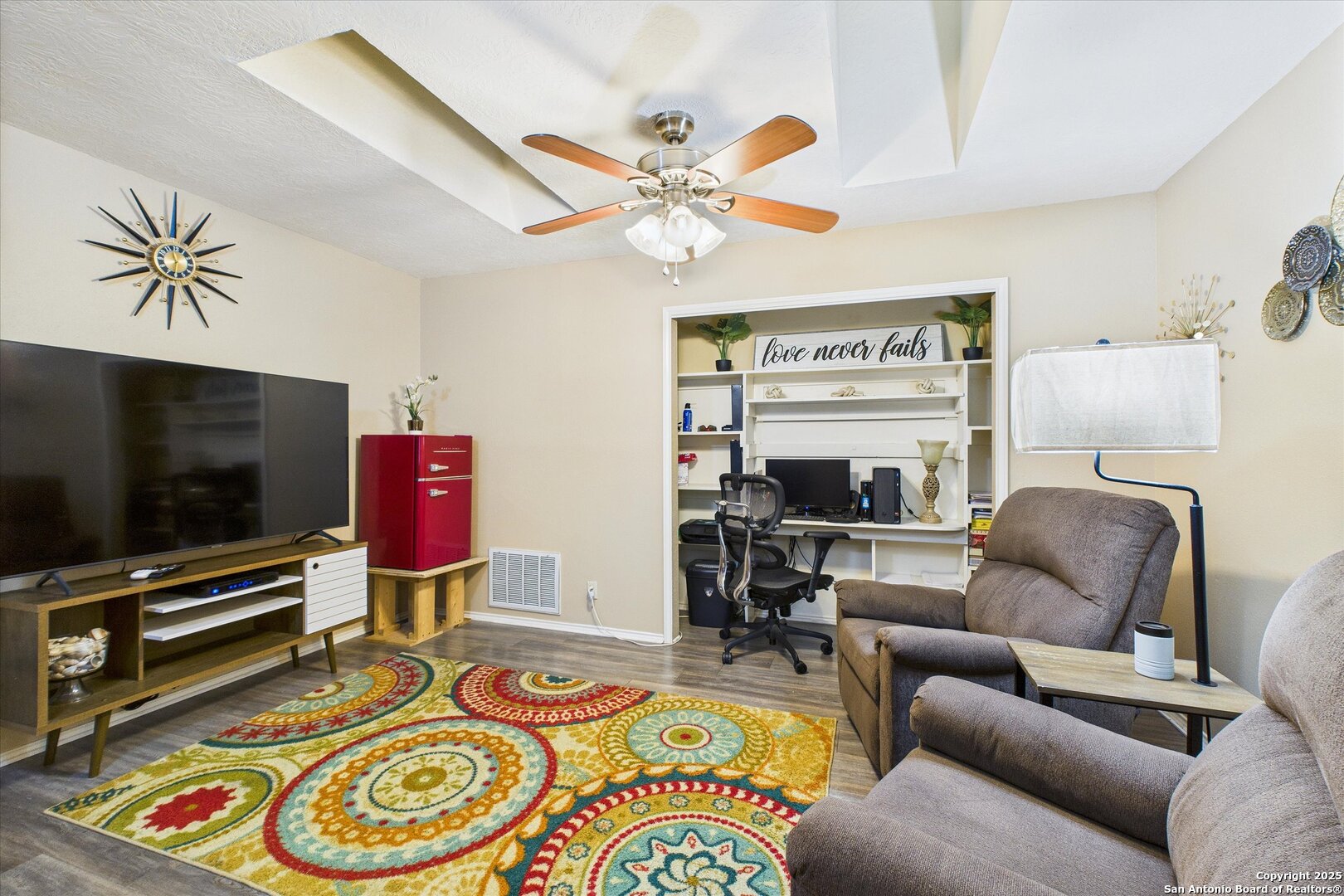 Exceptionally maintained 3 bed, 2.5 bath, two-story home with Primary Bedroom Downstairs located in Northern Hills Golf Course community. LOADED with updates: Roof 2022, A/C replaced 4/21, Rain gutters added in 2019, Luxury Vinyl Plank flooring 2019, New blinds in the bedrooms, and 3 new toilets! Convenient to Loop 1604, Hwy 281, I-35 and Wurzbach Pkwy. North East ISD schools. Enjoy the custom landscaped, low-maintenance backyard. Enclosed patio is perfect for a peaceful retreat for your morning coffee, or a bustling playroom/craft room/home-schooling area. The home features an open floor plan with 12' high ceilings, lots of natural light and NO carpet!! Gas or wood burning fireplace in the living room. Bright & cheery kitchen with breakfast area, granite countertops, new microwave, and 2 yr old stove! Stainless steel French door fridge stays! Primary bath has a step-in shower! Upstairs you will find a loft with built-in office space, two secondary bedrooms, and a full bath. Additional features: attached 2-car garage, solar screens and security system (owned). HVAC serviced regularly, and it has a 10-yr transferable warranty from the install date!. Voluntary HOA. Walk across the street to the golf course! Being a public golf course...after the last pairing goes through (after 8 PM) residents can walk or use the fairway for personal use- lots of people play ball or walk their dogs. (The signature green =12th Hole is right there across the street from the home).
