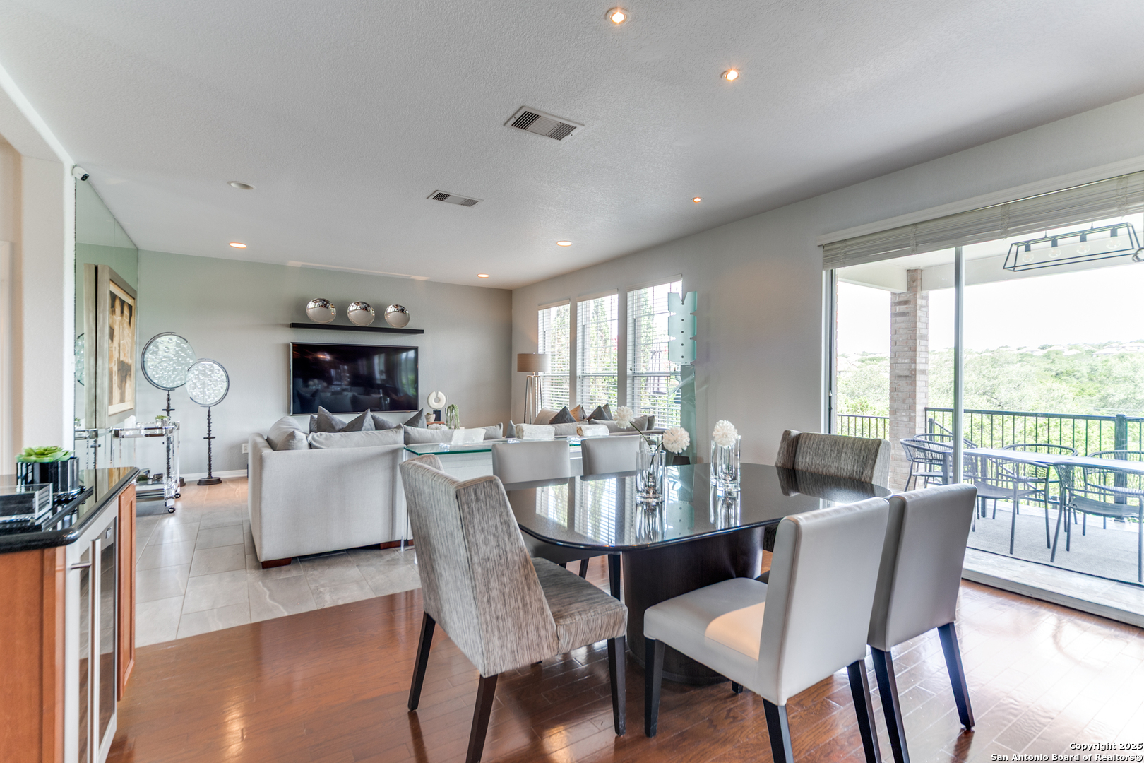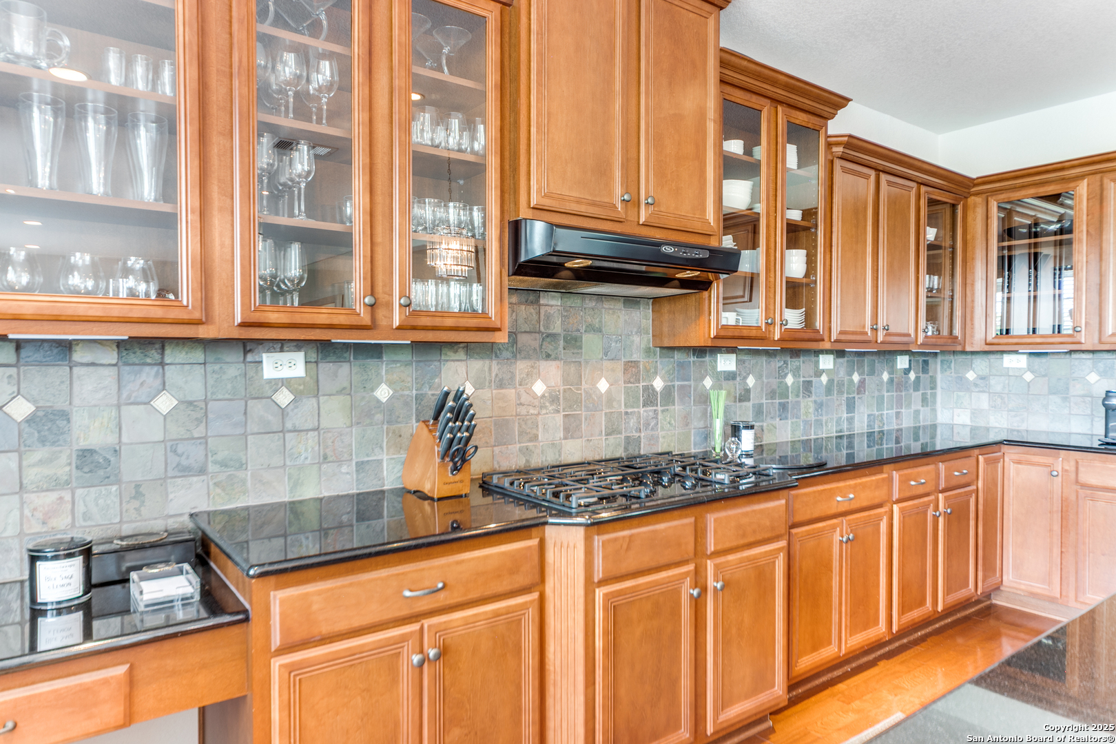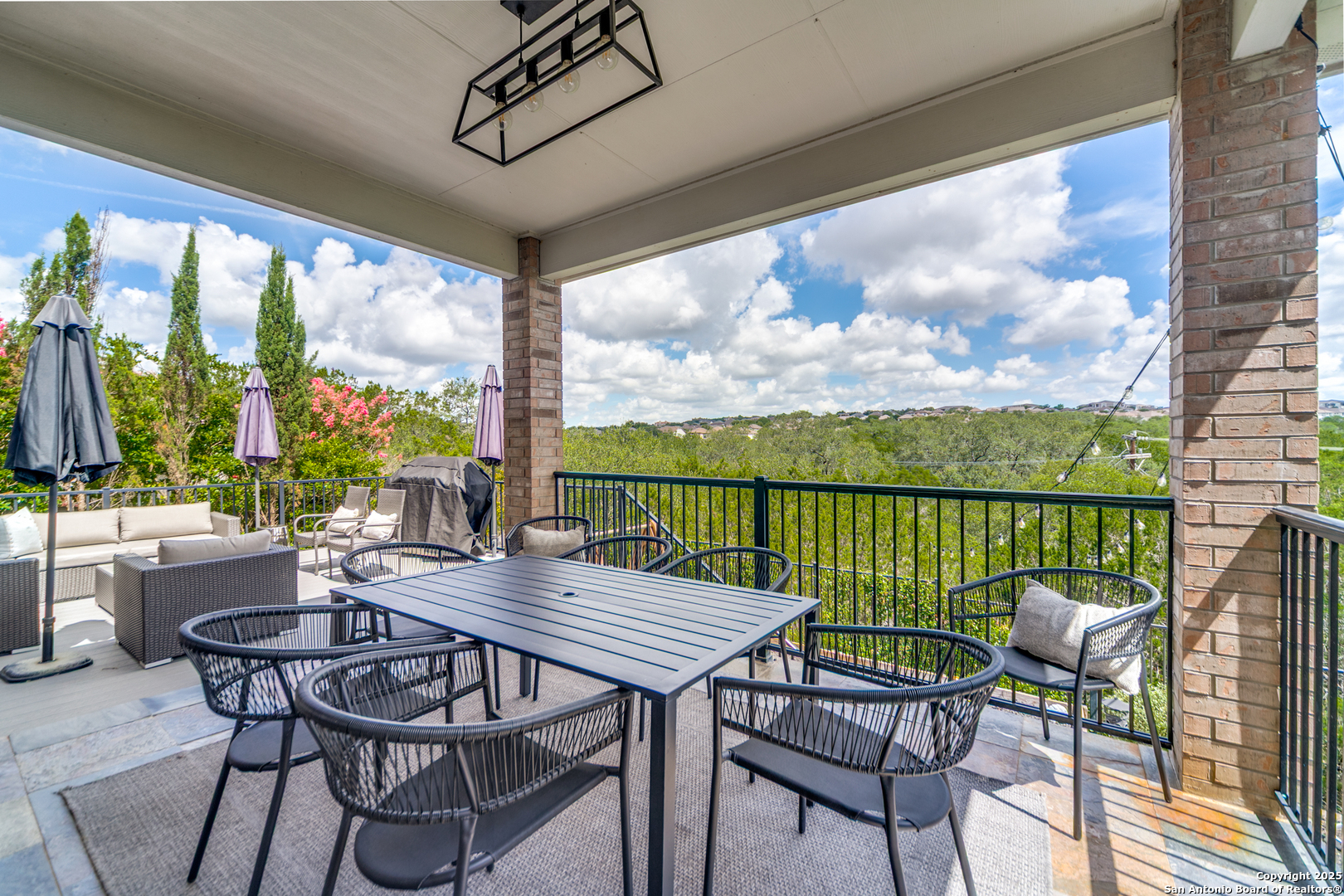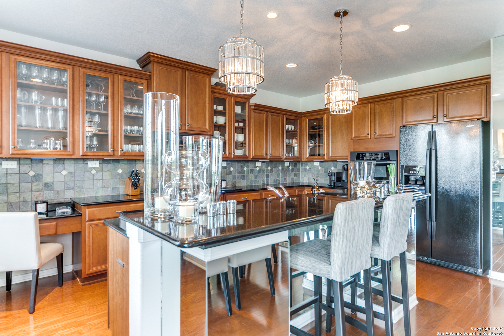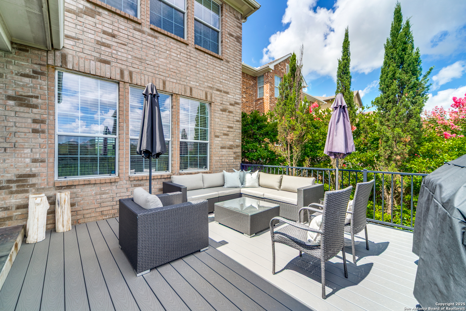 Elegant, updated home with breathtaking greenbelt views and a spacious open floor plan designed for modern living. Features a stunning island kitchen with granite countertops, breakfast bar, wet bar, and two wine coolers-perfect for entertaining. Enjoy a large upstairs primary suite, three additional bedrooms, a game room, and a guest suite with full bath downstairs. Designer lighting with dimmers, granite counters, modern sinks, and accent mirrors throughout add a touch of sophistication. Rich wood and ceramic tile floors on the first level, with plush carpet in all bedrooms for comfort. Outdoor living includes a covered porch, extended patio deck, and dedicated playground area. This home offers elegance, functionality, and an exceptional lifestyle-a must-see!
