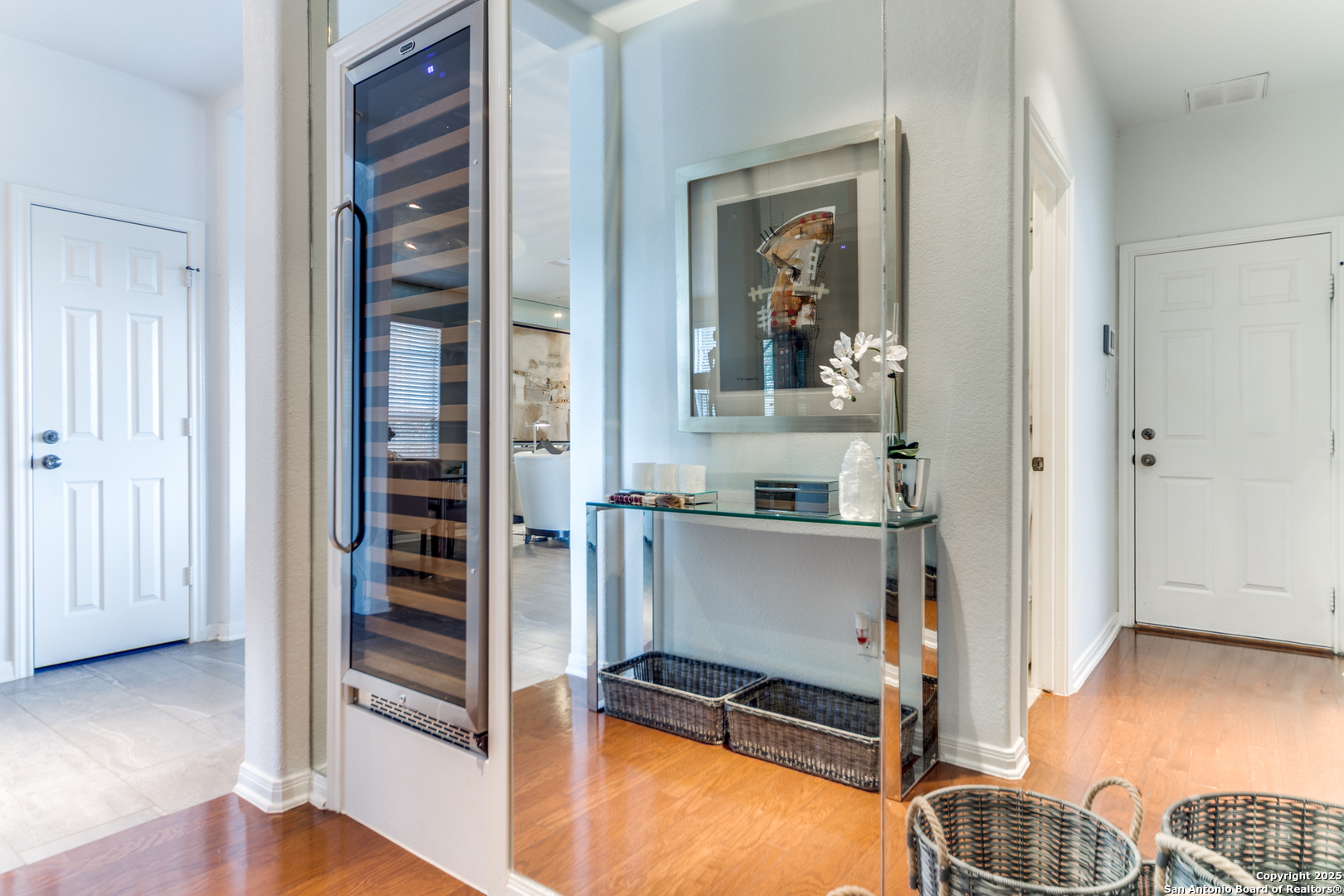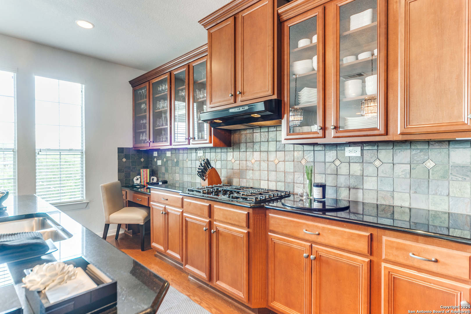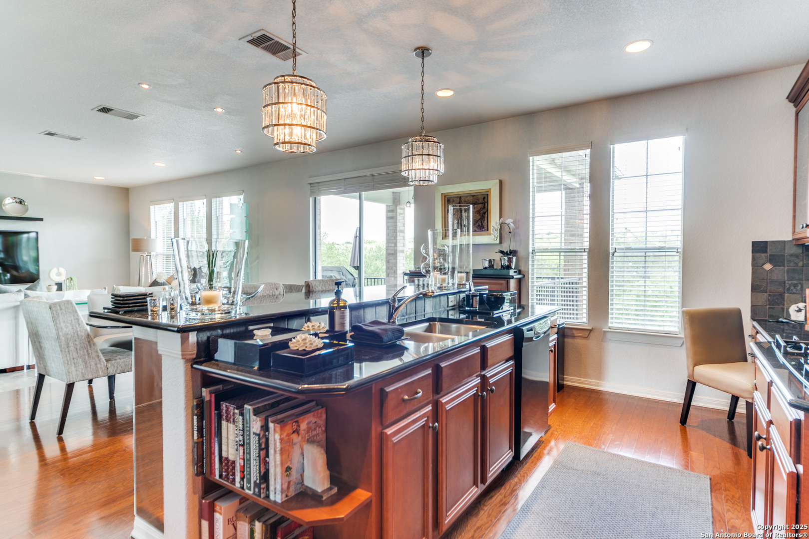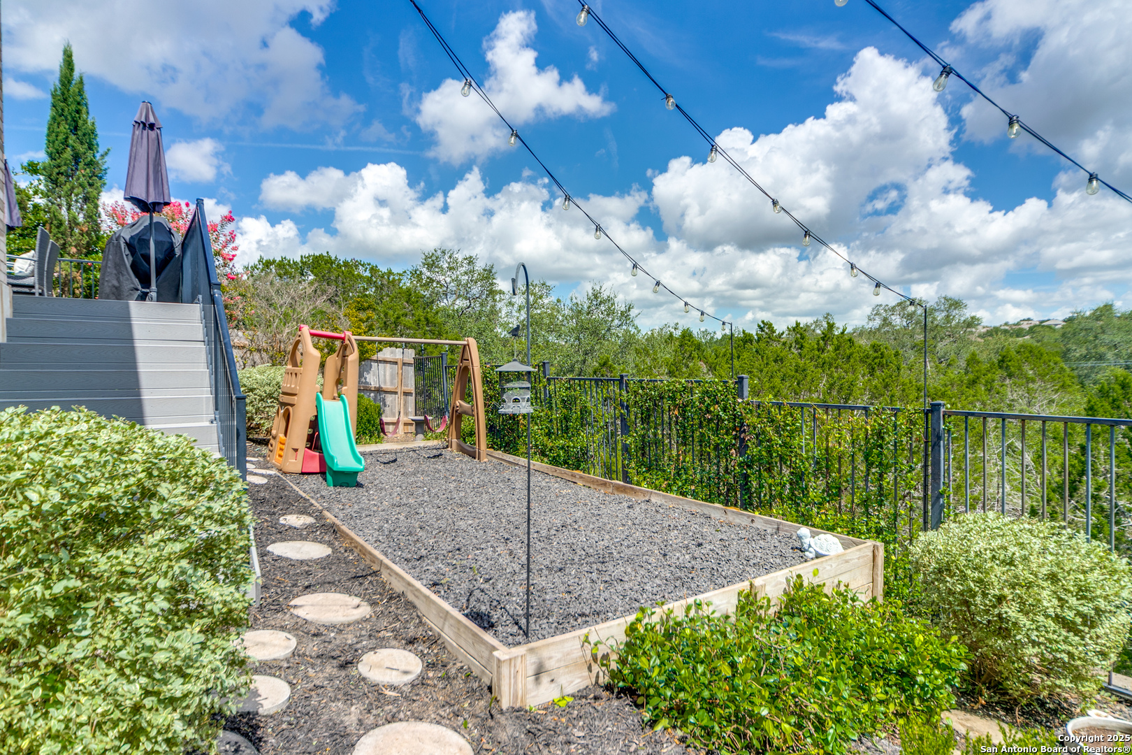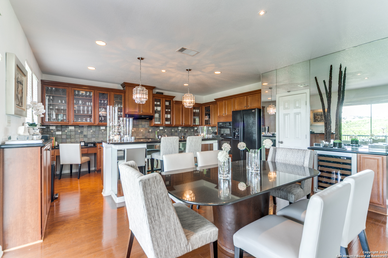 Elegant, updated home with breathtaking greenbelt views and a spacious open floor plan designed for modern living. Features a stunning island kitchen with granite countertops, breakfast bar, wet bar, and two wine coolers-perfect for entertaining. Enjoy a large upstairs primary suite, three additional bedrooms, a game room, and a guest suite with full bath downstairs. Designer lighting with dimmers, granite counters, modern sinks, and accent mirrors throughout add a touch of sophistication. Rich wood and ceramic tile floors on the first level, with plush carpet in all bedrooms for comfort. Outdoor living includes a covered porch, extended patio deck, and dedicated playground area. This home offers elegance, functionality, and an exceptional lifestyle-a must-see!