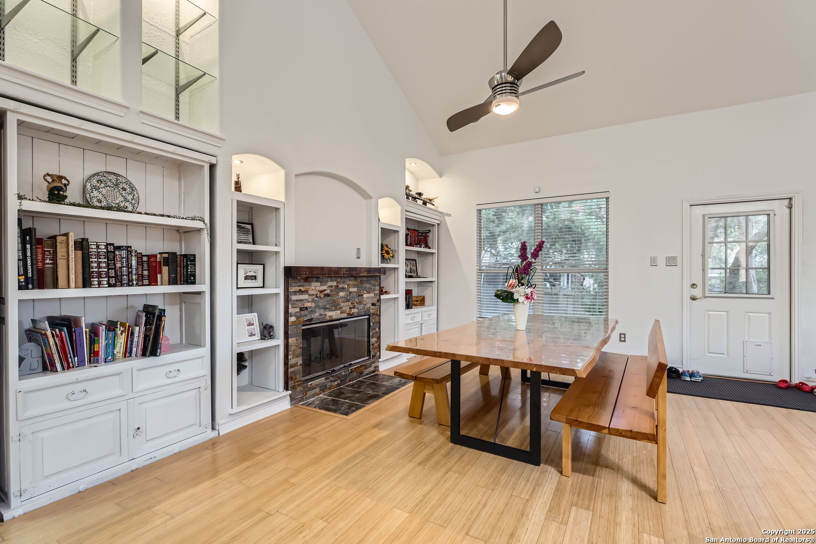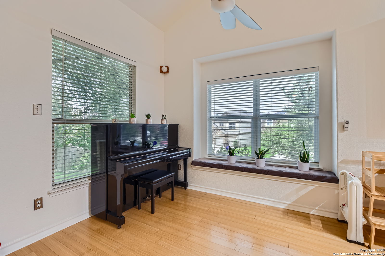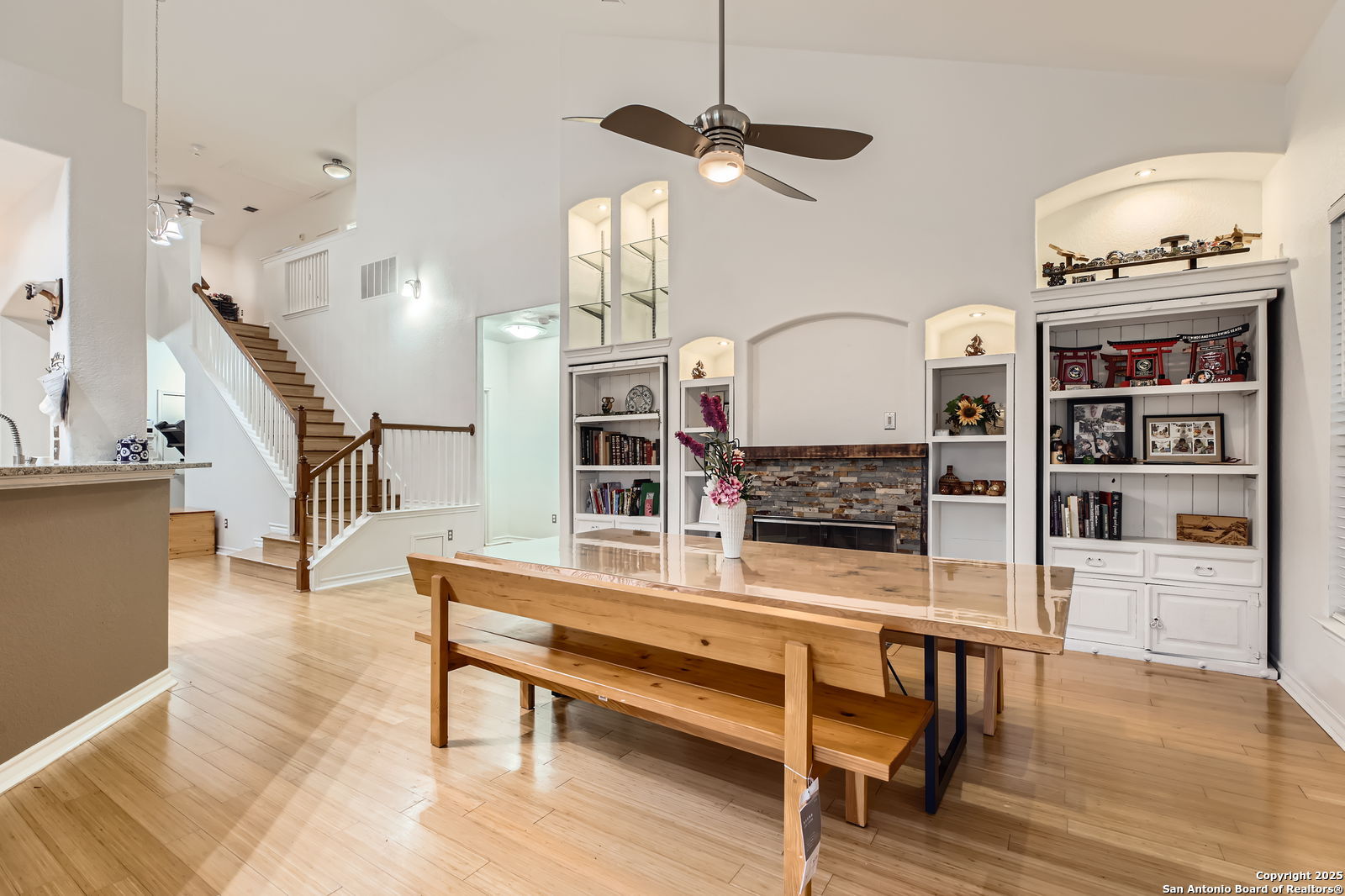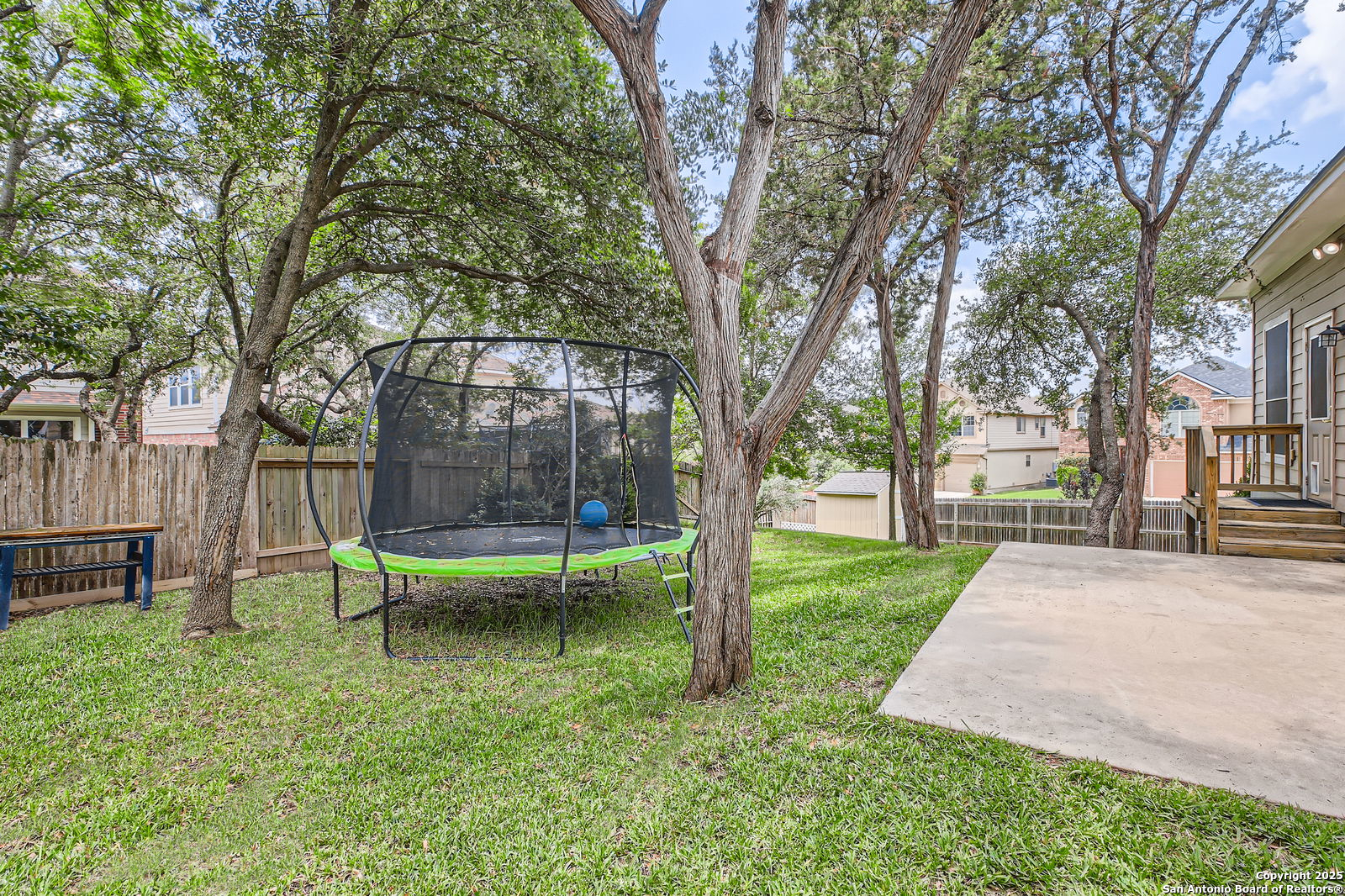 This distinctive corner lot home in The Ridge at Lookout Canyon delivers both comfort and practicality with thoughtful upgrades throughout. The downstairs primary suite offers convenient single-level living with a spacious walk-in closet and a jetted tub for unwinding after long days. Bamboo wood flooring flows seamlessly through the main living areas and up the staircase, creating continuity while granite countertops in the kitchen provide both durability and style. The family room centers around a striking stone fireplace that anchors the space, while solar screens on the windows help manage Texas heat efficiently. Recent improvements include a new Class 4 hail resistant roof installed in 2024 and a new stove, plus the addition of a water softener and high-level HVAC filtration system that addresses both comfort and air quality concerns. Modern fixtures throughout the home reflect current design sensibilities without feeling trendy. Upstairs, the open loft-style gameroom creates flexible space for entertainment or relaxation, complemented by a dedicated study featuring a built-in desk for productivity. Three additional bedrooms and abundant storage solutions ensure this home accommodates both daily living and long-term organization needs. The exterior offers equal appeal with a large, grassy yard enclosed by privacy fencing, a full sprinkler system that maintains the landscape, and a practical storage shed tucked into the backyard. Location advantages include an elementary school just one mile away and close proximity to neighborhood amenities including the community park and pool. The combination of recent updates, functional layout, and desirable location in