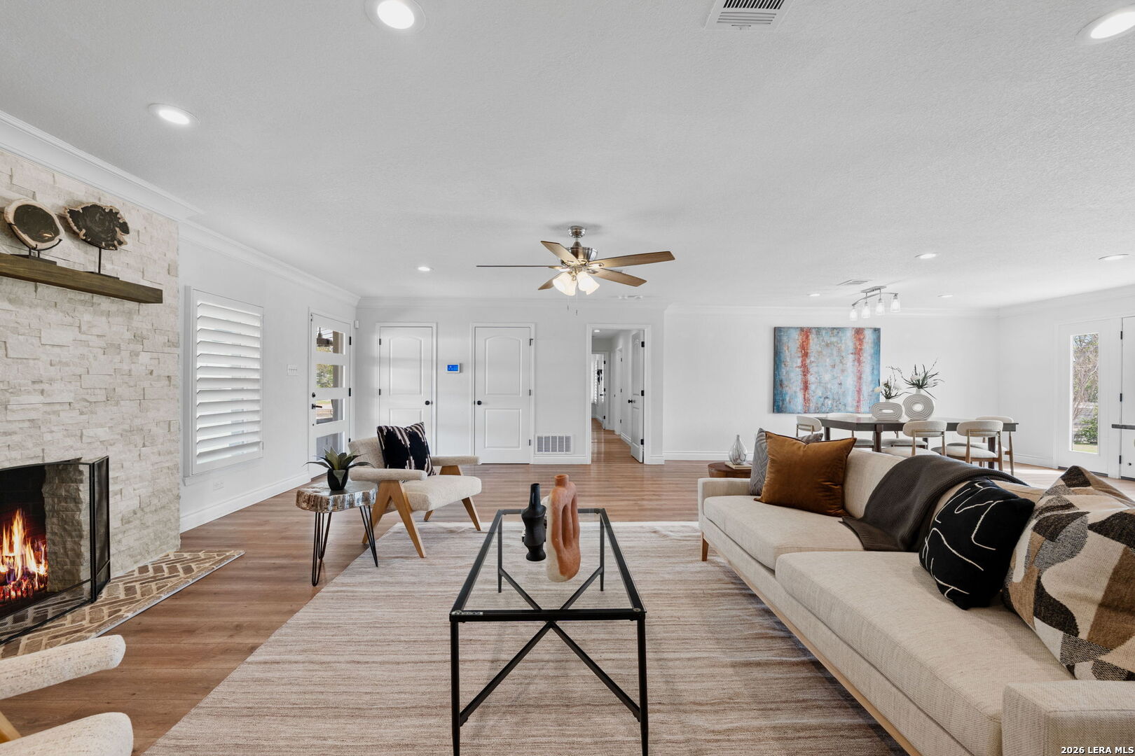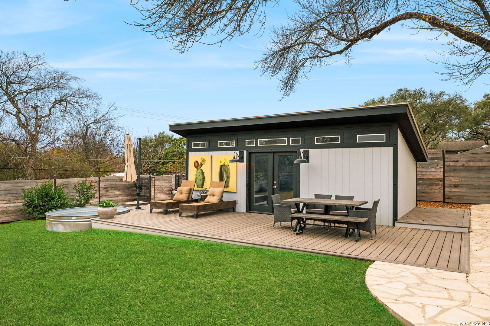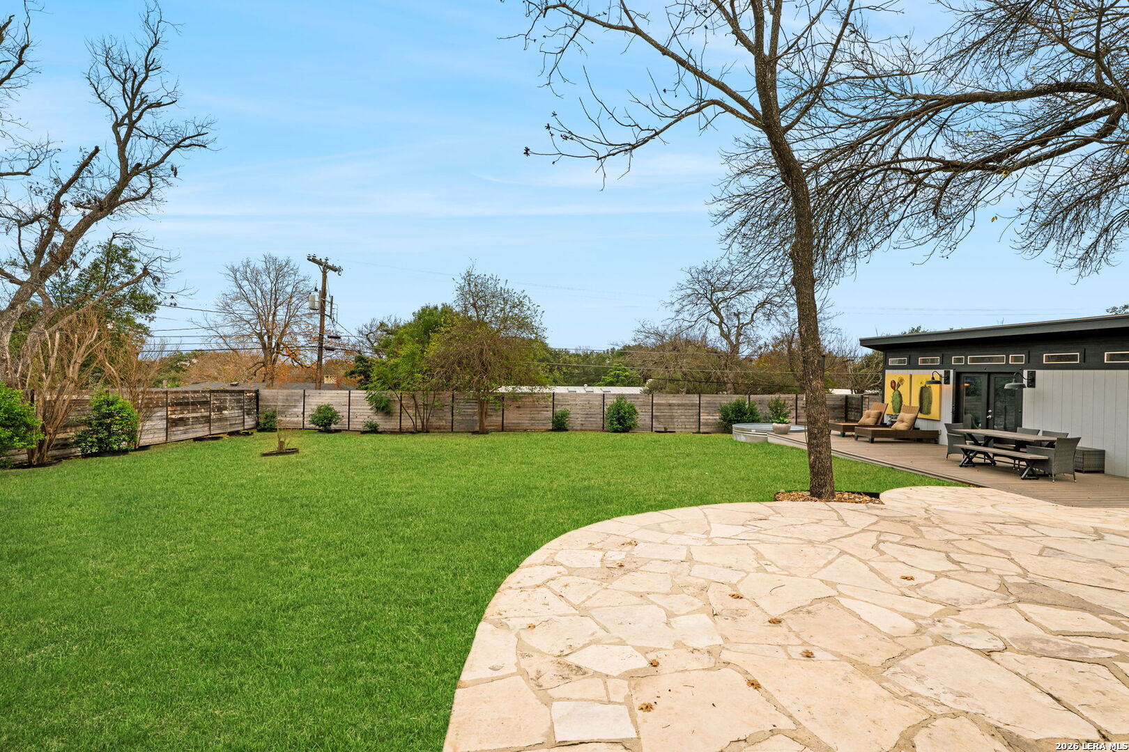 Move-in ready and beautifully reimagined, this single-story 1950s ranch sits on a spectacular oversized lot in Terrell Hills. Recently renovated, the home offers an open, light-filled floor plan with wood floors, exceptional storage, and thoughtful design throughout. The spacious living and dining areas are anchored by a striking stone fireplace and flow seamlessly into a stunning kitchen featuring custom cabinetry, a marble island with breakfast bar seating, designer appliances with gas cooking, and a stylish dry bar-perfect for everyday living and entertaining. The private primary suite occupies the east wing of the home and serves as a true retreat, complete with a spa-like bath showcasing dual marble-topped vanities, a soaking tub, and a large glass-enclosed walk-in shower. The west wing includes three additional bedrooms and two baths, with one bedroom ideally suited as a home office thanks to a wall of built-ins. Outdoor living shines with an expansive flagstone patio and decking designed for entertaining, a climate-controlled Tuff Shed "she shed" with beverage refrigerators, closets, and cabinetry, and a charming cowboy stock-tank-style pool with filtration and heating. Additional highlights include covered parking for two cars, a privacy-fenced and landscaped yard with sprinkler system, and a whole-home backup generator-completing this exceptional Terrell Hills offering.