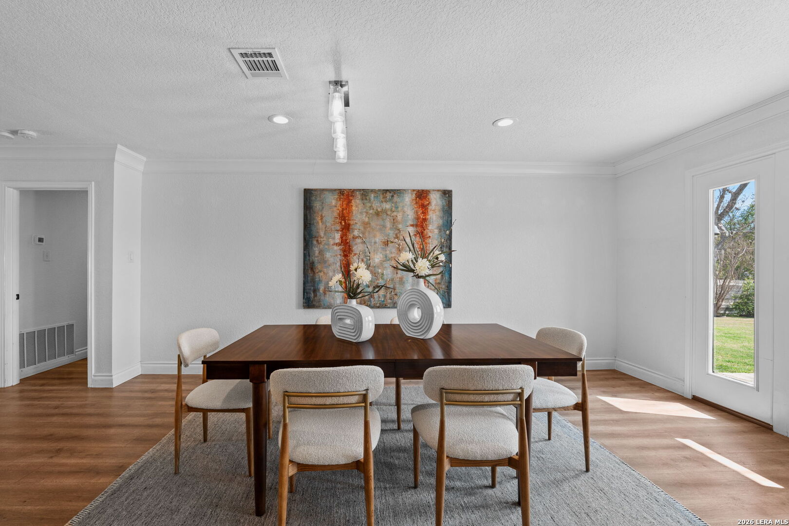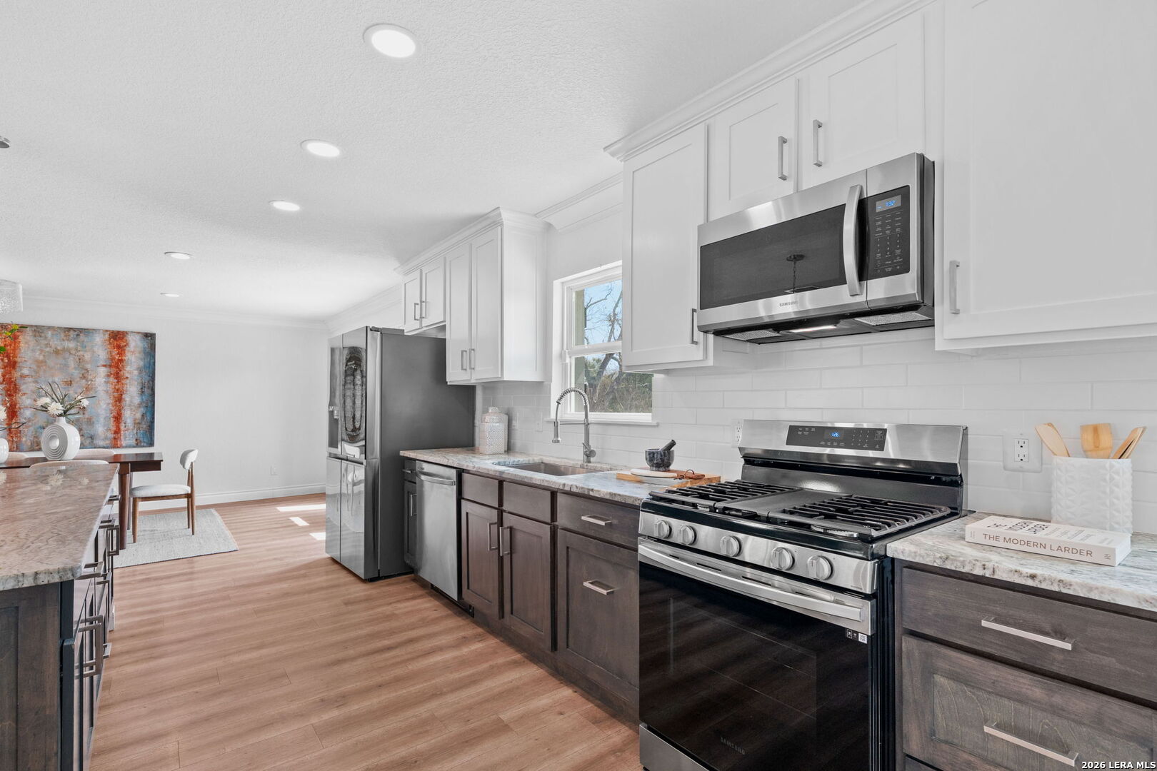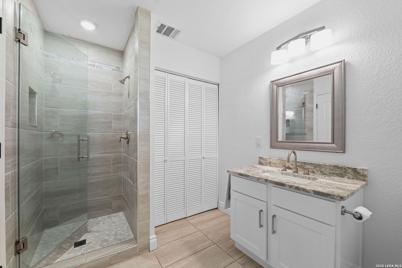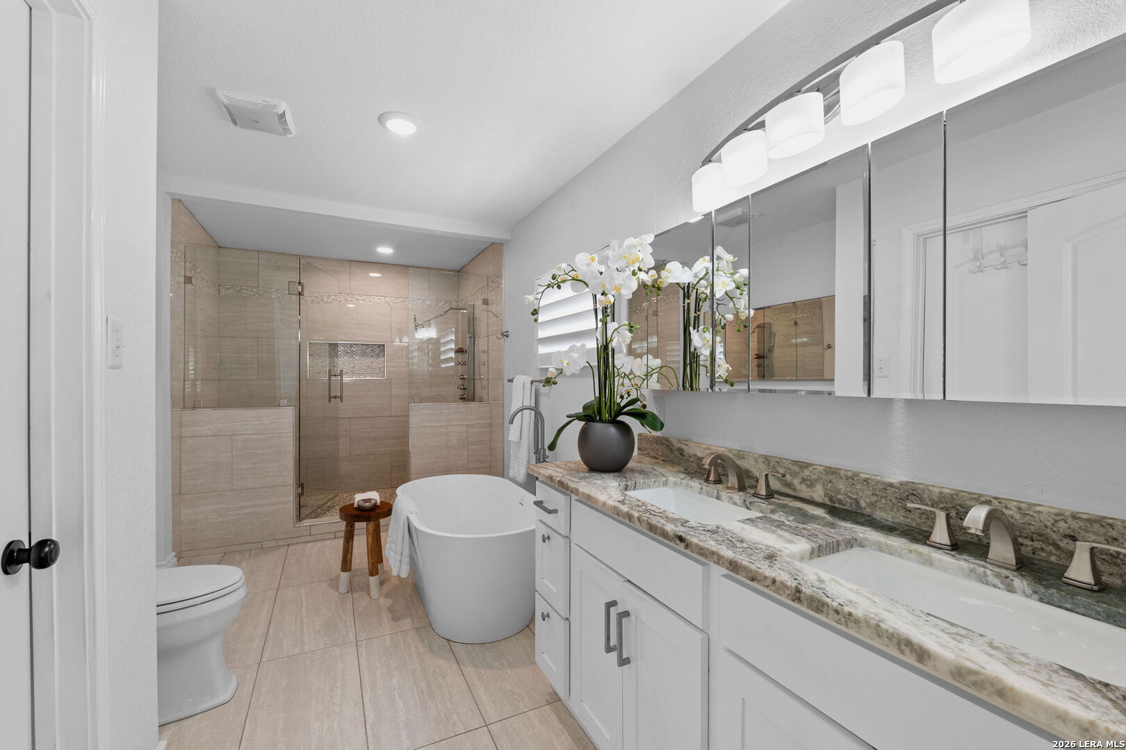 Move-in ready and beautifully reimagined, this single-story 1950s ranch sits on a spectacular oversized lot in Terrell Hills. Recently renovated, the home offers an open, light-filled floor plan with wood floors, exceptional storage, and thoughtful design throughout. The spacious living and dining areas are anchored by a striking stone fireplace and flow seamlessly into a stunning kitchen featuring custom cabinetry, a marble island with breakfast bar seating, designer appliances with gas cooking, and a stylish dry bar-perfect for everyday living and entertaining. The private primary suite occupies the east wing of the home and serves as a true retreat, complete with a spa-like bath showcasing dual marble-topped vanities, a soaking tub, and a large glass-enclosed walk-in shower. The west wing includes three additional bedrooms and two baths, with one bedroom ideally suited as a home office thanks to a wall of built-ins. Outdoor living shines with an expansive flagstone patio and decking designed for entertaining, a climate-controlled Tuff Shed "she shed" with beverage refrigerators, closets, and cabinetry, and a charming cowboy stock-tank-style pool with filtration and heating. Additional highlights include covered parking for two cars, a privacy-fenced and landscaped yard with sprinkler system, and a whole-home backup generator-completing this exceptional Terrell Hills offering.