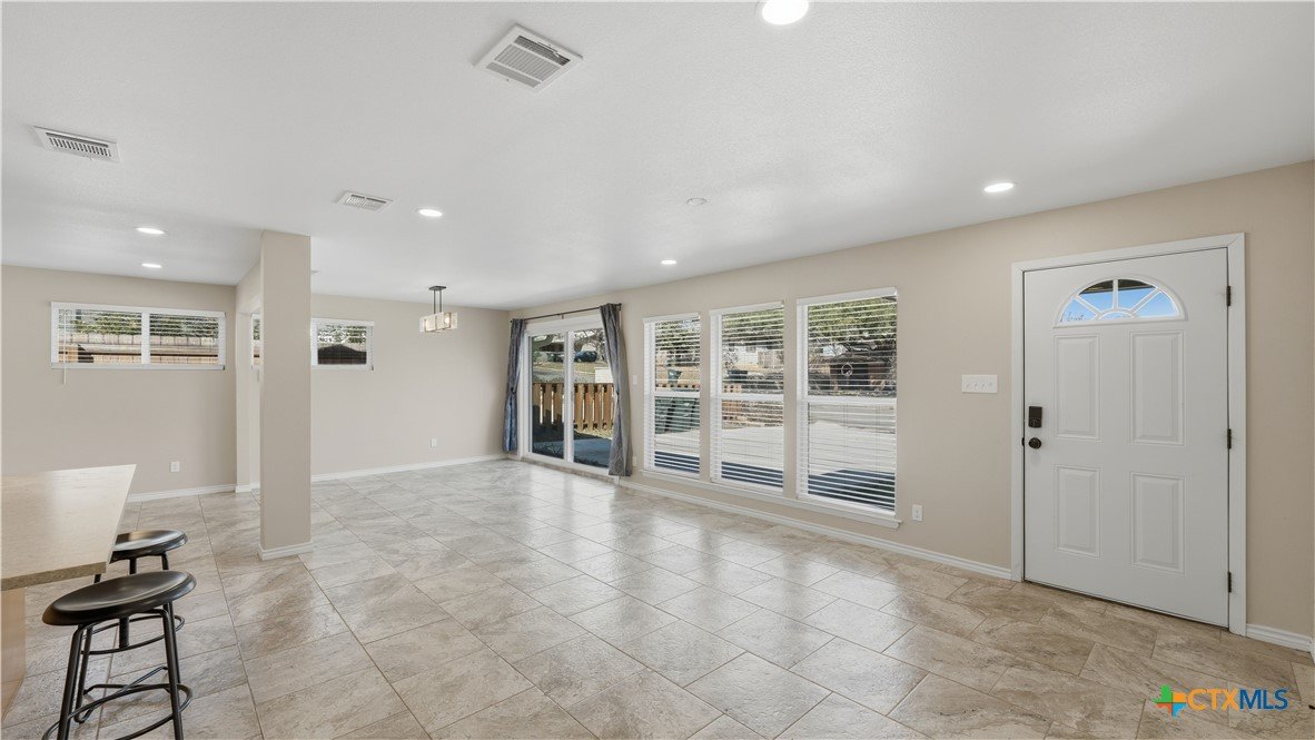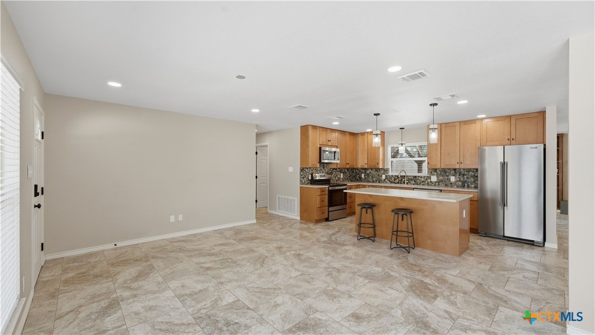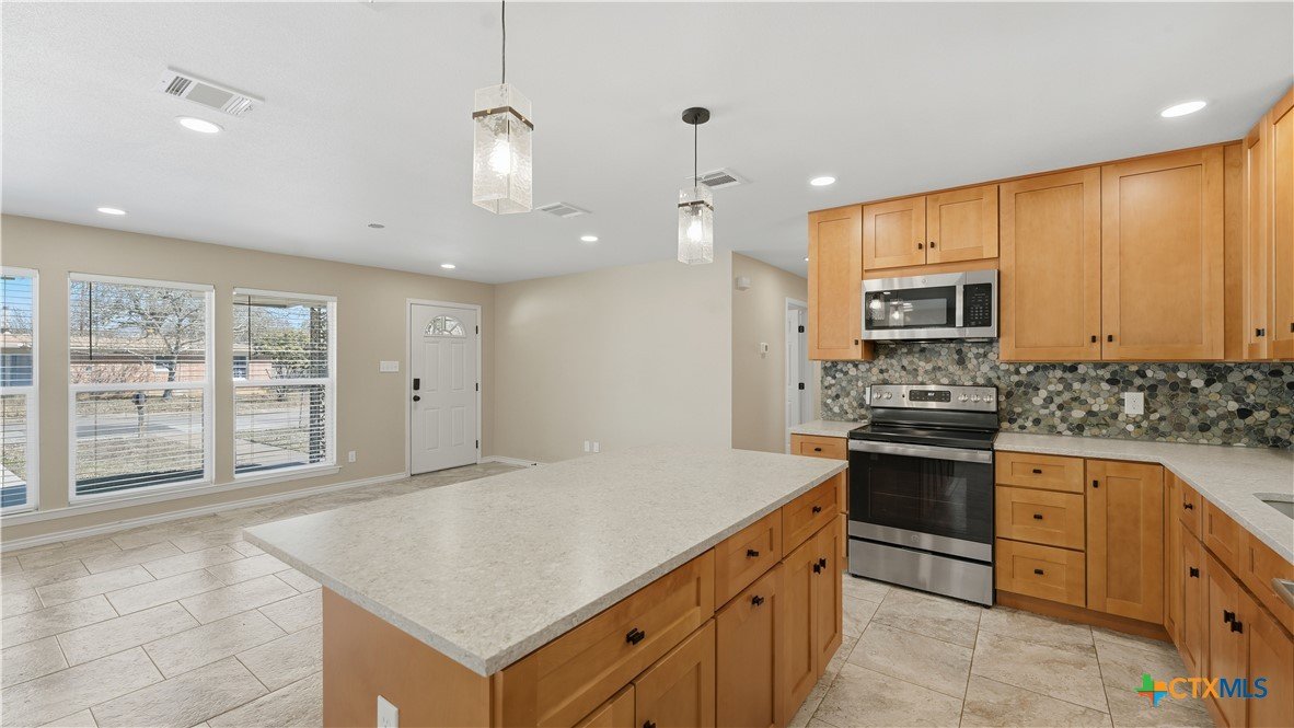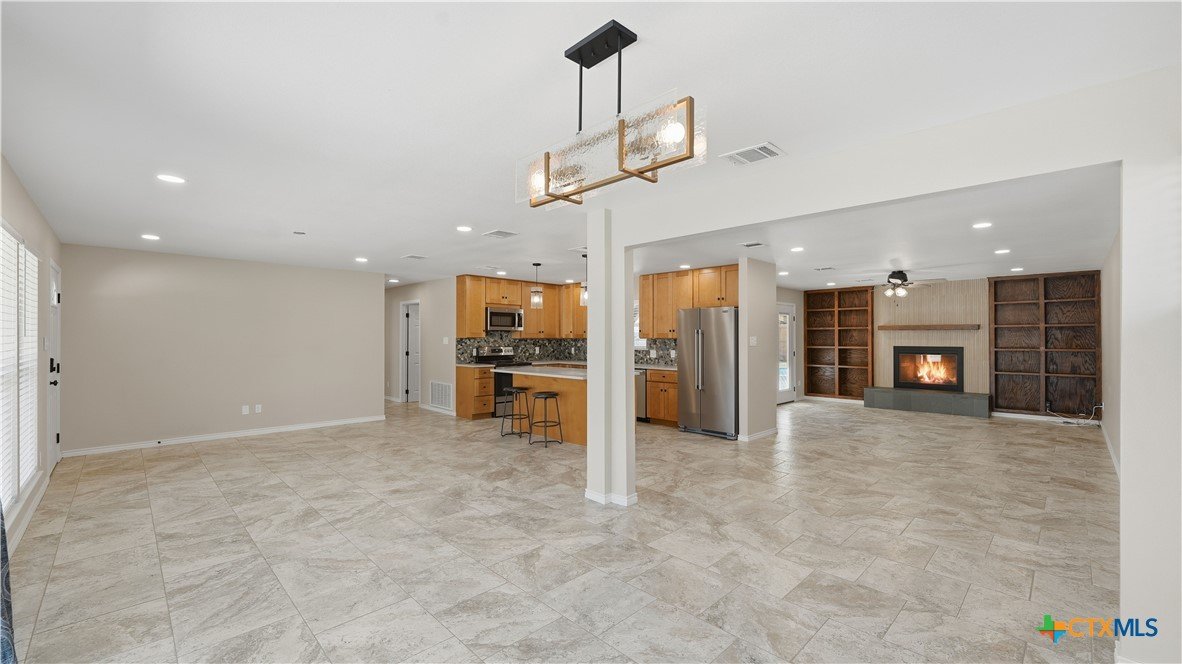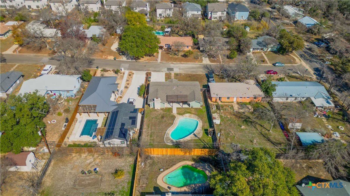 Welcome to 1409 Highland Drive—fully renovated and truly turnkey, on the hill, in the heart of San Marcos on a generous .55-acre lot. Located near Texas State University, you can walk downhill to campus or catch the shuttle just two blocks away, with easy access to Schulle Canyon Natural Area and the LBJ Drive Trailhead for hiking and fresh air. Rebuilt the right way, this home offers 3 bedrooms, 2 full bathrooms. Inside, enjoy a clean, modern finish with new tile throughout, a striking new fireplace surround, and a completely reimagined kitchen featuring leathered quartz countertops, shaker-style cabinetry, and all-new appliances—Bosch dishwasher, GE convection oven with air fry, built-in microwave/hood, brushed stainless refrigerator, plus Maytag washer and dryer. Bathrooms match the same elevated style with quartz-and-shaker finishes and custom glass shower doors, and every light and plumbing fixture is new. Big-ticket upgrades are done: new roof and gutters, new HVAC, new water heater, updated whole-house plumbing, and all-new electrical wiring. Additional improvements include new windows and blinds, hardwired security cameras, and added exterior lighting. Out back, enjoy the pool-side with a new pergola and concrete patio, new fencing, and upgraded pool equipment. Fresh landscaping and new trees—Mexican sycamore out front and an Anacua in back.