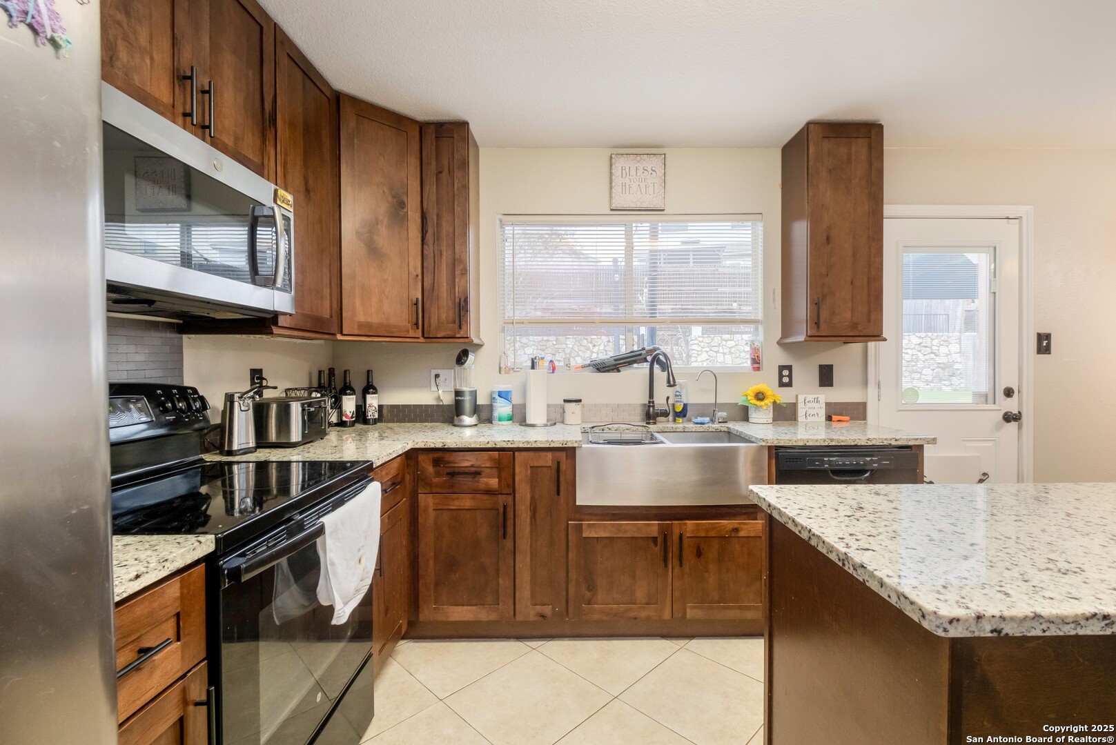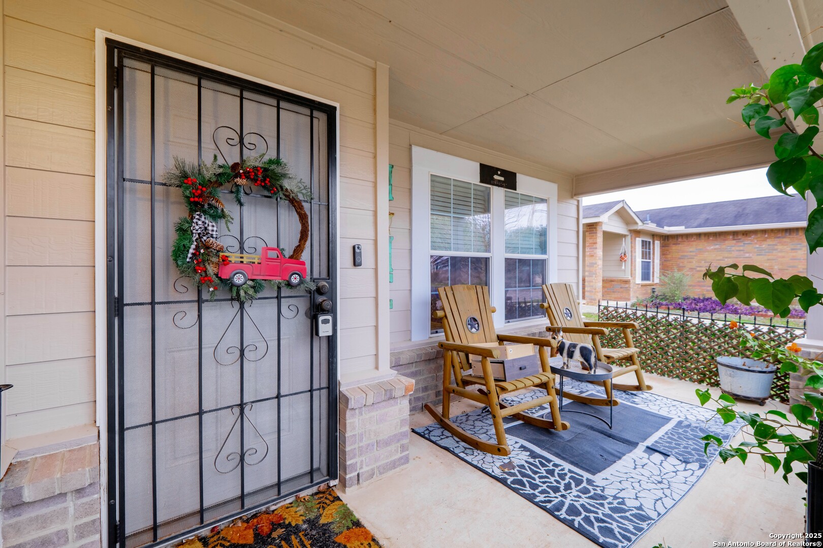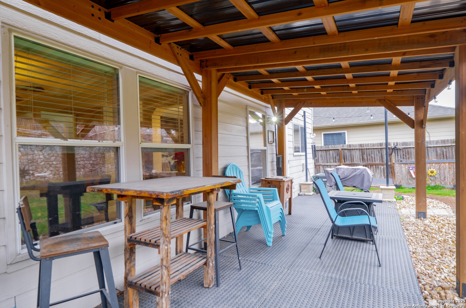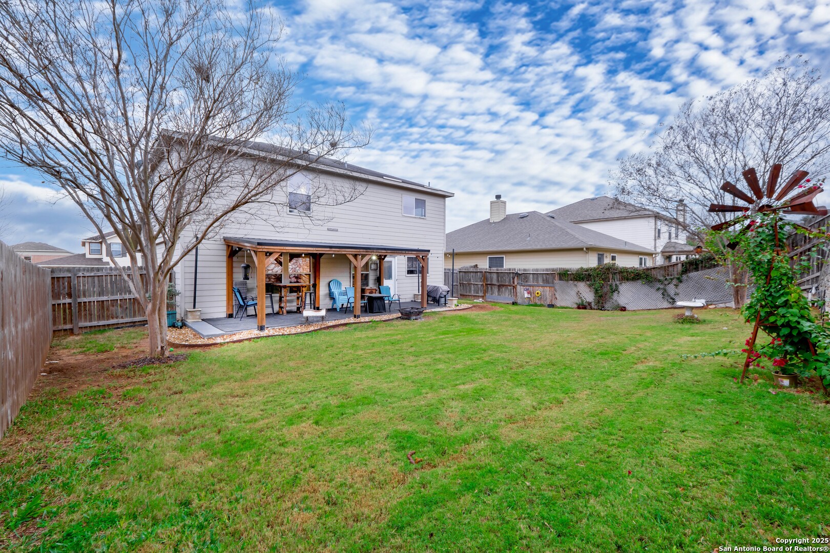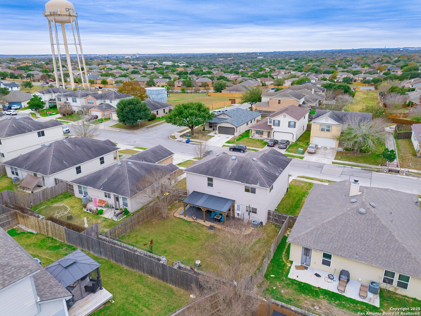 This beautiful two-story home offers 3 bedrooms, 2.5 baths, and approximately 2,005 square feet of living space on a 0.15-acre lot. A wrought-iron fenced front porch adds charm and curb appeal, while a 2-car garage provides everyday convenience. All bedrooms are located upstairs, creating a clear separation between everyday living and private spaces. The main level features an inviting living area that flows into the dining space and a newly renovated kitchen and baths with stone countertops. The kitchen includes a center island, ample workspace, and all appliances included. 12 x 12 tile flooring runs throughout the downstairs, while the upstairs features new carpet for added comfort. Upstairs, the primary suite showcases a tray ceiling and an ensuite bathroom with a dual vanity and a garden tub and shower combination, along with generous closet space. A bonus area at the landing provides flexible space for a game room, home office, or additional living area. Two secondary bedrooms share a full bath. Outdoor living is enhanced by a covered custom wood patio structure, ideal for relaxing, entertaining, and gatherings. The space accommodates seating and an outdoor grill setup and opens to a spacious, wood-fenced backyard offering privacy and versatility. Conveniently located just a few minutes from Elaine S. Schlather Intermediate School, this move-in-ready home combines thoughtful updates, functional design, and inviting indoor and outdoor spaces.
