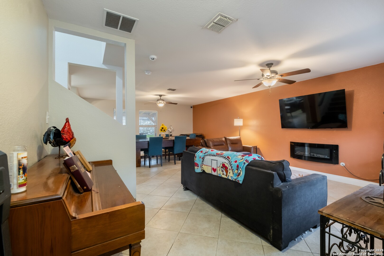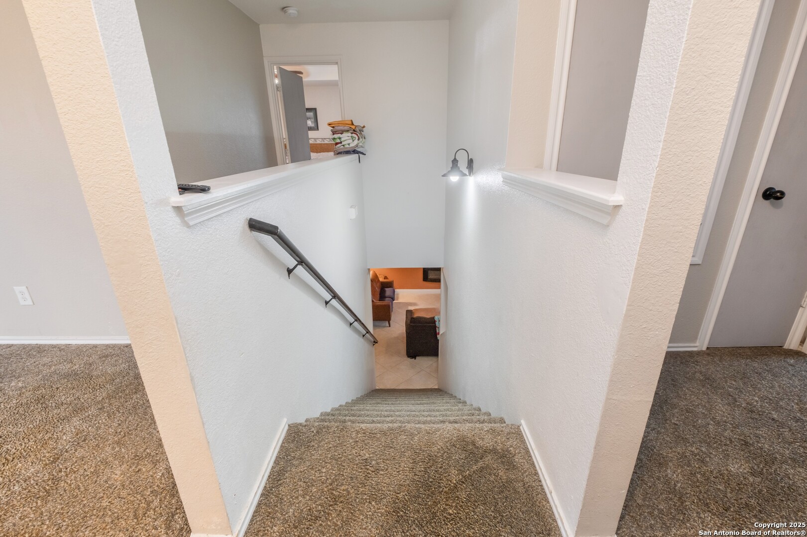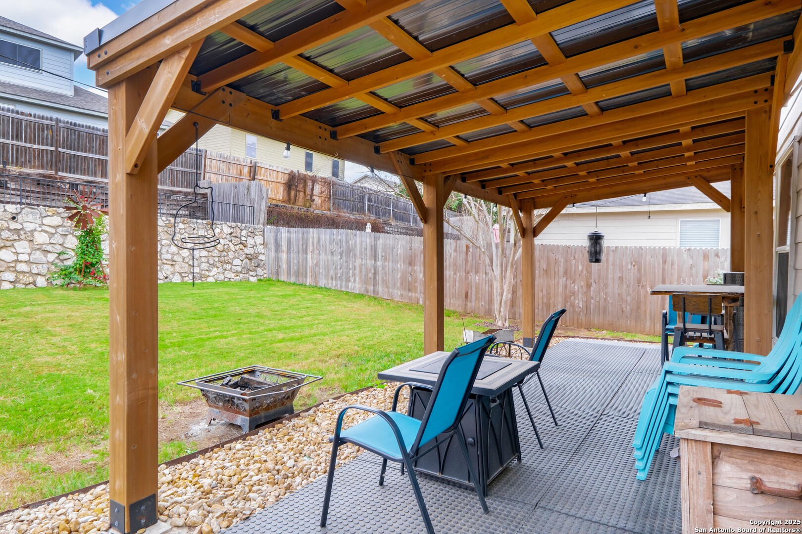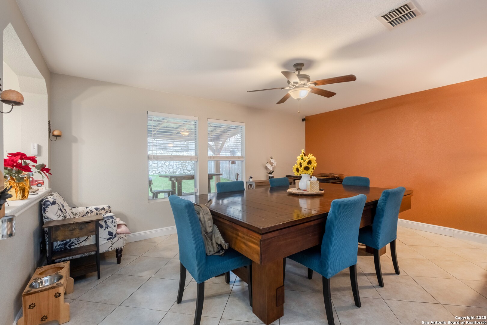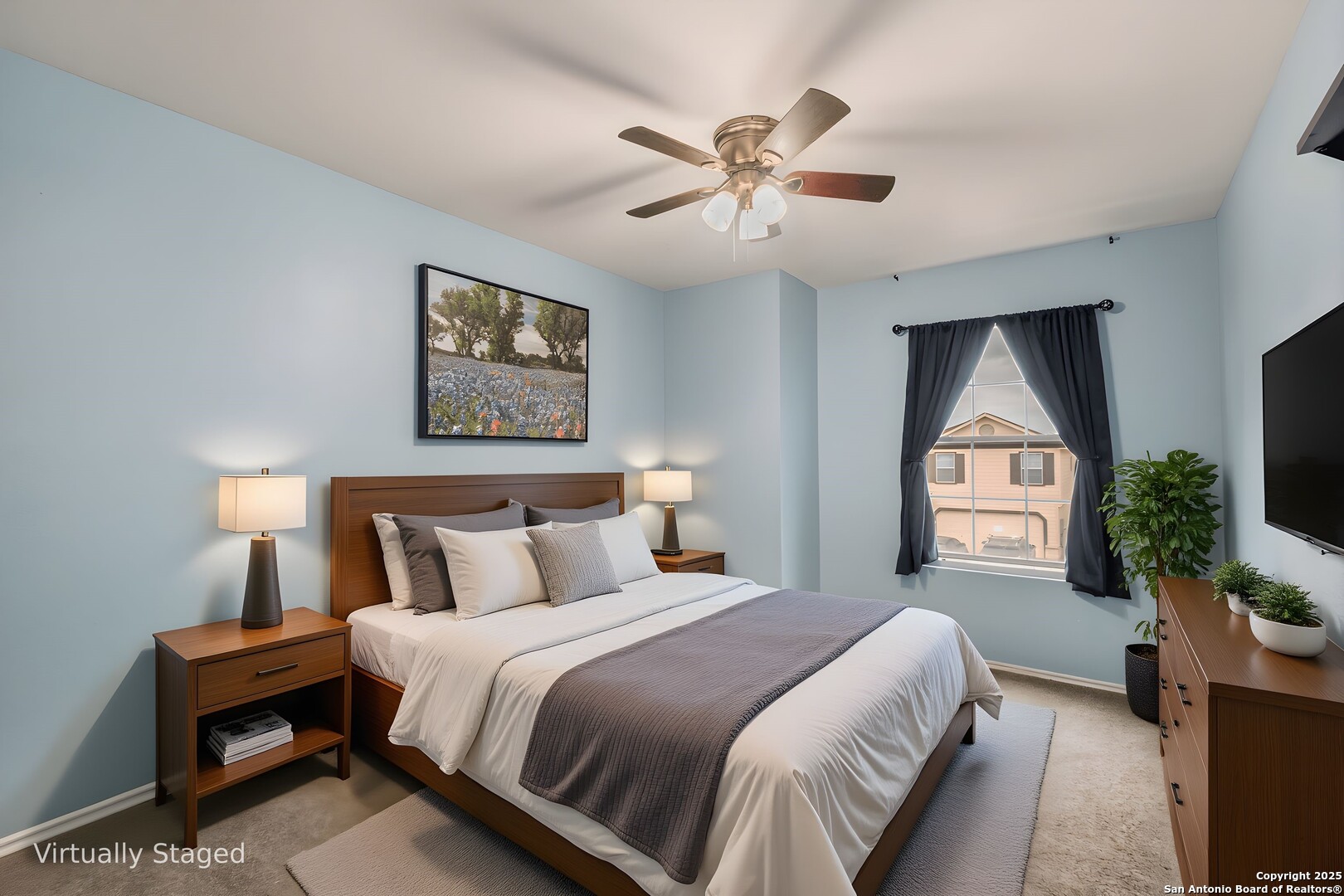This beautiful two-story home offers 3 bedrooms, 2.5 baths, and approximately 2,005 square feet of living space on a 0.15-acre lot. A wrought-iron fenced front porch adds charm and curb appeal, while a 2-car garage provides everyday convenience. All bedrooms are located upstairs, creating a clear separation between everyday living and private spaces. The main level features an inviting living area that flows into the dining space and a newly renovated kitchen and baths with stone countertops. The kitchen includes a center island, ample workspace, and all appliances included. 12 x 12 tile flooring runs throughout the downstairs, while the upstairs features new carpet for added comfort. Upstairs, the primary suite showcases a tray ceiling and an ensuite bathroom with a dual vanity and a garden tub and shower combination, along with generous closet space. A bonus area at the landing provides flexible space for a game room, home office, or additional living area. Two secondary bedrooms share a full bath. Outdoor living is enhanced by a covered custom wood patio structure, ideal for relaxing, entertaining, and gatherings. The space accommodates seating and an outdoor grill setup and opens to a spacious, wood-fenced backyard offering privacy and versatility. Conveniently located just a few minutes from Elaine S. Schlather Intermediate School, this move-in-ready home combines thoughtful updates, functional design, and inviting indoor and outdoor spaces.