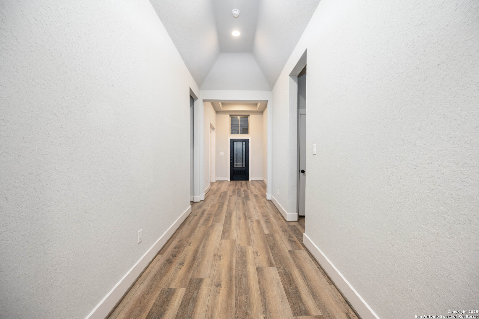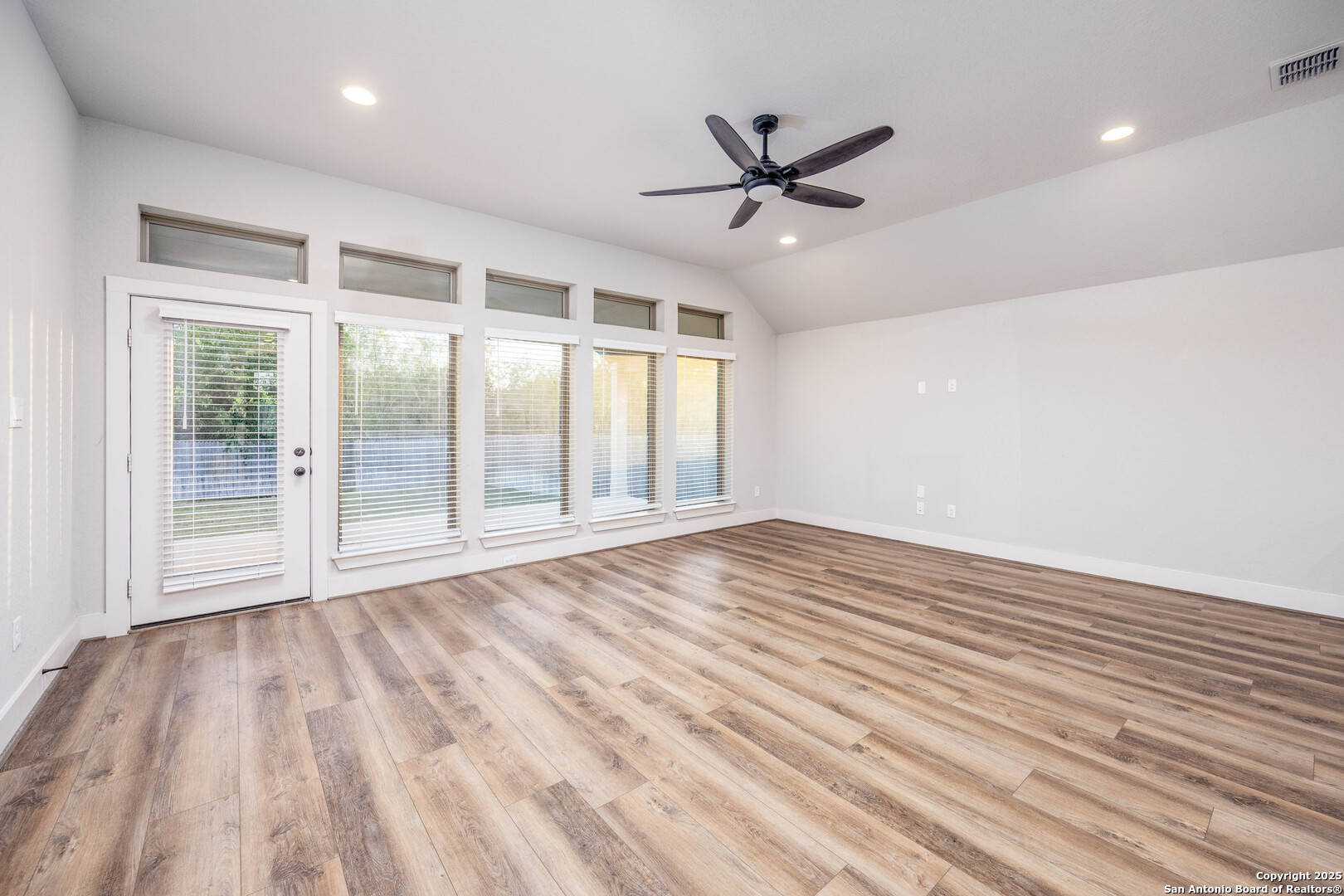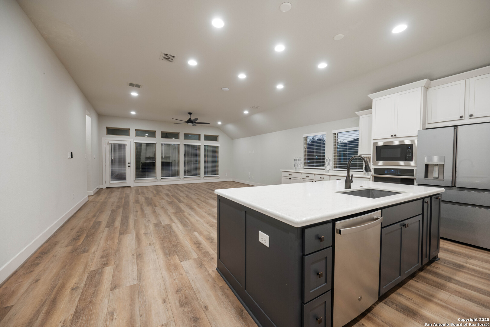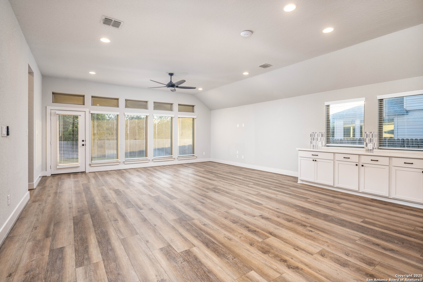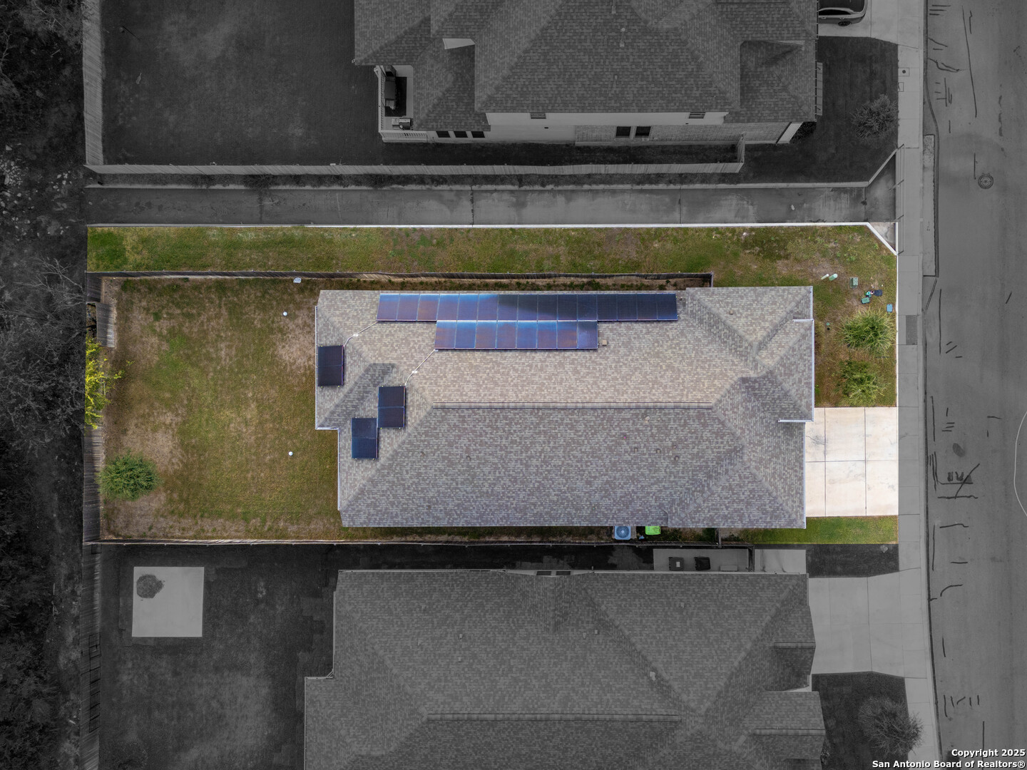 This exquisite Perry home in the highly-coveted Kallison Ranch neighborhood offers unparalleled greenbelt privacy with no rear neighbors! Featuring a spacious open floor plan with soaring 10-foot ceilings, three bedrooms, and three full bathrooms, this single-story sanctuary blends luxury with functionality. Interior highlights include a gourmet kitchen with a professional 5-burner gas cooktop, upgraded built-in GE Profile convection oven and dishwasher, touch-activated farmhouse-style sink, pristine quartz countertops with large central island, GE Cafe Smart refrigerator, and a walk-in pantry. An oversized master suite, with a well-appointed en-suite bathroom with dual vanities, soaking tub, step-down tile shower, and two walk-in closets. Smart Home Technology, with whole-home CAT-5e Ethernet and centralized server rack, Ubiquiti WiFi 6 coverage, Leviton smart dimmers, and AT&T Fiber readiness. Energy efficiency, with owned solar panels, reducing electricity bills by almost half, plus an owned water softener. Outdoor and community features include a private covered patio with ceiling fan, perfect for morning coffee or evening relaxation. Resort-style amenities, with access to $2.3M HOA facilities including two lagoon-style pools, fishing ponds, dog park, playgrounds, and outdoor fireplace pavilion. This prime northwest SA location provides easy access to Loop 1604/211/151, along with many retail and grocery stores, entertainment venues, and restaurant options. Schedule your showing today!