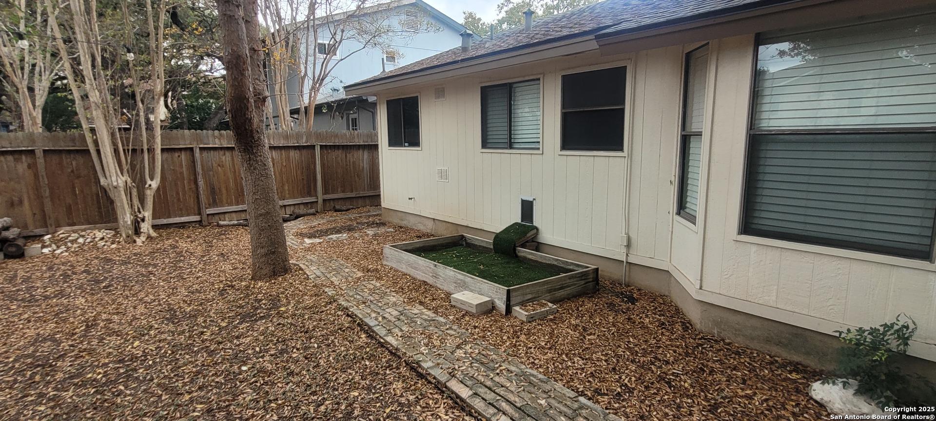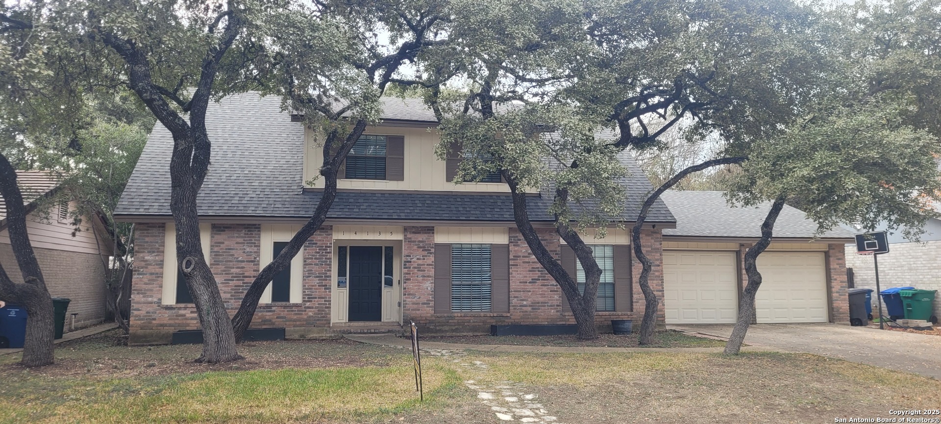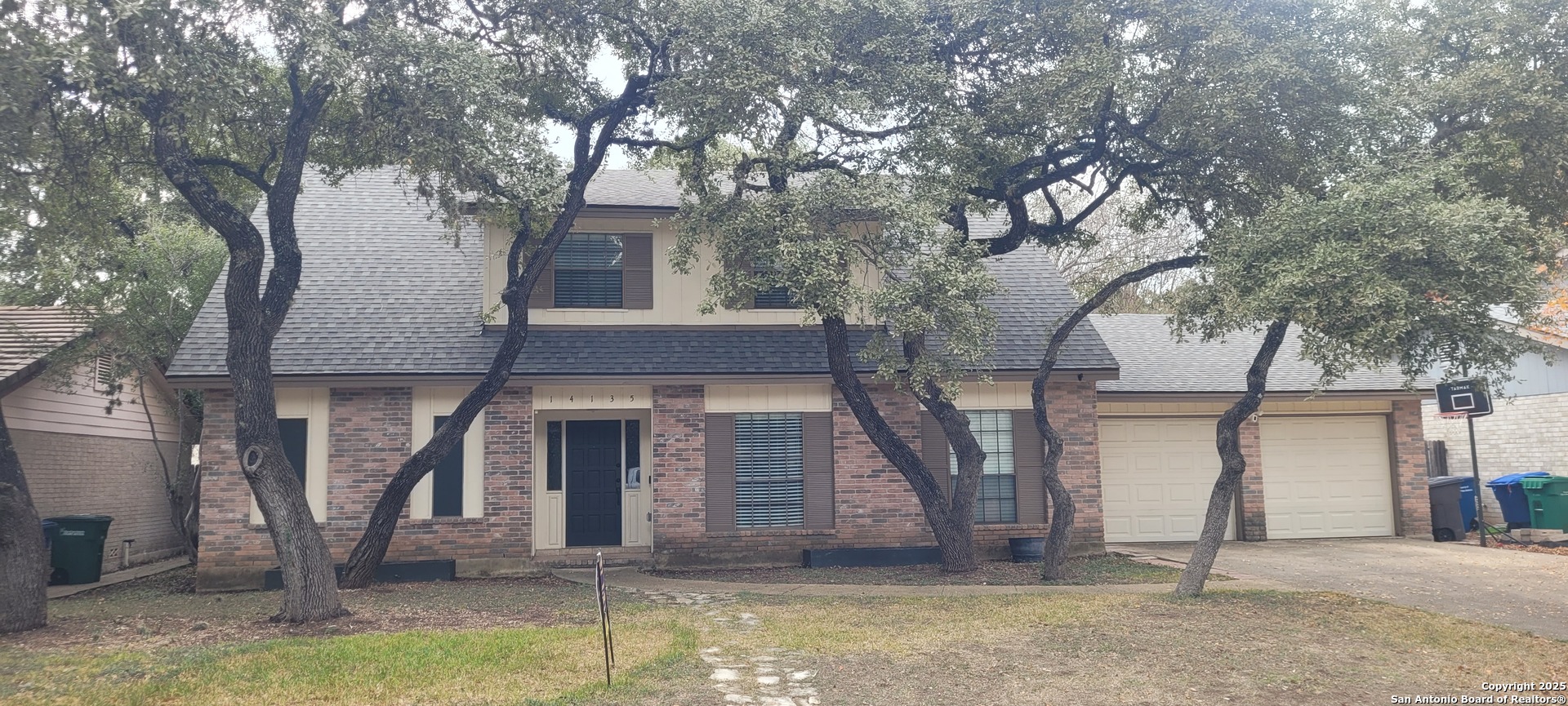 "This charming family home is located in Oak Meadow which is located in North Central San Antonio inside Loop 1604 off NW Military Hwy. It consists of 4 bedrooms, 3-1/2 bathrooms, and upstairs office with built in shelving and desk. The home is on a nicely-sized lot with a 2 car garage and has a large play-worthy backyard with established trees and storage shed! Inside, spacious areas are fit for entertaining with a walk in pantry and bar area. The cozy living space offers an all-brick wood burning fireplace with an open concept that gives way to the kitchen area and breakfast nook. The kitchen comes equipped with all-white cabinetry, stylish hardware, complementing granite counters, and all-black appliances including a double oven, gas cooktop, dishwasher and refrigerator. The kitchen flows into a nicely sized space that can be used as a dining and/or living space. The primary suite has an en suite bathroom with dual sinks, walk-in shower, and built-in shelves and a large walk in closet. Three secondary bedrooms and an office space complete the interior upstairs. The home is complete with a finished attic space off the largest upstairs bedroom and a permanent doggie door off the laundry room into the backyard. Close to Wurzbach Parkway, Loop 1604, eateries, and more, come see this home today! Newly painted interior and exterior, new HVAC unit, carpet upstairs and tile downstairs. Close proximity to Oak Meadow elementary school. Great family neighborhood."