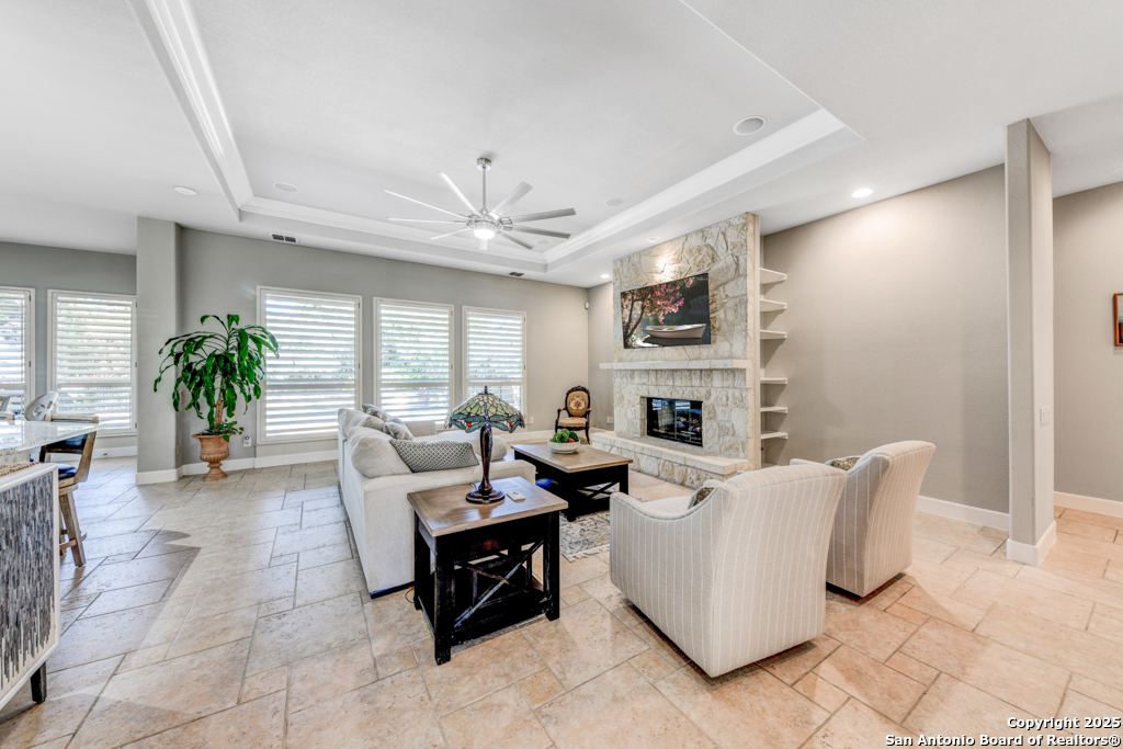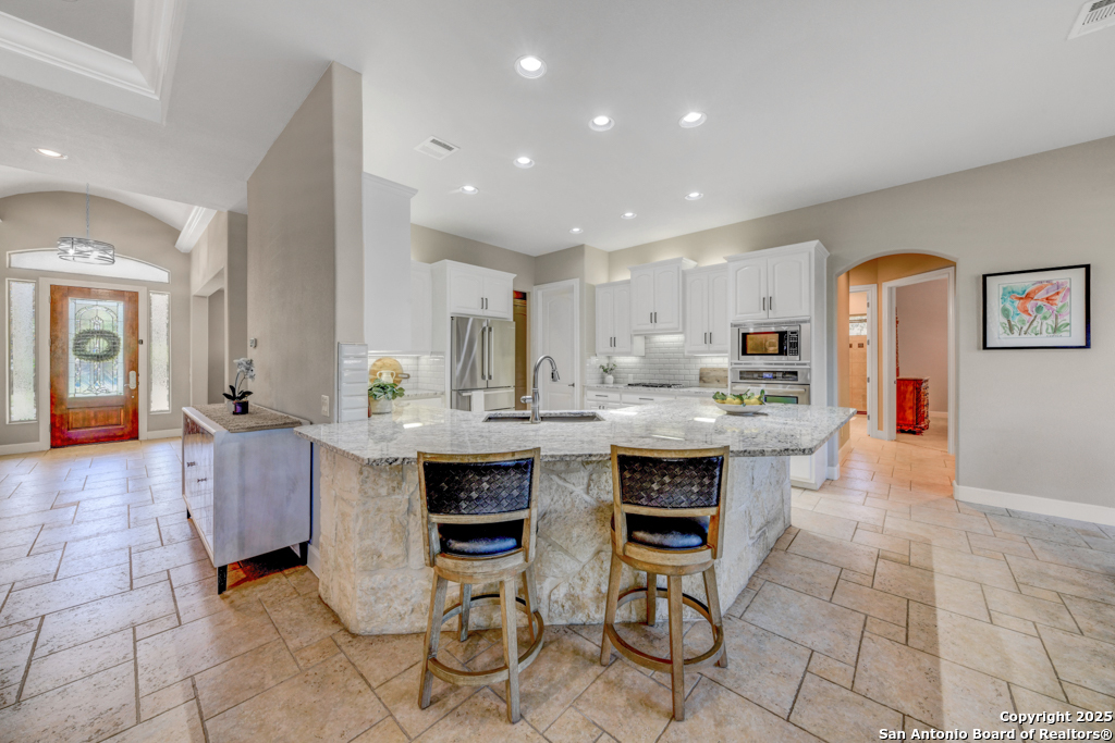 Open houses Sunday 11/23 4-6 and Monday 11/24 from 1-3! Discover luxury, privacy, and everyday comfort in this beautifully appointed single-story 4-bedroom home (with one bedroom currently used as an office/den) situated in the highly desirable gated community Sonoma Ranch. Set on an expansive 0.4+ acre greenbelt lot, this property offers peaceful views, multiple patios, and a sparkling swimming pool surrounded by mature trees-your own private retreat. Inside, the open, light-filled layout showcases a thoughtfully updated kitchen featuring a gas cooktop, built-in oven and microwave, miles of granite countertops, a generous breakfast bar, wine refrigerator, and a walk-in pantry. Plus a pocket office for work or planning. The spacious primary suite features beautiful wood floors and private outdoor access, creating a warm and inviting retreat. The adjoining spa-like bath includes dual vanities, a jetted soaking tub, a large walk-in shower, and a shopaholic-sized closet designed for exceptional organization. Car enthusiasts and hobbyists will appreciate the oversized 3-car tandem garage with high ceilings and 5-panel garage doors-perfect for taller vehicles, oversized equipment, or a workshop setup. Sprinkler system and plumbed for water softener. With quick access to Loop 1604, I-10, UTSA, Valero, Medtronic, La Cantera, The Rim, the Medical Center, shopping, grocery stores, and highly regarded NISD schools, this home offers the ultimate blend of convenience and upscale living. A rare combination of space, style, and setting-come see why this one stands out from the rest!