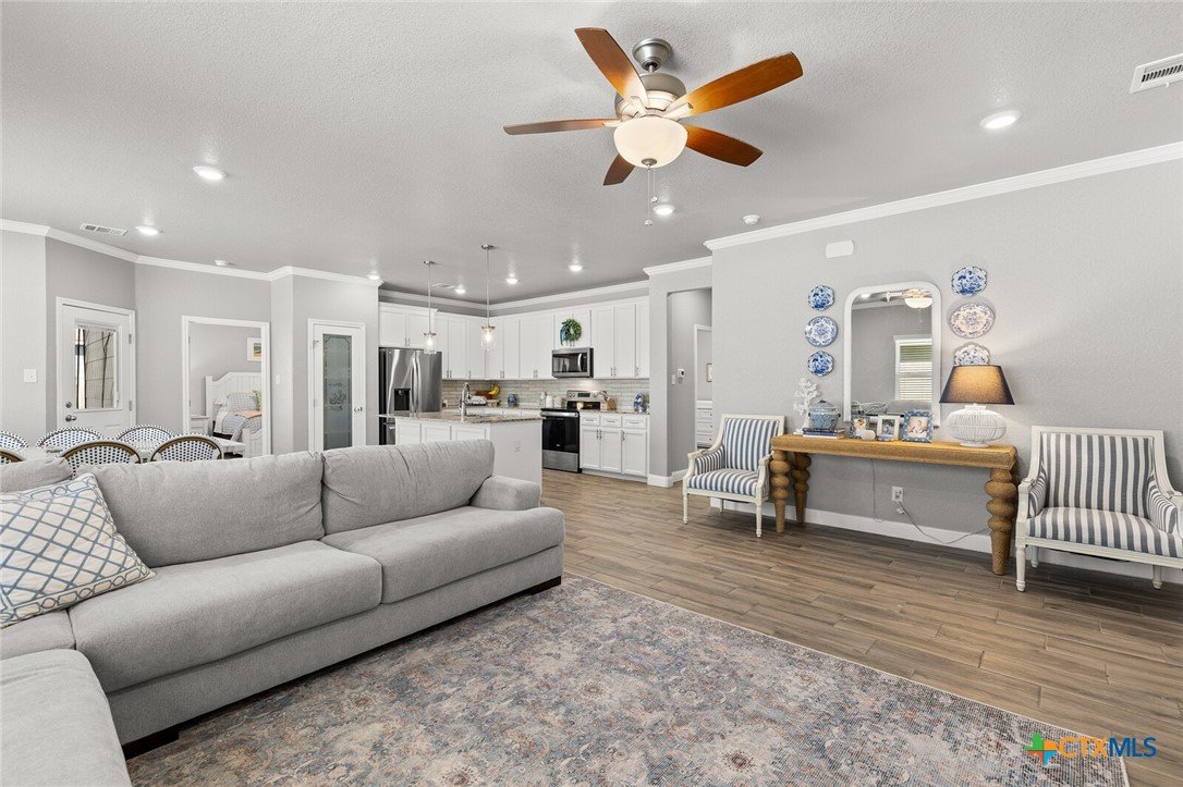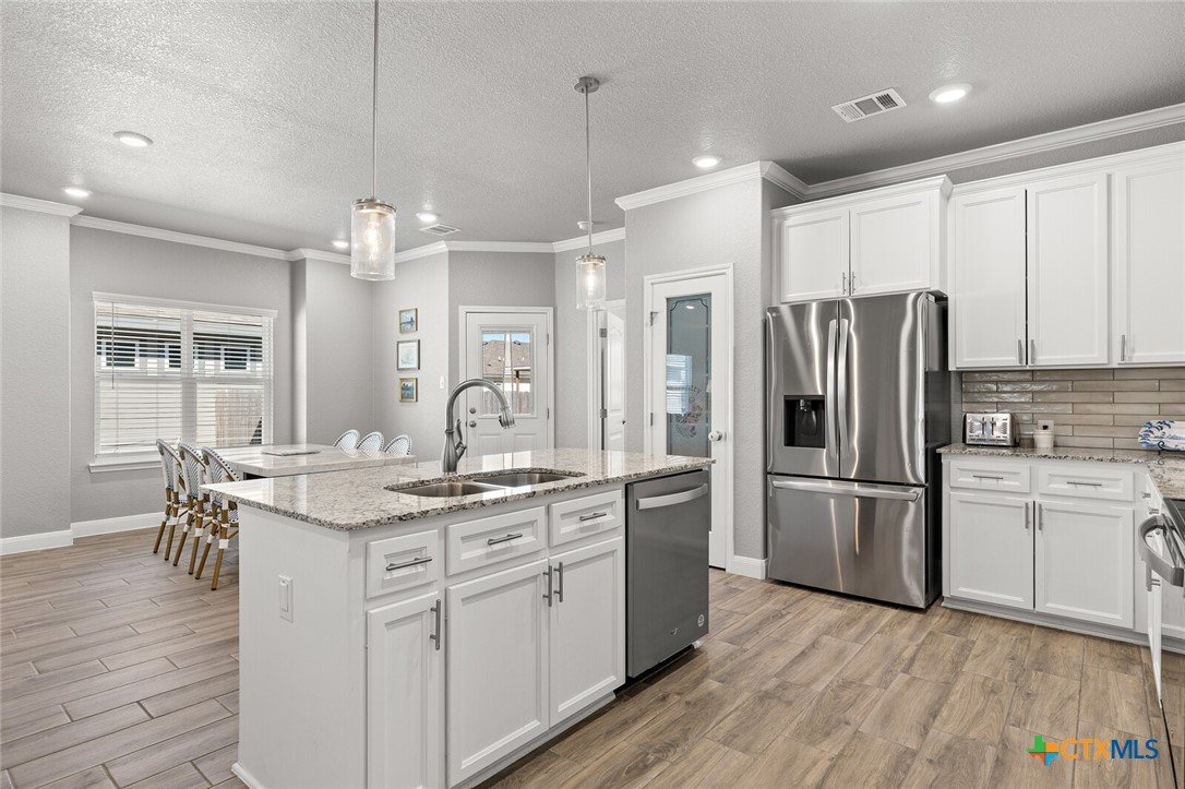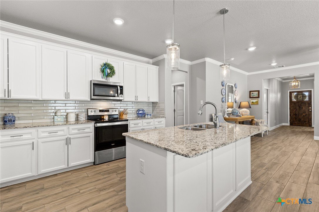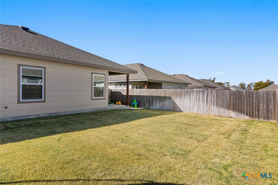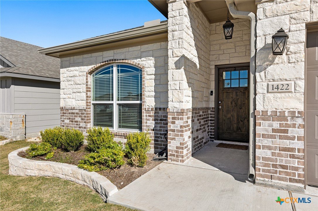 STUNNING 4-BEDROOM, 3-BATH HOME SHOWCASING EXCEPTIONAL QUALITY BY JERRY WRIGHT HOMES. From the moment you arrive, the curb appeal shines with an Austin stone and brick exterior accented by board-and-batten details and charming craftsman touches—plus a gutter system for easy maintenance. Inside, a huge great room brings the kitchen, living, and dining spaces together in one open, airy layout—surrounded in crown molding & perfect for entertaining while offering plenty of flexibility for furniture arrangements and gathering zones. The light and bright island kitchen is a true centerpiece, featuring a plethora of cabinets, stainless steel appliances, granite countertops with an attractive backsplash, and a dedicated pantry for extra storage. “Room for a crowd” adequately describes the spacious dining area, complete with a window cut-out and just steps from the backyard door for easy indoor/outdoor flow. A smart split-bedroom design provides privacy for everyone, including a standout bedroom right off the entry with its own ensuite bath—ideal for guests, teens, older parents, or a private home office. The other two secondary bedrooms are good sizes and are steps away from both laundry room & third bath. The primary suite is a relaxing retreat and opens into a double-vanity bath complete with a private toilet, soaking tub and separate shower. Outside, everything is already in place: a fully covered back patio, beautiful landscaping, & a sprinkler system surrounded by a privacy fence. Move-in ready and packed with thoughtful features—don’t miss this one! Ideal possession: May/June timeframe.