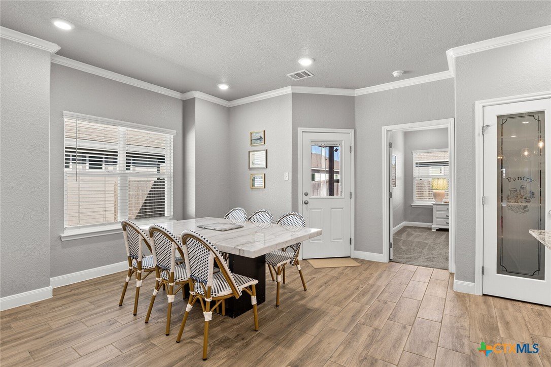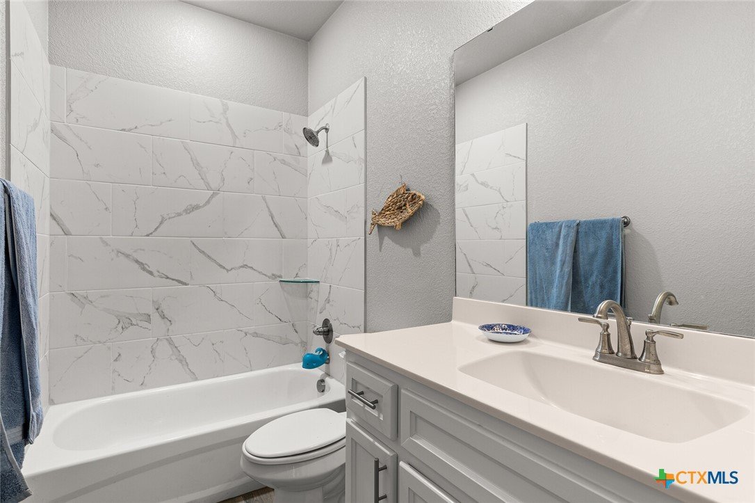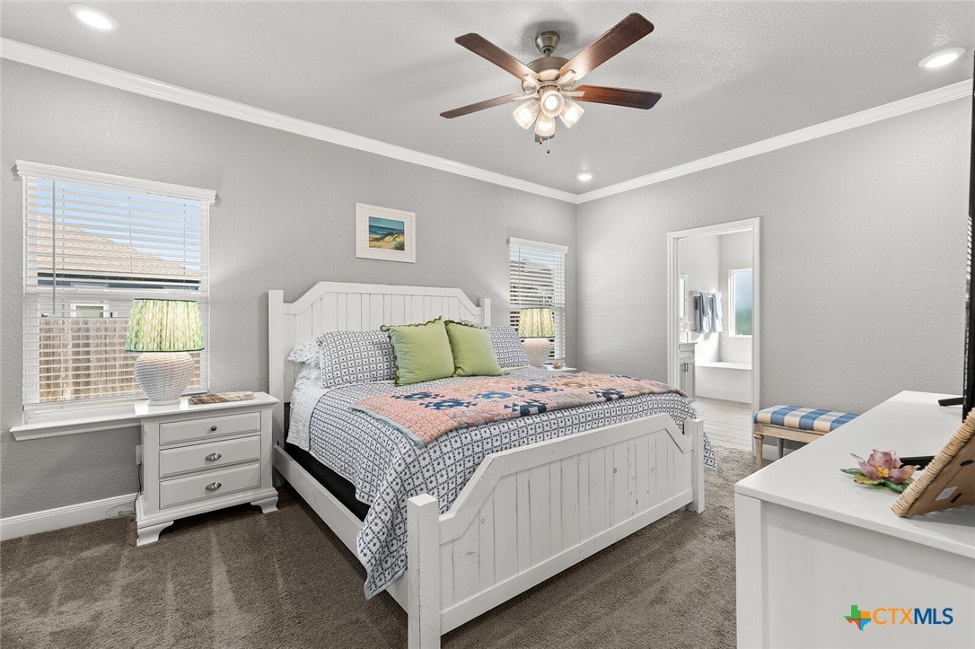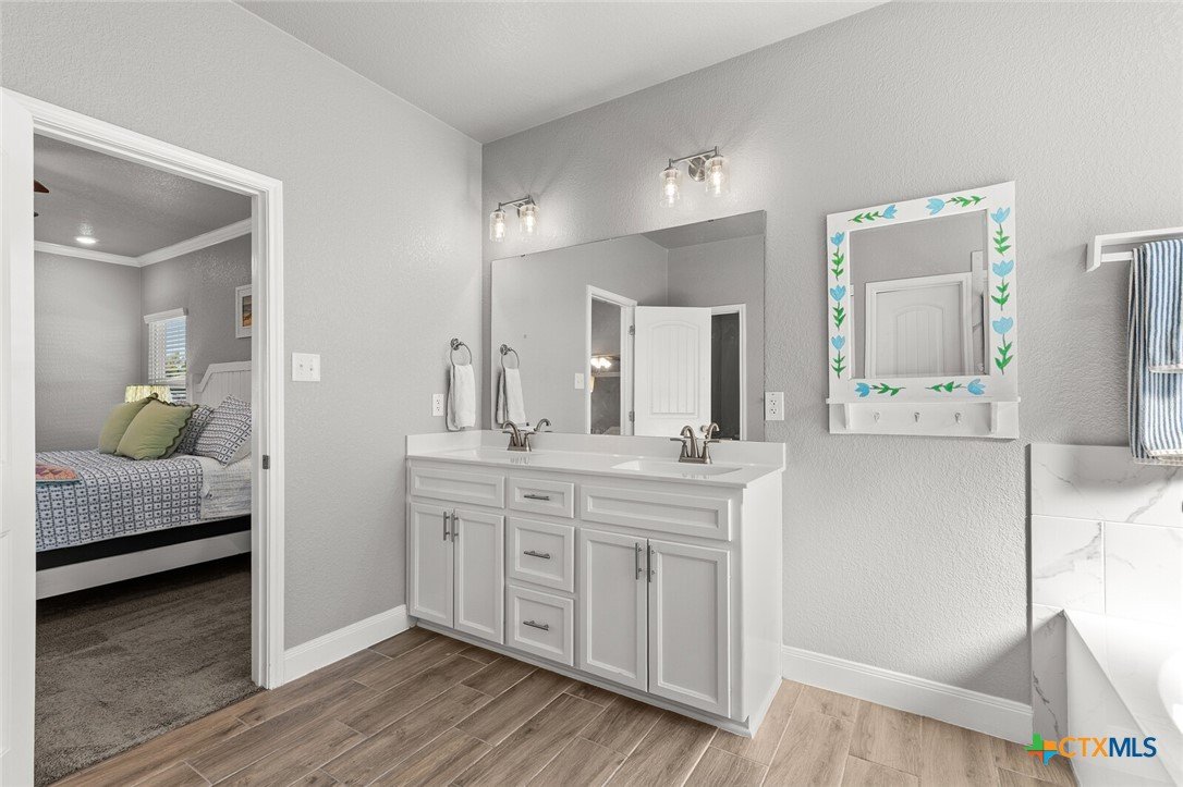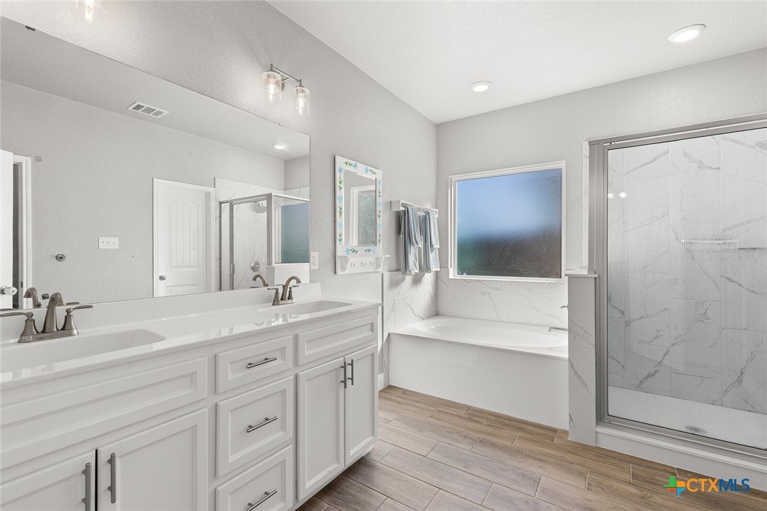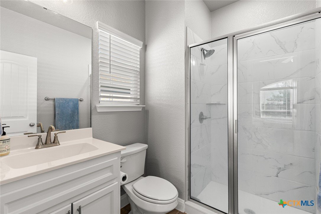 STUNNING 4-BEDROOM, 3-BATH HOME SHOWCASING EXCEPTIONAL QUALITY BY JERRY WRIGHT HOMES. From the moment you arrive, the curb appeal shines with an Austin stone and brick exterior accented by board-and-batten details and charming craftsman touches—plus a gutter system for easy maintenance. Inside, a huge great room brings the kitchen, living, and dining spaces together in one open, airy layout—surrounded in crown molding & perfect for entertaining while offering plenty of flexibility for furniture arrangements and gathering zones. The light and bright island kitchen is a true centerpiece, featuring a plethora of cabinets, stainless steel appliances, granite countertops with an attractive backsplash, and a dedicated pantry for extra storage. “Room for a crowd” adequately describes the spacious dining area, complete with a window cut-out and just steps from the backyard door for easy indoor/outdoor flow. A smart split-bedroom design provides privacy for everyone, including a standout bedroom right off the entry with its own ensuite bath—ideal for guests, teens, older parents, or a private home office. The other two secondary bedrooms are good sizes and are steps away from both laundry room & third bath. The primary suite is a relaxing retreat and opens into a double-vanity bath complete with a private toilet, soaking tub and separate shower. Outside, everything is already in place: a fully covered back patio, beautiful landscaping, & a sprinkler system surrounded by a privacy fence. Move-in ready and packed with thoughtful features—don’t miss this one! Ideal possession: May/June timeframe.