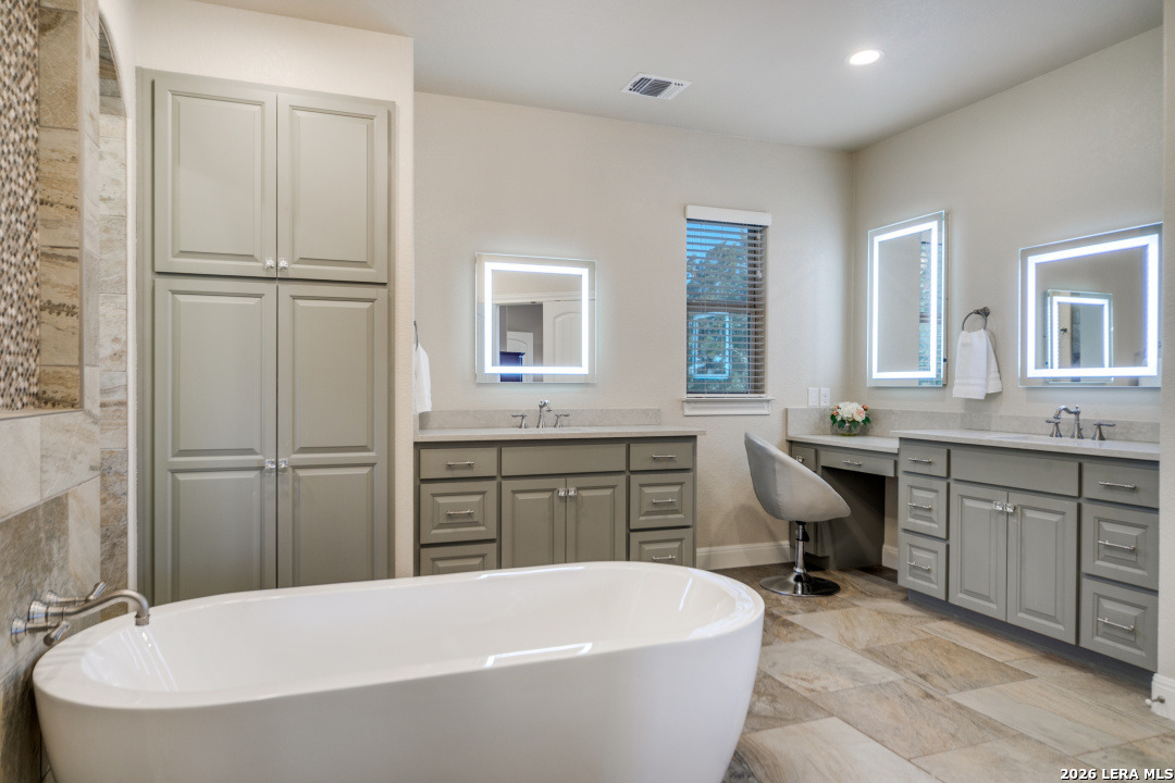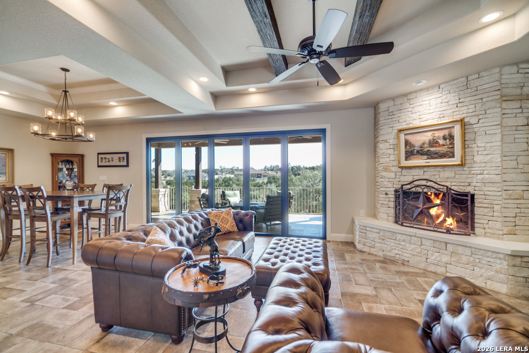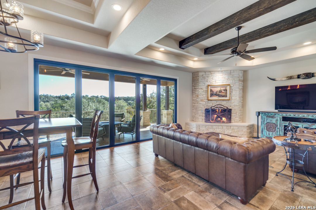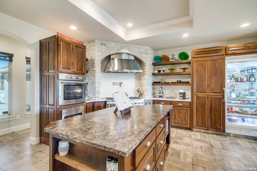 Gourmet Chef's Dream! Come and see this Country Views & Low maintenance yard! It is a Must See! Beautiful Hill Country home sitting on over 2 acres of land in highly desired Vintage Oaks! This meticulous maintained 3BR 2.5 Bath Oversized 2 Car Gar home features an office/study, Thermador appliances, Built-in Refrigerator with custom cabinetry. Spacious family room with wood burning fireplace and oversized windows with unobstructed hill country views. Large secondary bedrooms with a Jack and Jill bath. The Main bedroom and secondary bedroom both have exterior access to the patio. The main bathroom features a luxurious bath and separate shower; double vanities and utility room conveniently attached to master closet. Fold-up Sliding door to bring the Outdoors in! This oversized lot sits on a cul-de-sac. Enjoy the views from your covered back patio perfect for entertaining! Welcome Home!