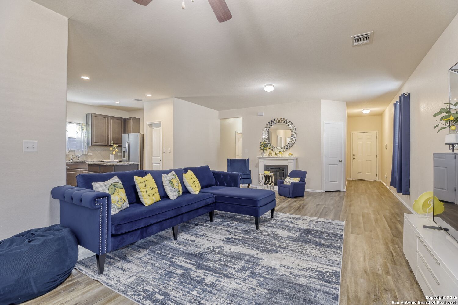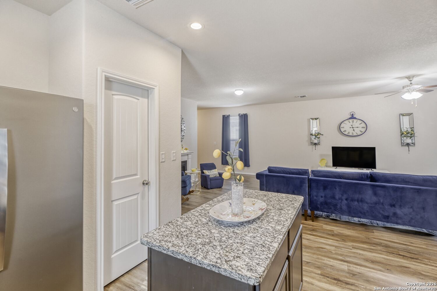 Welcome home to this well-cared-for, one-owner property that offers comfort, style, and effortless single-story living in a quiet, family-friendly neighborhood. The inviting stone exterior, covered front porch, and finished garage create attractive curb appeal and a welcoming first impression. Inside, a spacious open floor plan provides an easy flow for both everyday living and entertaining. The large kitchen is designed to impress with rich dark mocha cabinetry, granite countertops, and an open layout that connects seamlessly to the main living area, making it ideal for gatherings or casual meals. The private primary suite is thoughtfully positioned at the back of the home for added privacy and features durable laminate flooring. Additional living spaces are bright and functional, offering flexibility to suit a variety of lifestyles. Step outside to a great-sized, fully fenced backyard with room to relax, play, or personalize to your needs. Minutes away from Gruene, Creekside, River access, Downtown Shopping, dining and fun, this move-in-ready home is full of charm and perfectly suited for first-time buyers or anyone seeking a comfortable, low-maintenance lifestyle.