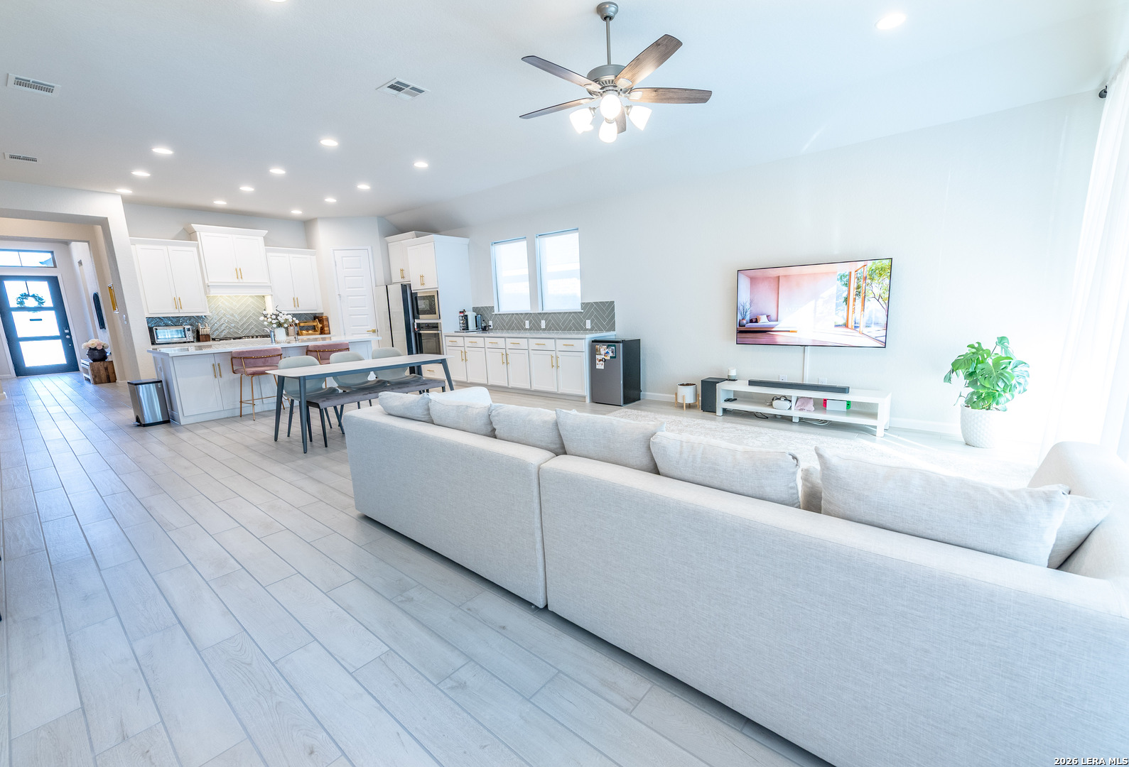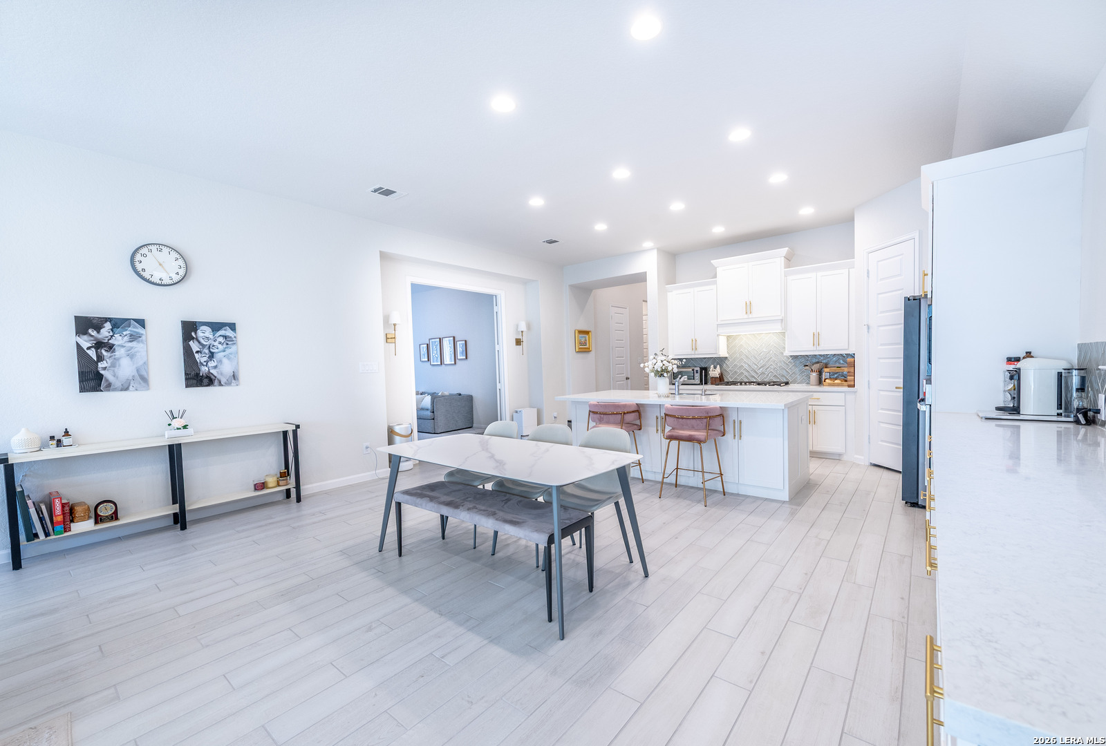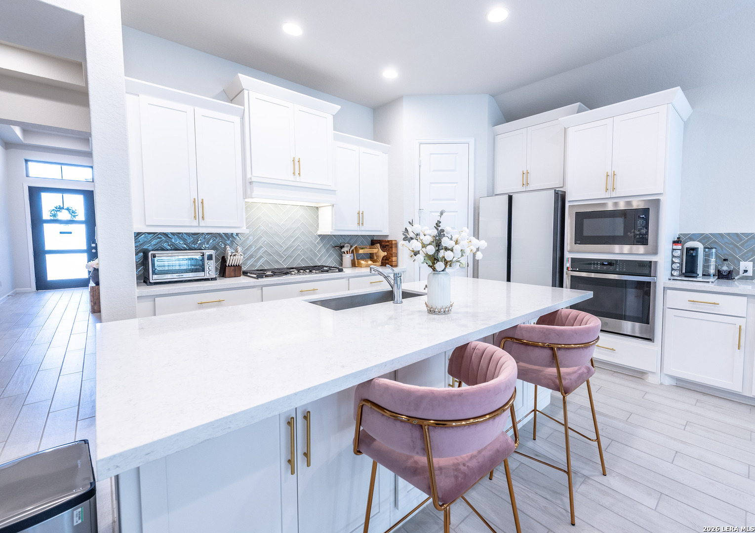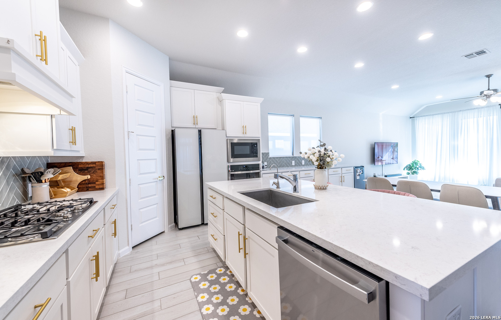 Step into elevated living in this beautifully well-appointed single-story home with a grand 12-foot ceiling entry, designed for intimate elegance and smartly upgraded finishes and model-perfect presentation from the moment you arrive. From the impressive 8-foot doors to the seamless flow of the open layout, every detail reflects pride of ownership and thoughtful upgrades. Elegant hardwood plank tile flooring throughout the main living areas and game room, paired with plush carpet in the bedrooms, creates both style and comfort. The open-concept layout and kitchen are a true showpiece-featuring quartz countertops, generous counter space, a 5-burner gas cooktop, walk-in pantry, and an oversized island with ample seating, perfect for entertaining guests or casual family gatherings. The open dining room flows effortlessly into the spacious family room, creating an ideal space for modern living and hosting. A large game room with glass French doors offers flexibility as a media room, home office, or play space. The oversized primary suite is a private retreat, complete with a luxurious spa-like bathroom showcasing a beautiful soaking tub, extended tile walk-in shower, dual vanities, and two spacious his-and-her closets. Three additional generously sized bedrooms provide comfort and privacy, including one with a private en-suite bath and another with its own dedicated bath, ideal for guests or multi-generational living. Designed with efficiency and peace of mind in mind, this home includes: Water softener plumbing || Carbon monoxide detectors || Pre-wired security system || Tesla charger pre-wired and installed || Double-pane energy-efficient windows || Gutter system || Ceiling fans throughout Step outside to enjoy the covered backyard patio, privacy fence, and beautifully landscaped yard-perfect for relaxing evenings or weekend gatherings. This move-in ready, energy-efficient home blends designer finishes, smart home features, and timeless elegance-all in a highly desirable single-story layout that truly feels like walking into a model home. Come experience the style, space, and sophistication for yourself. Schedule your private tour and experience thoughtfully designed, comfort, and modern convenience all in one stunning home.