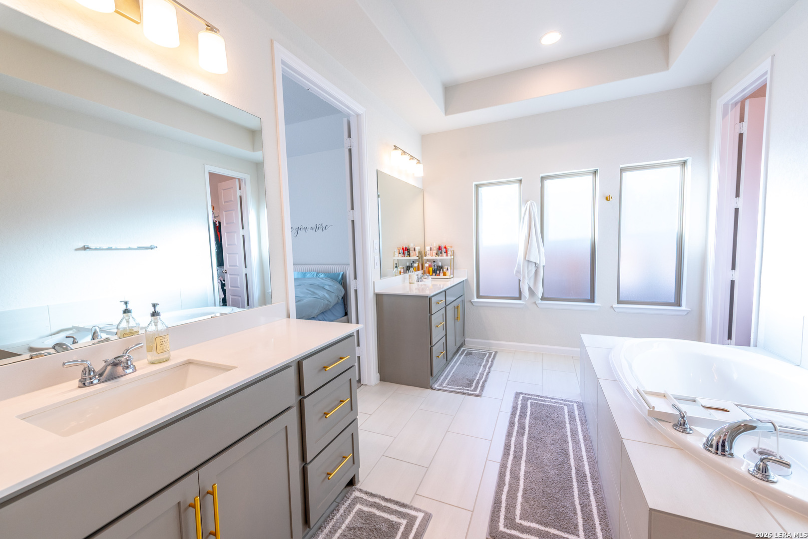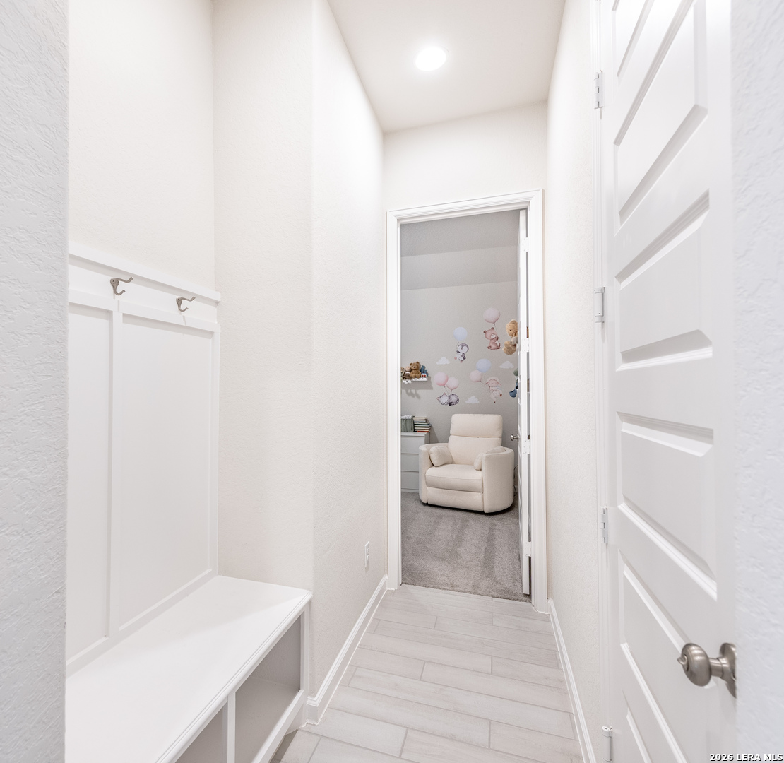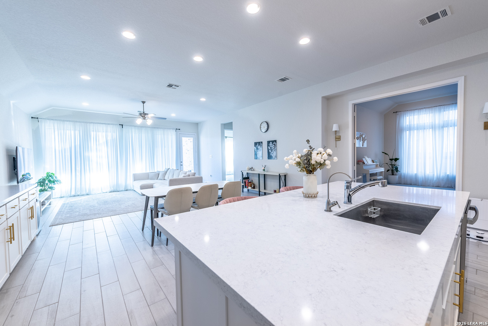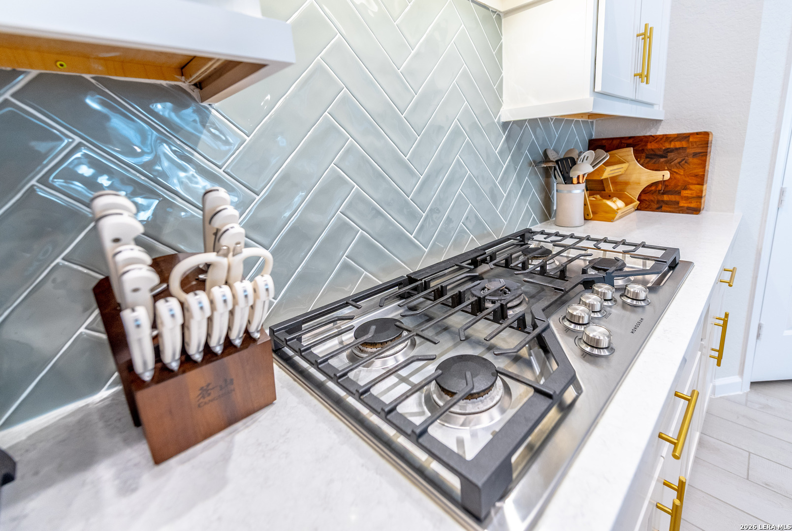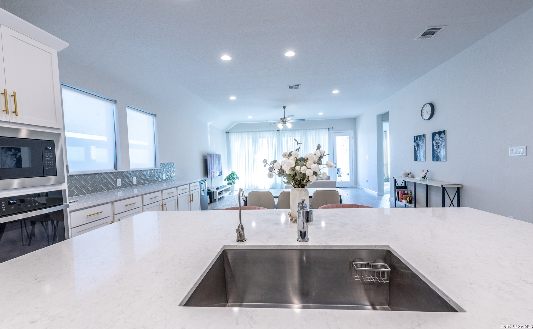 Step into elevated living in this beautifully well-appointed single-story home with a grand 12-foot ceiling entry, designed for intimate elegance and smartly upgraded finishes and model-perfect presentation from the moment you arrive. From the impressive 8-foot doors to the seamless flow of the open layout, every detail reflects pride of ownership and thoughtful upgrades. Elegant hardwood plank tile flooring throughout the main living areas and game room, paired with plush carpet in the bedrooms, creates both style and comfort. The open-concept layout and kitchen are a true showpiece-featuring quartz countertops, generous counter space, a 5-burner gas cooktop, walk-in pantry, and an oversized island with ample seating, perfect for entertaining guests or casual family gatherings. The open dining room flows effortlessly into the spacious family room, creating an ideal space for modern living and hosting. A large game room with glass French doors offers flexibility as a media room, home office, or play space. The oversized primary suite is a private retreat, complete with a luxurious spa-like bathroom showcasing a beautiful soaking tub, extended tile walk-in shower, dual vanities, and two spacious his-and-her closets. Three additional generously sized bedrooms provide comfort and privacy, including one with a private en-suite bath and another with its own dedicated bath, ideal for guests or multi-generational living. Designed with efficiency and peace of mind in mind, this home includes: Water softener plumbing || Carbon monoxide detectors || Pre-wired security system || Tesla charger pre-wired and installed || Double-pane energy-efficient windows || Gutter system || Ceiling fans throughout Step outside to enjoy the covered backyard patio, privacy fence, and beautifully landscaped yard-perfect for relaxing evenings or weekend gatherings. This move-in ready, energy-efficient home blends designer finishes, smart home features, and timeless elegance-all in a highly desirable single-story layout that truly feels like walking into a model home. Come experience the style, space, and sophistication for yourself. Schedule your private tour and experience thoughtfully designed, comfort, and modern convenience all in one stunning home.
