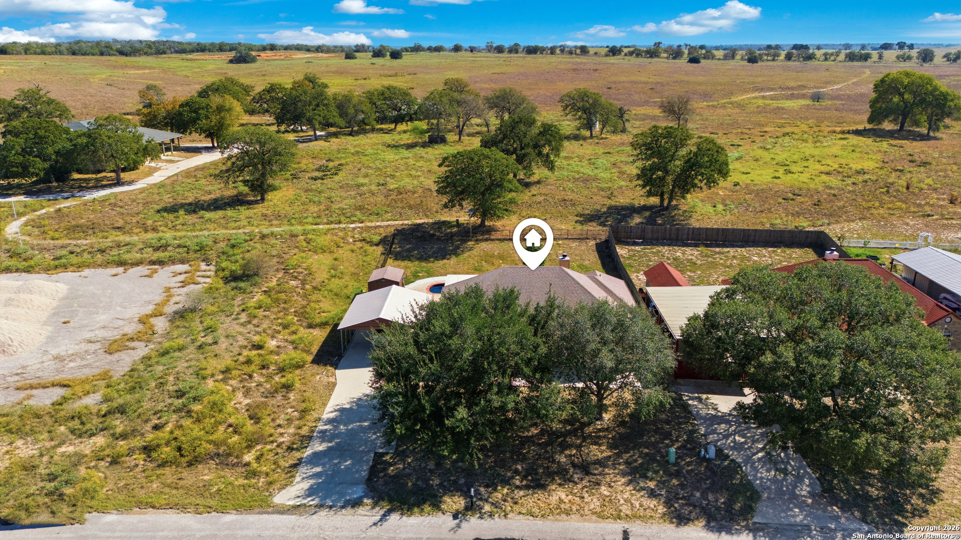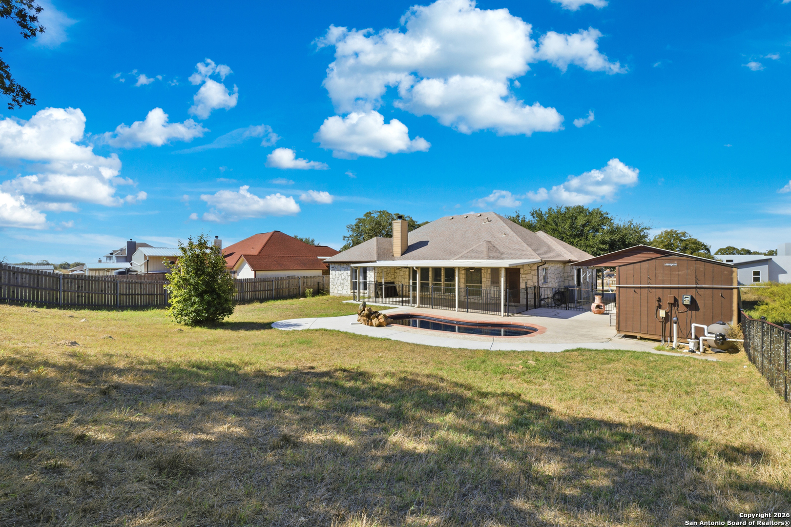 Welcome to your private retreat in the highly desirable Las Palomas subdivision! This beautiful one story home is full of charm and thoughtful features, starting with its inviting curb appeal, mature trees, and generous spacing between neighbors for added privacy. The wide driveway offers plenty of parking, enough for four or more vehicles, along with a convenient two car carport. Step inside to discover an open floor plan filled with natural light and a welcoming flow. To your right, you'll find a spacious guest bedroom with a walk-in closet, followed by a renovated bathroom. The primary suite is impressively sized, complete with an updated ensuite bathroom offering dual sinks and a walk-in shower. A third bedroom with no carpet and its own walk-in closet adds flexibility for guests or family. The living room serves as the heart of the home, featuring a cozy fireplace and ample space for family gatherings, seamlessly connecting to the dining area and kitchen. The kitchen boasts great cabinet storage, a center island for prep space, and a walk-in pantry. Off the laundry room, you'll find an additional living space, perfect as a man cave, second living area, or potential 4th bedroom. Step outside to your backyard oasis, where an oversized covered patio overlooks a sparkling pool, ideal for enjoying those warm Texas summers. The patio is safely fenced in for kids or pets, and the large over quarter-acre lot provides plenty of green space plus a storage shed. Best of all, the property backs up to what was once a golf course, giving you no back or side neighbors and endless peaceful views. Homes in this serene setting are rare, don't miss your chance to make this one yours today!