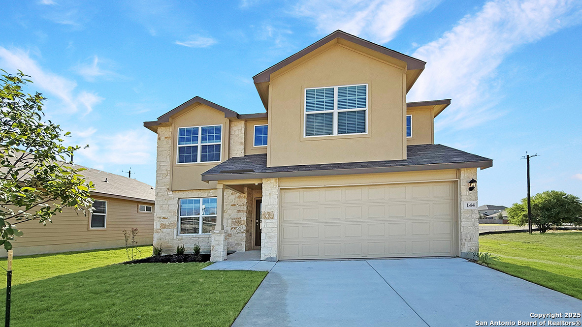 Introducing The Lombardi, a two-story home featured in our Redbird Ranch community in San Antonio, TX. This floor plan offers 3 classic front exteriors, a 2-car garage, and a full yard landscaping and irrigation package ensuring that your home looks its best every single day. Inside this 5 bedroom, 2.5 bathroom home, you'll find 2539 square feet of open-concept living. A deep-set, covered porch (per plan) opens to a foyer, formal dining room, and powder room. A butler entry connects the dining room and spacious kitchen lined with abundant cabinetry and quartz-top counterspace. Classic white subway tile backsplash and stainless steel appliances are a perfect accent, and a kitchen island with a deep single basin kitchen sink faces the living room. The private main bedroom suite is located off the living room and features a luxurious garden bath tub, a separate walk-in shower with tile surround, double vanity sinks, ceramic tile flooring, a separate door for the toilet and a large walk-in closet. Head up the stairs and tour the second floor of your brand new home! A versatile loft area greets you at the top of the stairs, complete with quality carpet and tons of natural light. Your four secondary bedrooms are located off the loft and include carpet flooring and spacious walk-in closets. Additional features include 9-foot ceilings, 2-inch faux wood blinds throughout the home, luxury vinyl plank flooring in the entryway, living room, kitchen, and dining room, ceramic tile at all bathrooms and utility room, pre-plumb for water softener loop, and more! You'll enjoy added security in your new home with our Home is Connected features. Using one central hub that talks to all the devices in your home, you can control the lights, thermostat and locks, all from your cellular device.