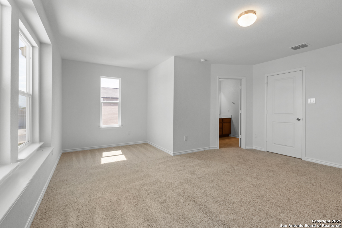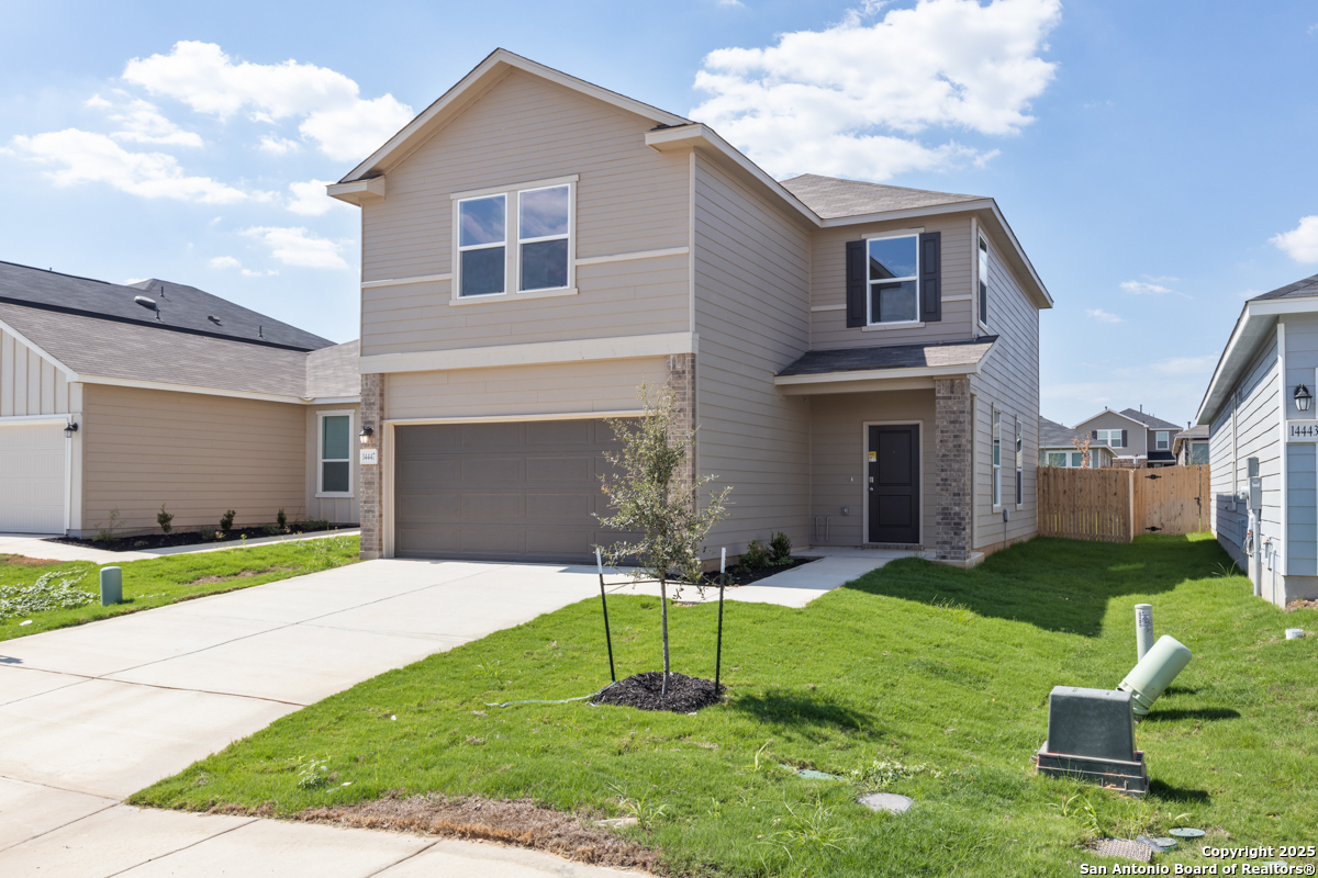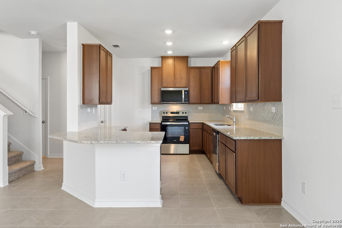 Experience comfort and style in this thoughtfully designed home featuring 9-ft. first-floor ceilings. The kitchen shines with Whirlpool stainless steel appliances, Woodmont Cody 42-in. upper cabinets, a Daltile tile backsplash, a walk-in pantry, and an extended breakfast bar ideal for casual meals. The primary bath offers a raised vanity, upgraded cabinets, and a 42-in. shower with a Daltile tile surround. Decorative details include a Carrara-style entry door, Kwikset Polo interior knobs, and Coastline ceramic tile flooring in the bathrooms, kitchen, and great room. Enjoy added convenience with a wireless security system, automatic sprinkler system, and fully sodded yard.
