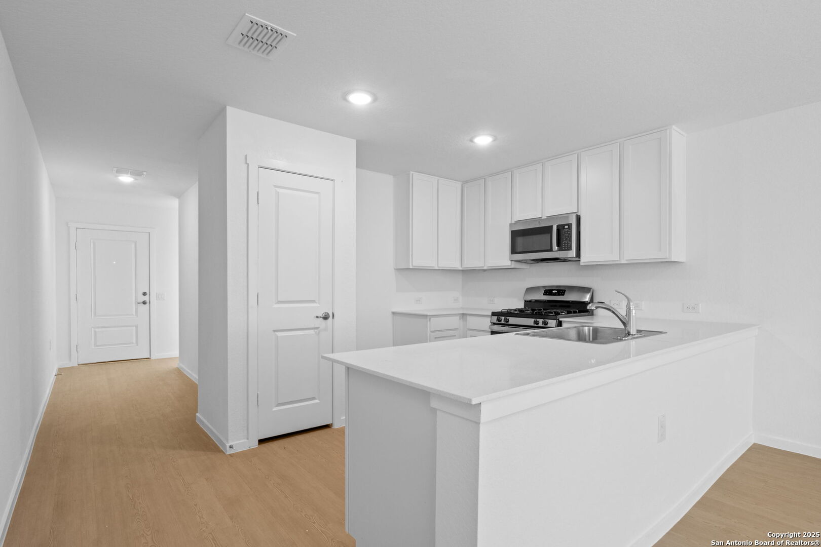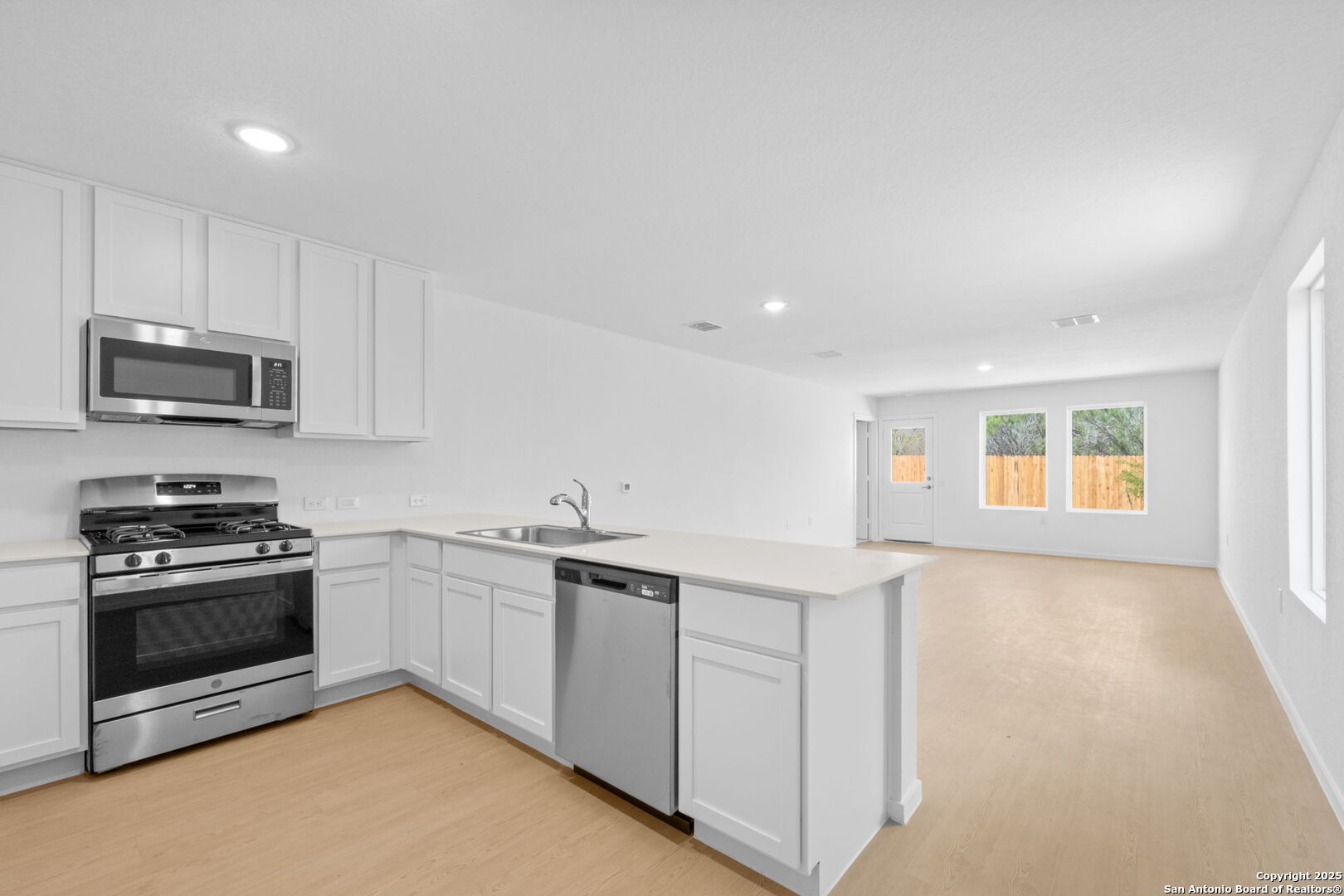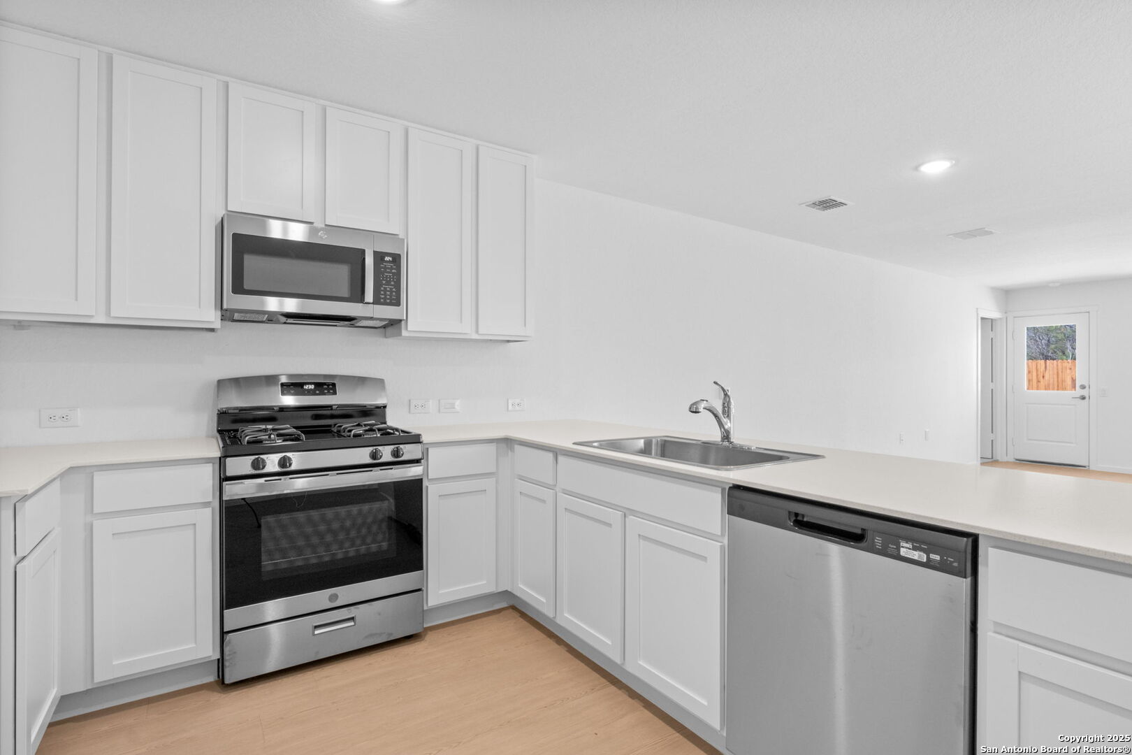 50% OFF OF FIRST MONTH'S RENT IF LEASE IS SIGNED BY 11/30/2025. Brand new home backing up to a greenbelt. Amenities include REFRIGERATOR, WASHER/DRYER, GARAGE DOOR OPENER AND IRRIGATION. Don't miss this opportunity to enjoy new-home living in the beautiful Vida subdivision. Coming soon!! Community recreation center and swimming pool to along with a community park, picnic tables and a walking/jogging trail!! Wonderful for family or student living. This 3 bedroom home offers an open floorplan, quartz island kitchen with designer white cabinets, stainless appliances including a brand new refrigerator and gas cooking for the gourmet chef. Large walk-in closet in private primary bedroom separated from the two secondary bedrooms. Ask about a $40 monthly rate for internet services with Hotwire Communications already installed in the home. Beautiful master-planned community centrally located at the entry to the new Texas A&M and just minutes to downtown San Antonio and Lackland Air Force base.