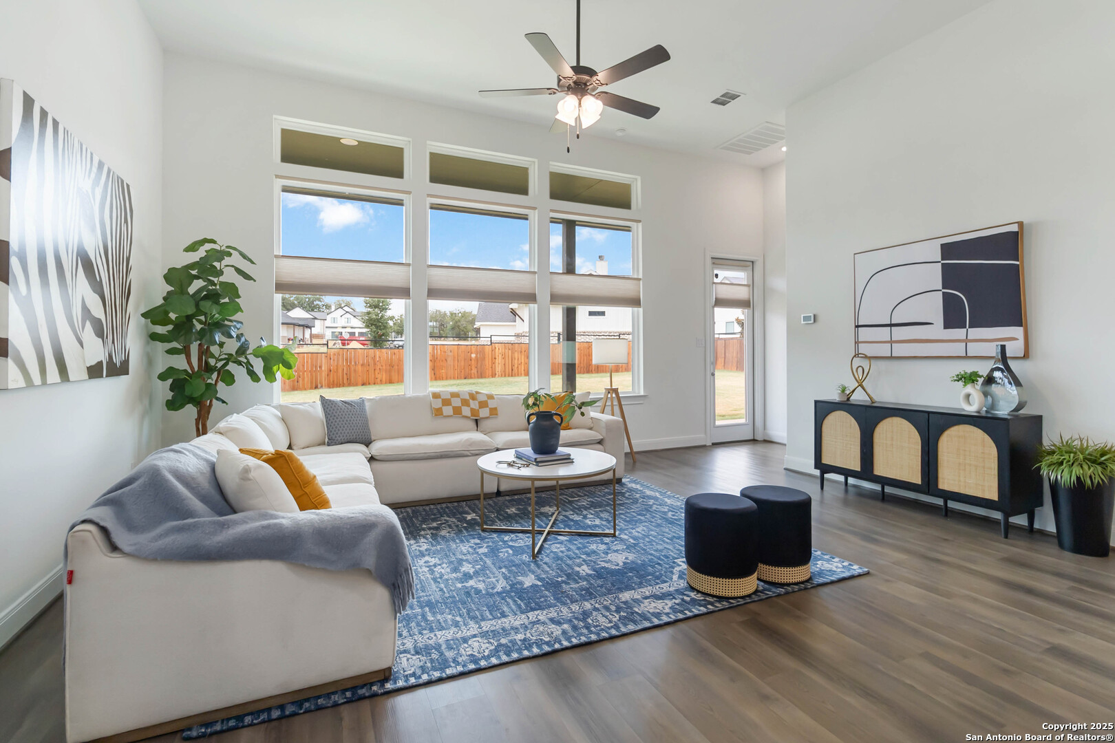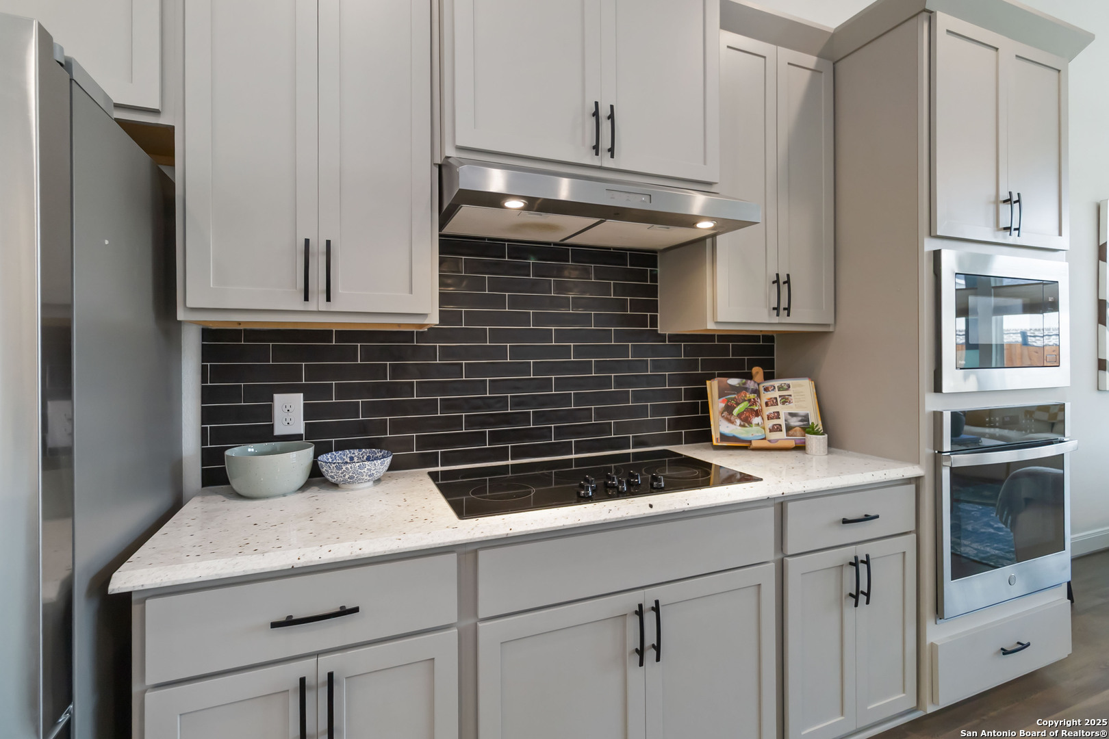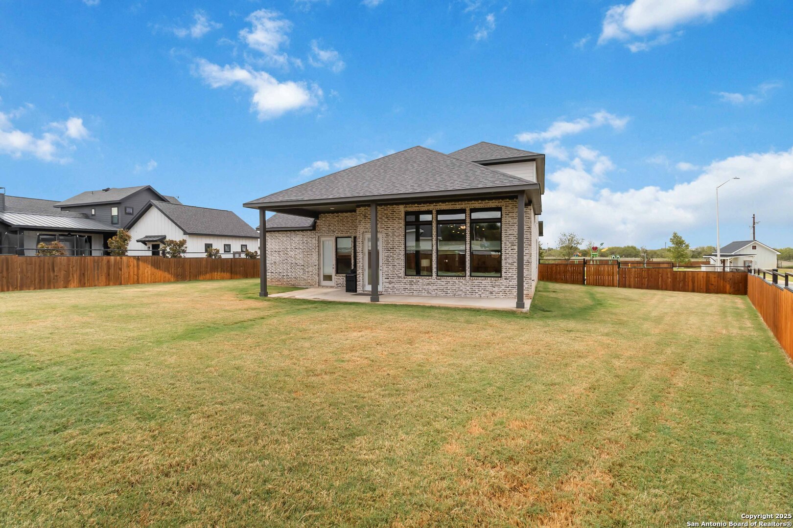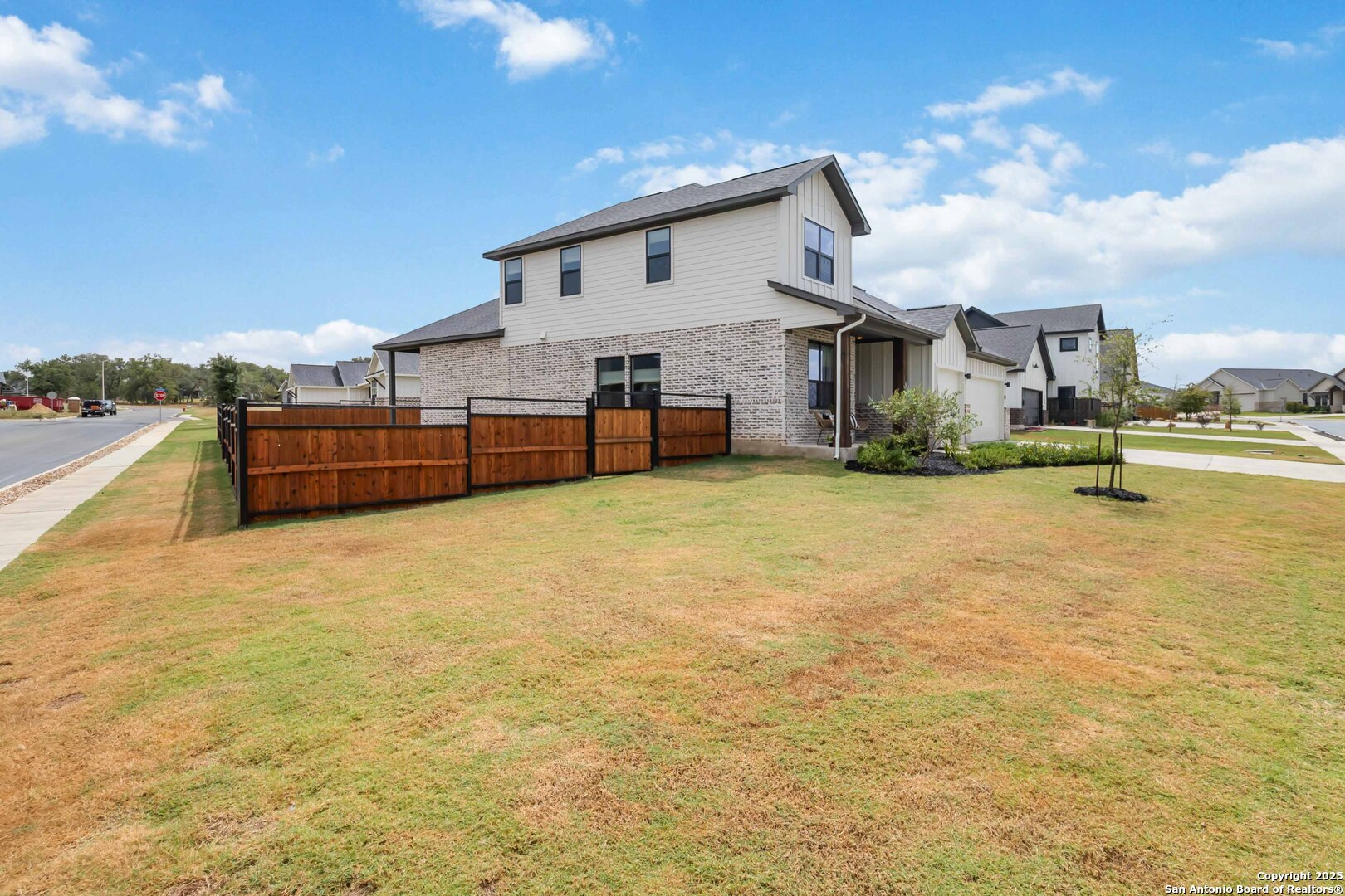 **Price Improvement** Luxurious modern farmhouse on over .3 of an acre in the gated community of Woodbridge Farms in #LaVerniaTX. Better than new and move-in ready! 2,537 sq ft, 4 bedrooms, 2.5 bathrooms, office, bonus room and a 3-car garage. Soaring ceilings and an abundance of natural light flood this home. Dream kitchen with upgraded appliances including flat cooktop, built-in oven, microwave, dishwasher and refrigerator. Walk-in pantry, double islands with breakfast bar and tons of storage that is highlighted by custom woodwork and built-ins. Separate dining area that is perfect for hosting parties and meals. The open concept flow and large picture windows in the living area make enjoying your backyard view a breeze. Versatile downstairs space perfect for dedicated home office, cozy den or 5th bedroom. The split primary bedroom is located downstairs providing privacy and features bay windows, coffered tray ceiling with a ceiling fan, and plenty of space for relaxation. The primary bath offers upgraded designer tile flooring, spacious shower, soaker tub, dual sink vanity, framed mirrors, and a huge walk-in closet. The home boasts an expansive upstairs bonus room as well as a separate built-in media area for studies or crafts. Secondary bedrooms with large walk-in closets and a spacious bathroom. Phenomenal laundry room with large storage area. Additional premium upgrades include: Tesla 240v charger, whole house water softener & filtration, reverse osmosis, new washer & dryer, refrigerator, full home EV wiring. Custom window coverings will convey. Corner lot, custom privacy fence, and the covered patio will have you enjoying the great outdoors. Conveniently located near the splashpad and park. This gorgeous hill country master-planned community has been thoughtfully landscaped with sidewalks, multiple parks, splash pad, basketball court and more. We invite you to embrace the pride of La Vernia and the traditions of living in the South! Call today before this one gets away!!