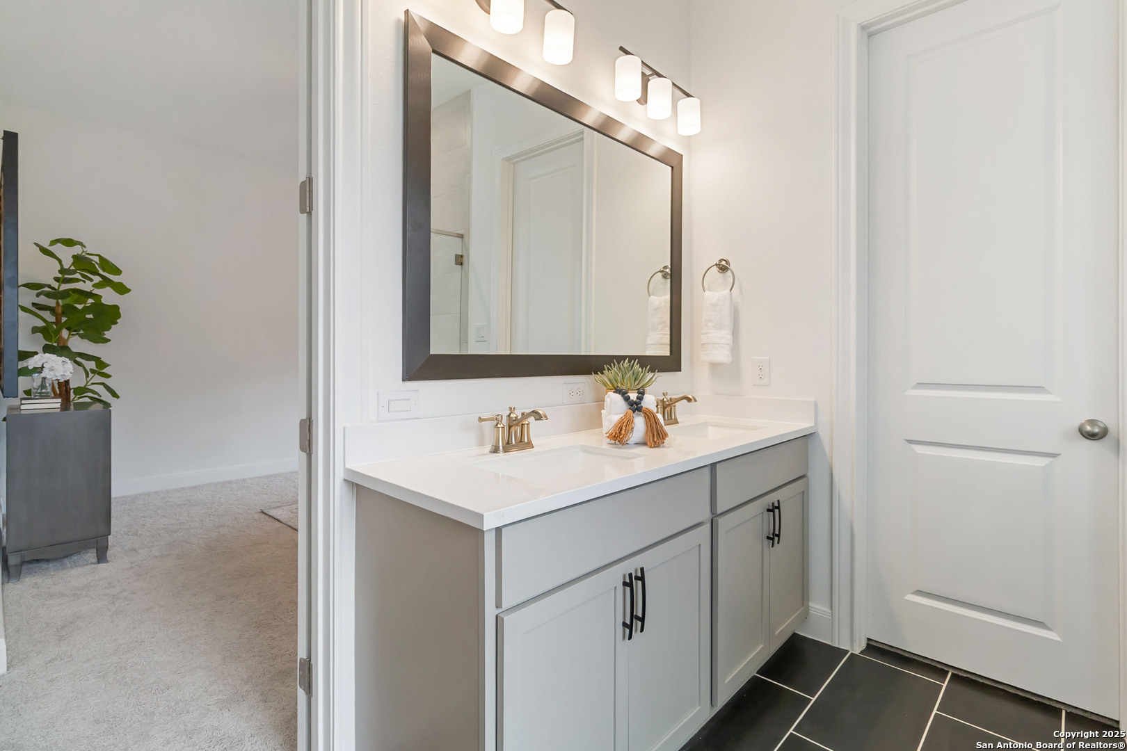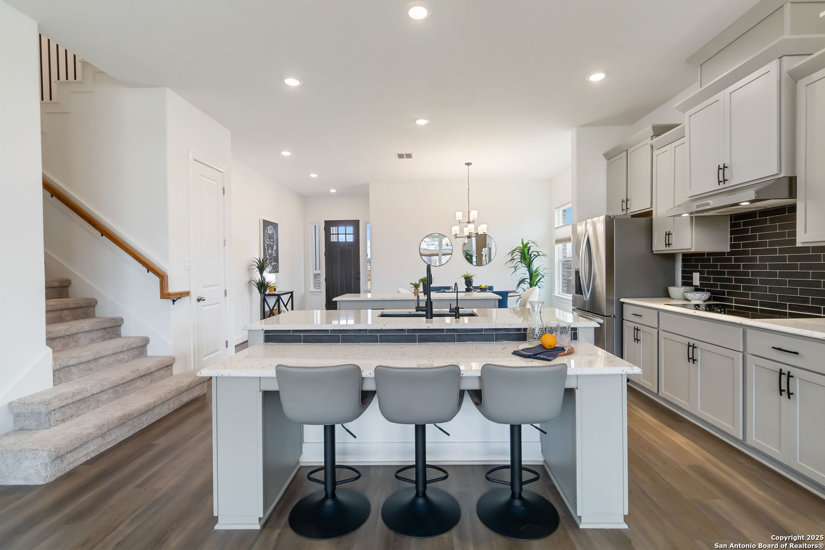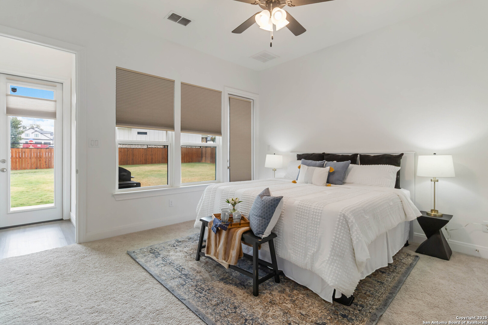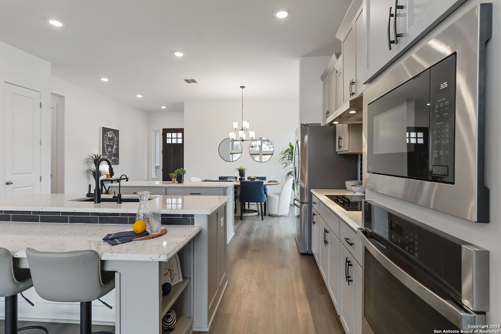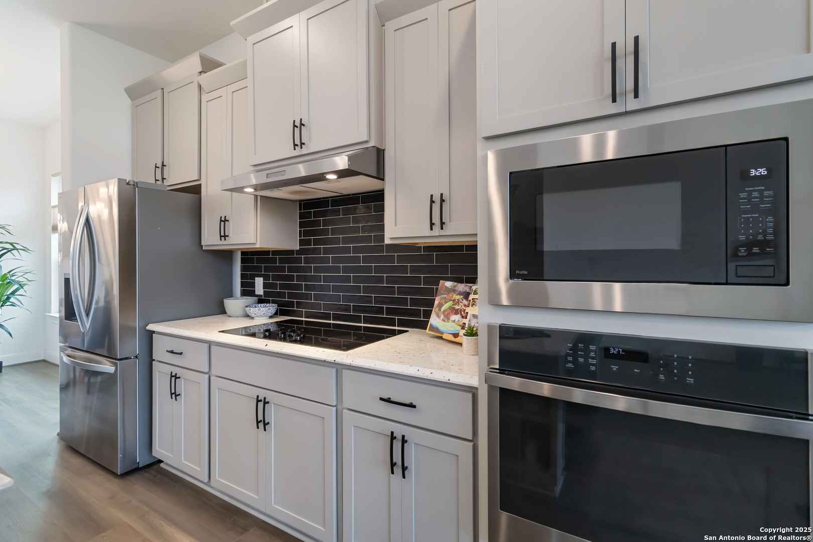 **Price Improvement** Luxurious modern farmhouse on over .3 of an acre in the gated community of Woodbridge Farms in #LaVerniaTX. Better than new and move-in ready! 2,537 sq ft, 4 bedrooms, 2.5 bathrooms, office, bonus room and a 3-car garage. Soaring ceilings and an abundance of natural light flood this home. Dream kitchen with upgraded appliances including flat cooktop, built-in oven, microwave, dishwasher and refrigerator. Walk-in pantry, double islands with breakfast bar and tons of storage that is highlighted by custom woodwork and built-ins. Separate dining area that is perfect for hosting parties and meals. The open concept flow and large picture windows in the living area make enjoying your backyard view a breeze. Versatile downstairs space perfect for dedicated home office, cozy den or 5th bedroom. The split primary bedroom is located downstairs providing privacy and features bay windows, coffered tray ceiling with a ceiling fan, and plenty of space for relaxation. The primary bath offers upgraded designer tile flooring, spacious shower, soaker tub, dual sink vanity, framed mirrors, and a huge walk-in closet. The home boasts an expansive upstairs bonus room as well as a separate built-in media area for studies or crafts. Secondary bedrooms with large walk-in closets and a spacious bathroom. Phenomenal laundry room with large storage area. Additional premium upgrades include: Tesla 240v charger, whole house water softener & filtration, reverse osmosis, new washer & dryer, refrigerator, full home EV wiring. Custom window coverings will convey. Corner lot, custom privacy fence, and the covered patio will have you enjoying the great outdoors. Conveniently located near the splashpad and park. This gorgeous hill country master-planned community has been thoughtfully landscaped with sidewalks, multiple parks, splash pad, basketball court and more. We invite you to embrace the pride of La Vernia and the traditions of living in the South! Call today before this one gets away!!