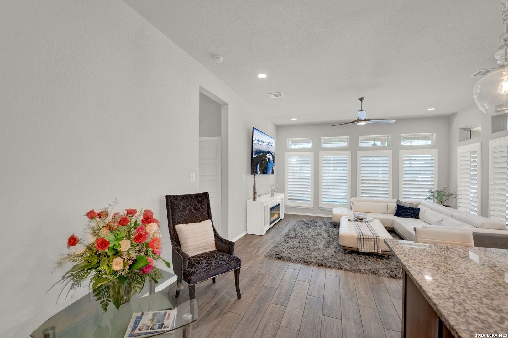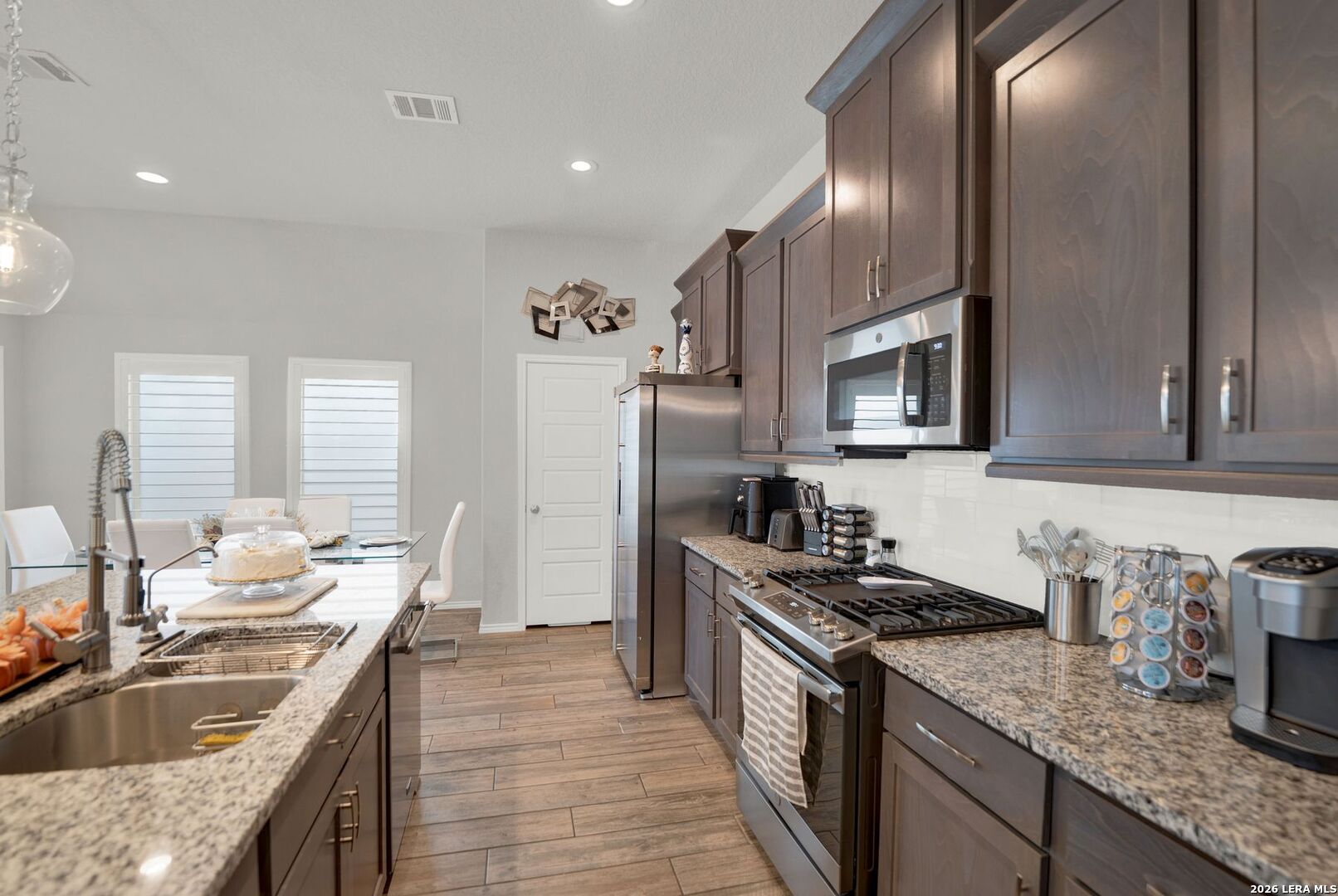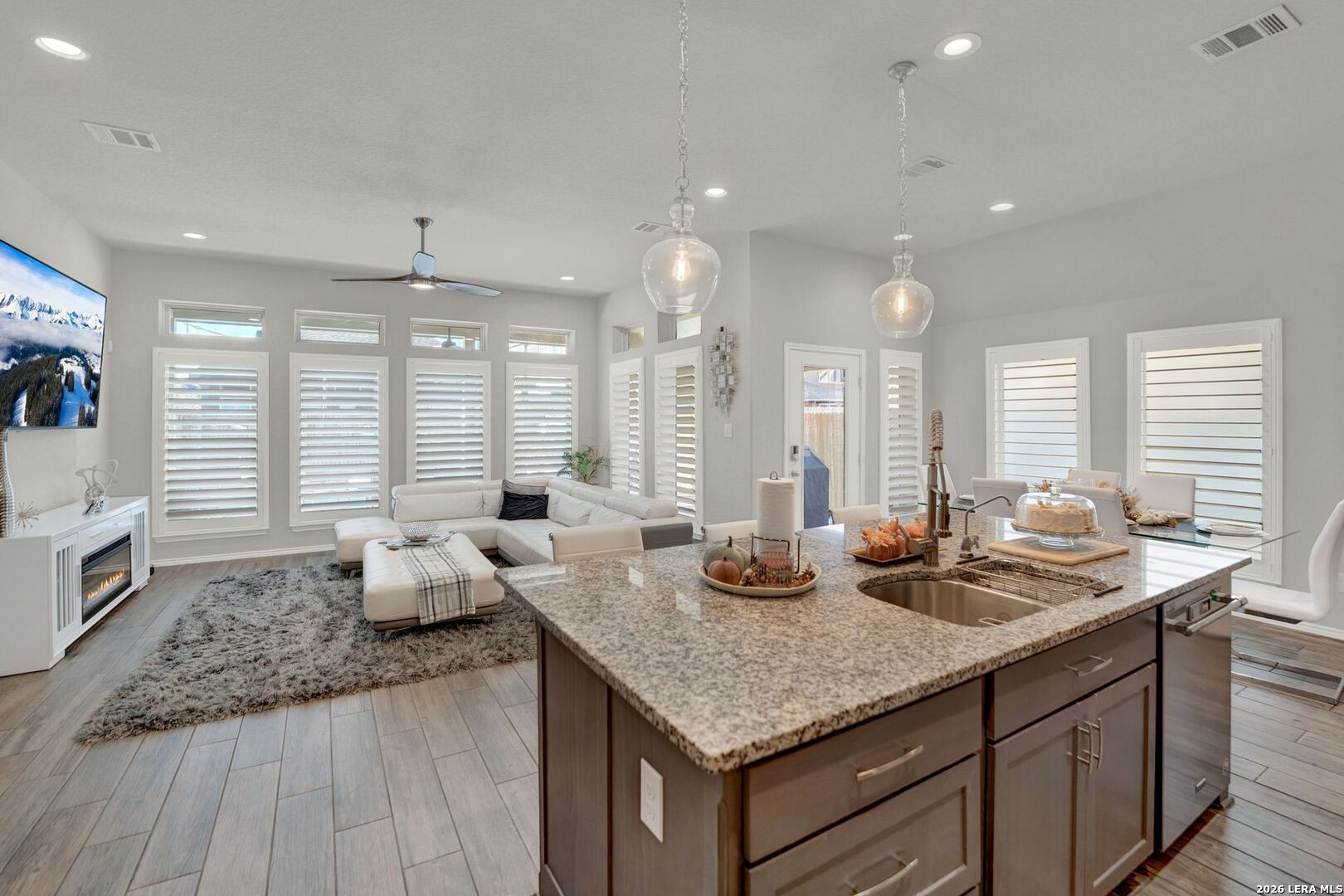 Stunning one-story home featuring 4 bedrooms and 3 full bathrooms with numerous upgrades throughout. The welcoming entry opens to ceramic wood-grain tile flooring and a spacious, well-designed layout. Fully paid-off solar panels installed in 2021 provide excellent energy efficiency and long-term savings. Just off the entry are a private office with French glass doors and a large game room or secondary dining area, offering flexible living space. The kitchen features stainless steel appliances, granite countertops, tall cabinetry, and opens seamlessly to the living room filled with natural light from six tall windows. The primary suite includes large windows and a spacious ensuite bathroom with a walk-in shower, oversized ceramic tile, dual vanities, and a garden tub. The backyard is ideal for entertaining with a gated pool, covered patio with ceiling fans, and low-maintenance landscaping including artificial turf and xeriscaping, perfect for pets. The front yard is equipped with an irrigation sprinkler system. Additional upgrades include custom shutters, Culligan water softener and reverse osmosis system, epoxy garage flooring, gutters, and upgraded interior lighting with pendant fixtures. Located in the desirable Kallison Ranch community with convenient access to Loop 1604, Culebra Road shopping, SeaWorld, and Lackland AFB.
