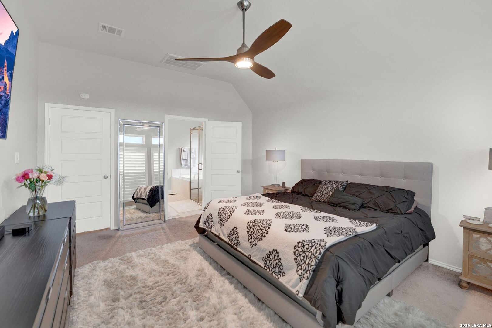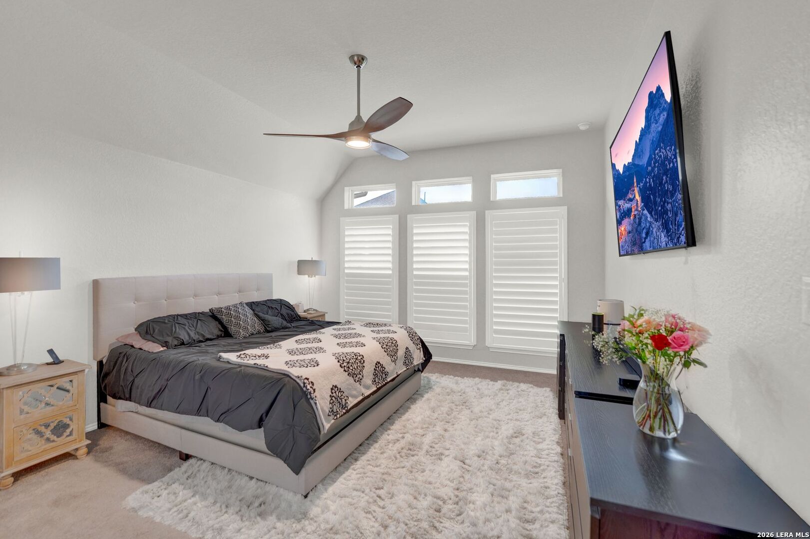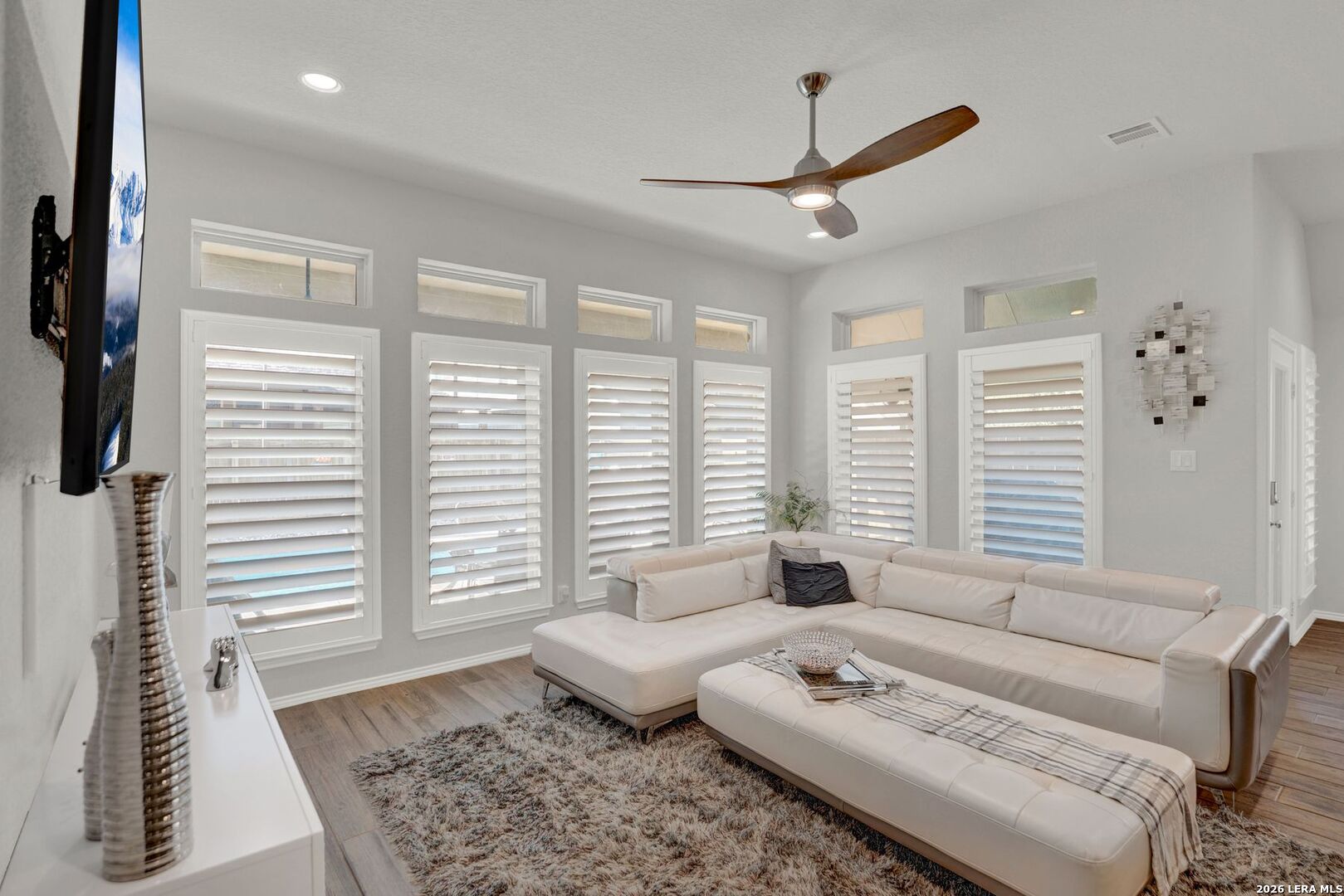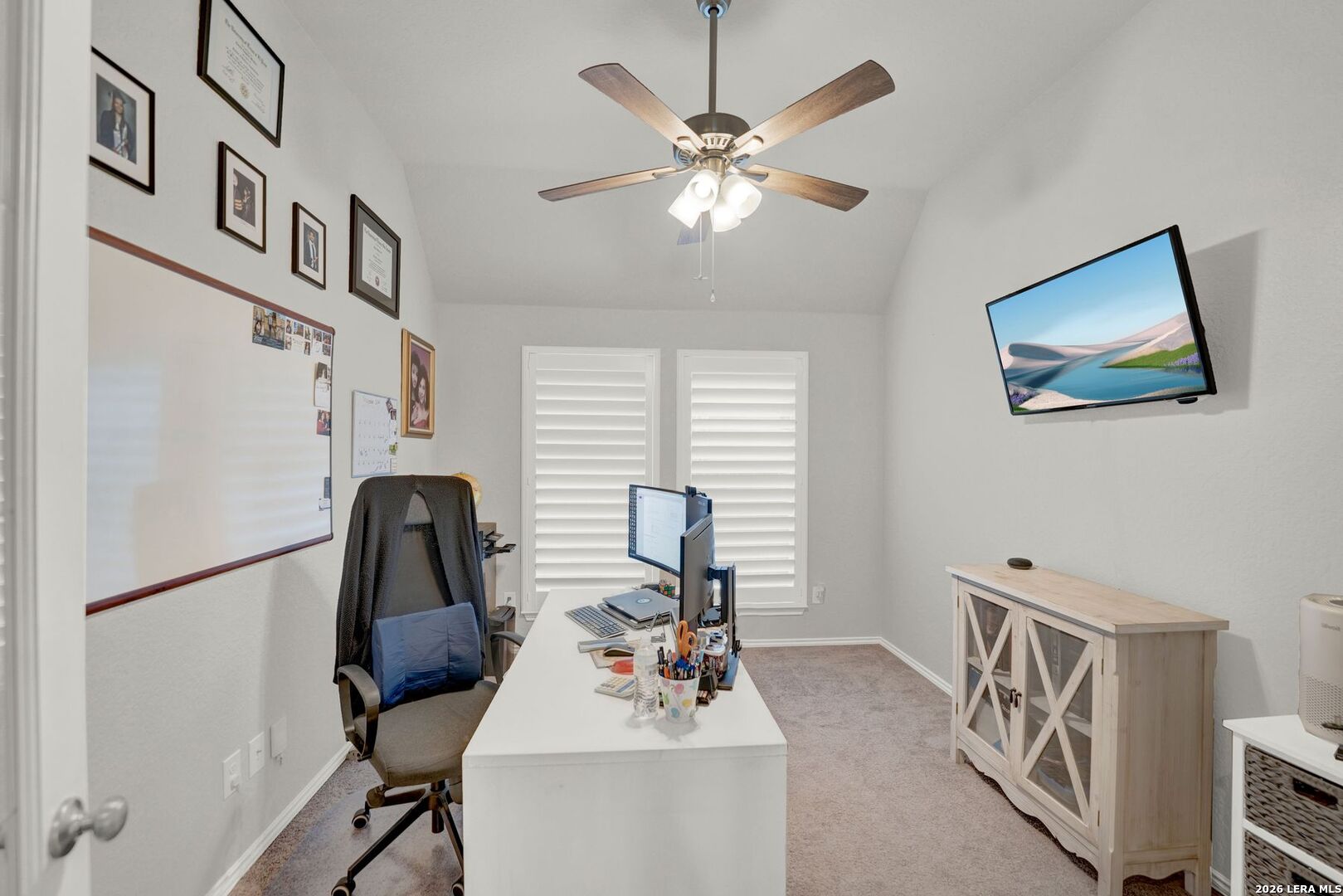 Stunning one-story home featuring 4 bedrooms and 3 full bathrooms with numerous upgrades throughout. The welcoming entry opens to ceramic wood-grain tile flooring and a spacious, well-designed layout. Fully paid-off solar panels installed in 2021 provide excellent energy efficiency and long-term savings. Just off the entry are a private office with French glass doors and a large game room or secondary dining area, offering flexible living space. The kitchen features stainless steel appliances, granite countertops, tall cabinetry, and opens seamlessly to the living room filled with natural light from six tall windows. The primary suite includes large windows and a spacious ensuite bathroom with a walk-in shower, oversized ceramic tile, dual vanities, and a garden tub. The backyard is ideal for entertaining with a gated pool, covered patio with ceiling fans, and low-maintenance landscaping including artificial turf and xeriscaping, perfect for pets. The front yard is equipped with an irrigation sprinkler system. Additional upgrades include custom shutters, Culligan water softener and reverse osmosis system, epoxy garage flooring, gutters, and upgraded interior lighting with pendant fixtures. Located in the desirable Kallison Ranch community with convenient access to Loop 1604, Culebra Road shopping, SeaWorld, and Lackland AFB.