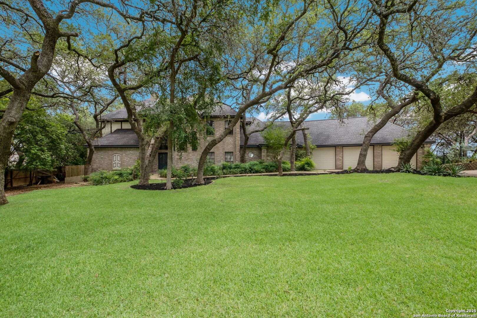 Perched atop a scenic bluff in the coveted Churchill Estates, this stately two-story residence offers sweeping, unobstructed views of downtown San Antonio. Nestled on a tranquil, tree-studded lot within North East ISD, 14706 War Admiral delivers timeless elegance, spacious living, and unforgettable outdoor spaces. Inside, you'll find soaring ceilings, oversized windows, and an open layout that floods the home with natural light and frames stunning vistas. The grand living area centers around a dramatic floor-to-ceiling brick fireplace and flows into a light-filled kitchen featuring granite counters, stainless steel appliances, and a breakfast nook overlooking the hills. The downstairs primary suite is a private retreat with serene views, dual vanities, a large walk-in shower, and a dedicated vanity space. Upstairs, you'll find generously sized bedrooms and a private upstairs patio to soak in the skyline. Enjoy entertaining on the expansive covered patio or relax poolside while taking in the unobstructed bluff-top views. The elevated deck is ideal for al fresco dining, sunset watching, or simply unwinding above it all. Additional highlights include a huge 3-car garage, two fireplaces, abundant storage, and refined architectural details throughout. Located in the coveted Churchill Estates and zoned to top-rated NEISD schools, this home offers the perfect blend of comfort, elegance, and exceptional views-all just minutes from shopping, dining, and Loop 1604.