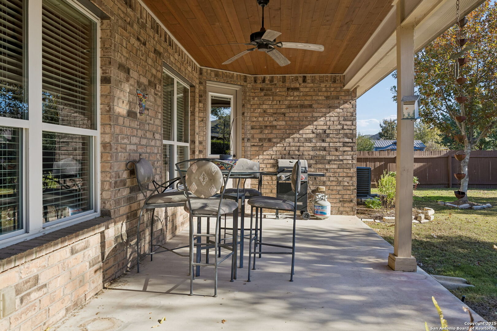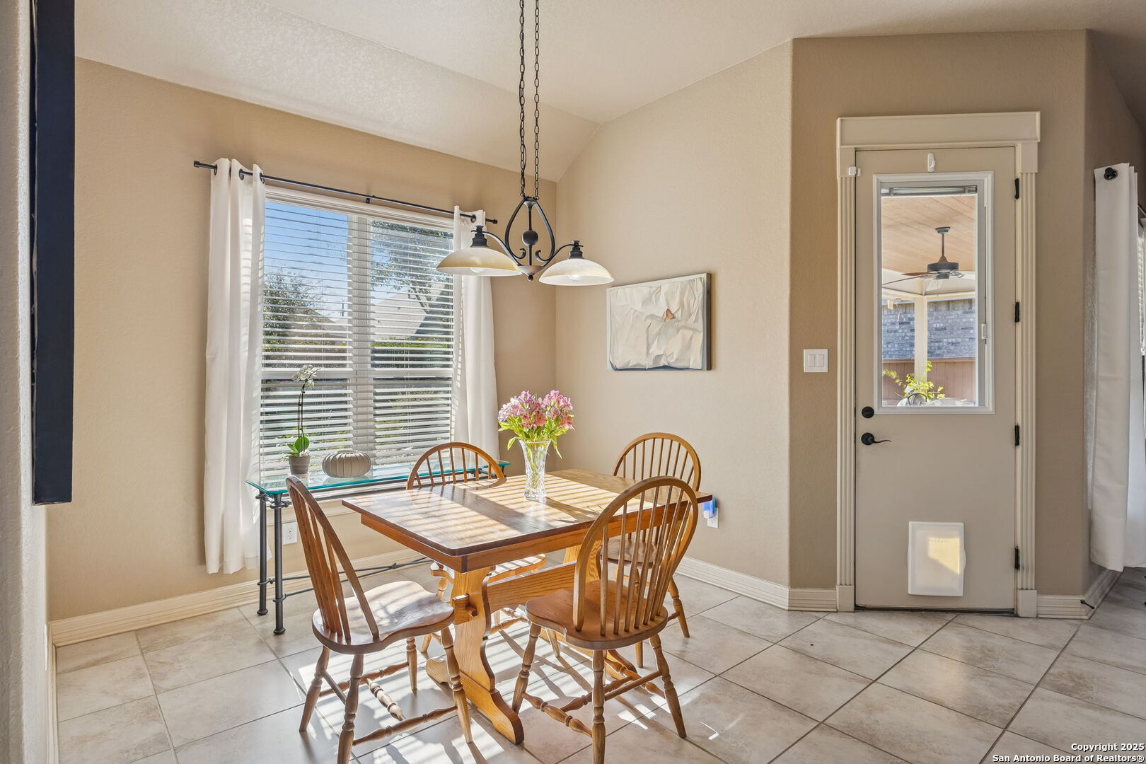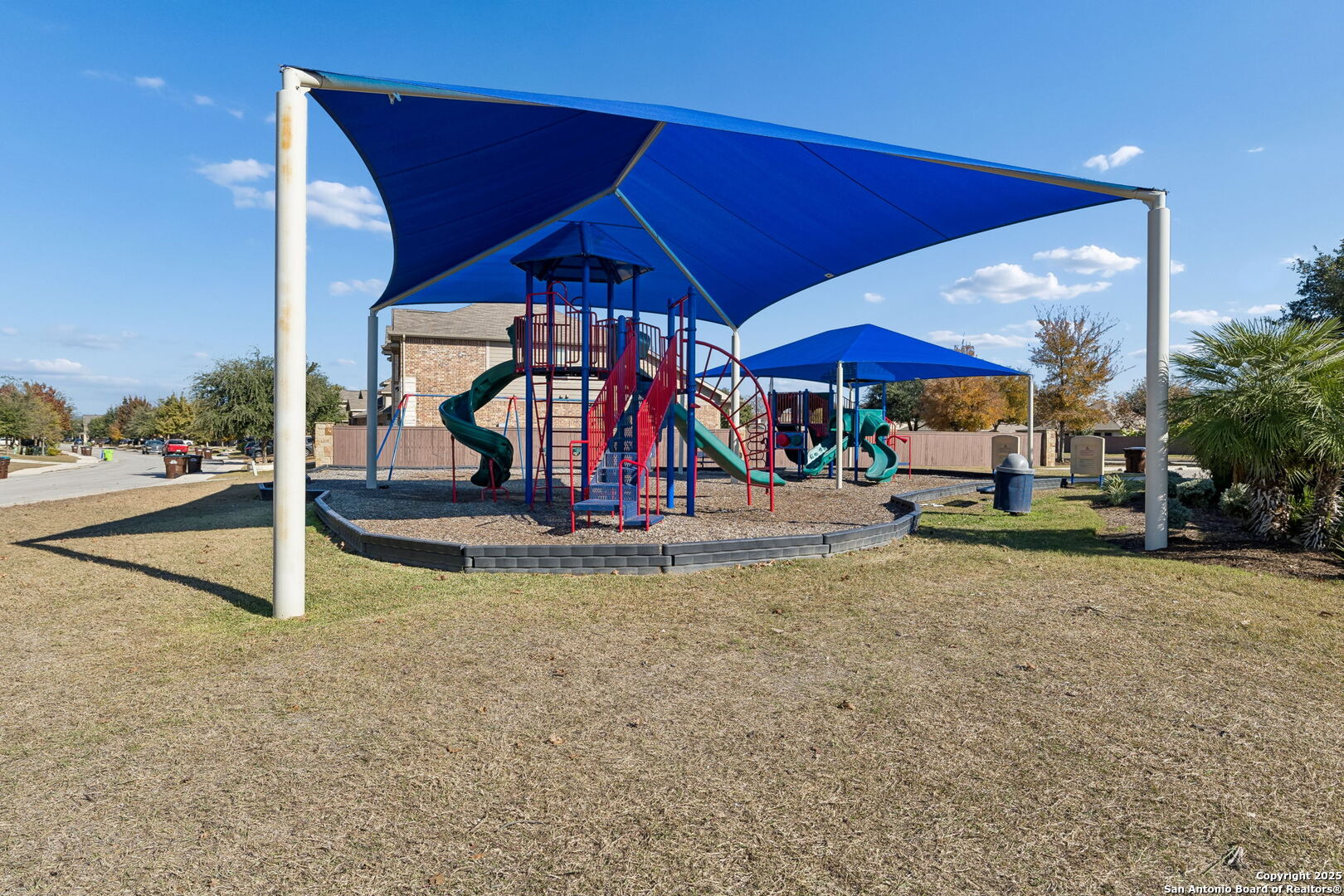 Ask about special lender incentives available. Built in 2015, this well-appointed New Leaf residence showcases thoughtful design, inviting living spaces, and beautiful curb appeal with a welcoming covered front porch and meticulously maintained landscaping. Inside, soaring ceilings and continuous tile flooring create a bright, open feel. Just off the foyer, glass French doors open to a private office currently styled as a library, ideal for working from home or a quiet retreat. A conveniently located half bath adds ease for guests. The open-concept kitchen and living areas are filled with natural light and overlook the landscaped backyard. The kitchen is both functional and refined, featuring granite countertops, abundant cabinetry, stainless steel appliances, a gas cooktop, double ovens, a built-in microwave, a brick island with high-top seating, and a walk-in pantry. Privately located off the main living area, the primary suite offers peaceful backyard views and a relaxing retreat. The en suite bath includes dual sinks, an oversized walk-in shower, and a spacious walk-in closet. Two additional bedrooms are positioned on the opposite side of the home, each with walk-in closets. One is generously sized with carpet, while the third features tile flooring and is currently used as a home office, offering flexibility for guests, hobbies, or a playroom. A large linen closet provides additional storage. The backyard is a true highlight, featuring an extended covered patio with a wood-trim ceiling, ideal for morning coffee or outdoor entertaining. Additional features include front and backyard irrigation, an extended-length two-car garage with extra storage, a new roof in 2025, and a new HVAC condenser in 2024. Located in Kallison Ranch, residents enjoy two community pools, two playgrounds, walkable access to Henderson Elementary, and a planned HEB at Culebra Road and Highway 211. Thoughtfully designed and well maintained, this home offers comfort, functionality, and a strong sense of community. Schedule your private showing today.