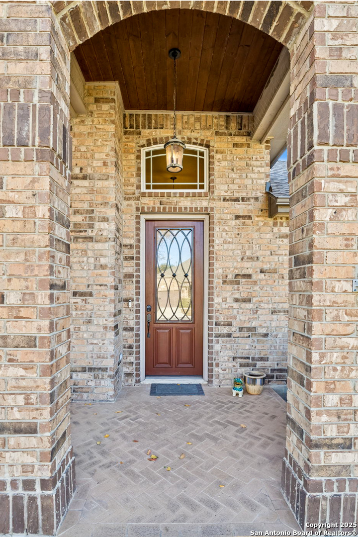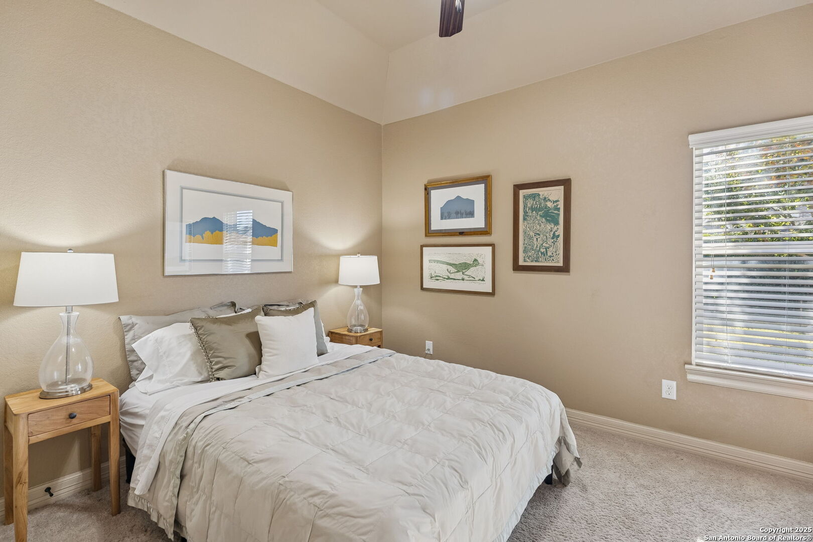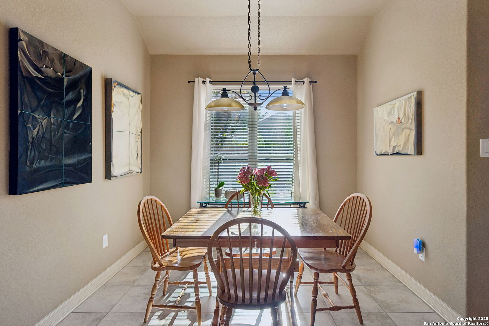 Ask about special lender incentives available. Built in 2015, this well-appointed New Leaf residence showcases thoughtful design, inviting living spaces, and beautiful curb appeal with a welcoming covered front porch and meticulously maintained landscaping. Inside, soaring ceilings and continuous tile flooring create a bright, open feel. Just off the foyer, glass French doors open to a private office currently styled as a library, ideal for working from home or a quiet retreat. A conveniently located half bath adds ease for guests. The open-concept kitchen and living areas are filled with natural light and overlook the landscaped backyard. The kitchen is both functional and refined, featuring granite countertops, abundant cabinetry, stainless steel appliances, a gas cooktop, double ovens, a built-in microwave, a brick island with high-top seating, and a walk-in pantry. Privately located off the main living area, the primary suite offers peaceful backyard views and a relaxing retreat. The en suite bath includes dual sinks, an oversized walk-in shower, and a spacious walk-in closet. Two additional bedrooms are positioned on the opposite side of the home, each with walk-in closets. One is generously sized with carpet, while the third features tile flooring and is currently used as a home office, offering flexibility for guests, hobbies, or a playroom. A large linen closet provides additional storage. The backyard is a true highlight, featuring an extended covered patio with a wood-trim ceiling, ideal for morning coffee or outdoor entertaining. Additional features include front and backyard irrigation, an extended-length two-car garage with extra storage, a new roof in 2025, and a new HVAC condenser in 2024. Located in Kallison Ranch, residents enjoy two community pools, two playgrounds, walkable access to Henderson Elementary, and a planned HEB at Culebra Road and Highway 211. Thoughtfully designed and well maintained, this home offers comfort, functionality, and a strong sense of community. Schedule your private showing today.
