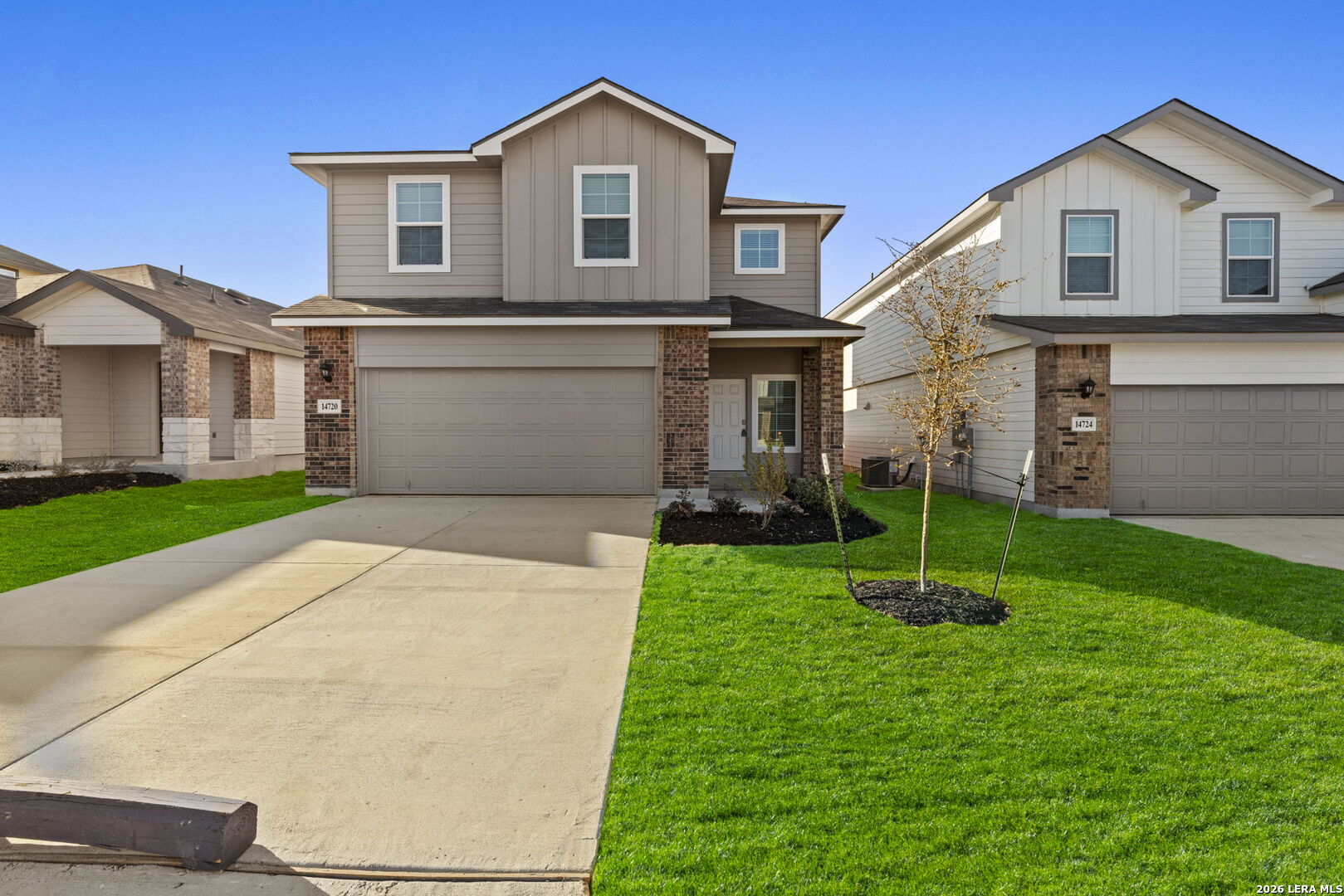 Welcome to The Emma, a two-story home in Stonehill offering a 2-car garage and a full yard landscaping and irrigation package, ensuring that your home looks it's best every single day. Inside this 3 bedroom, 2.5 bathroom home, you'll find 1700 square feet of living space. The entry opens to grand family room before flowing into the kitchen and dining area with an open floorplan concept. The gourmet kitchen includes quartz counter tops, shaker style cabinetry, stainless steel appliances, large breakfast island, and spacious pantry. Head up the stairs to find the main bedroom suite, all secondary bedrooms, the laundry room, and a second full bath. The Emma layout is perfect if you love entertaining downstairs and relaxing upstairs. The private main bedroom features an attractive ensuite with plenty of shelving space and shaker style cabinetry. A spacious tiled walk-in shower, separate door for your toilet, and large walk-in closet provide all the space and convenience you need. Additional features of The Emma floor plan include sheet vinyl flooring in entry, living room, and all wet areas, quartz bathroom countertops, and a covered back patio. *Seller is willing to assist with closing costs or a rate buy-down through preferred lender with an acceptable offer. *