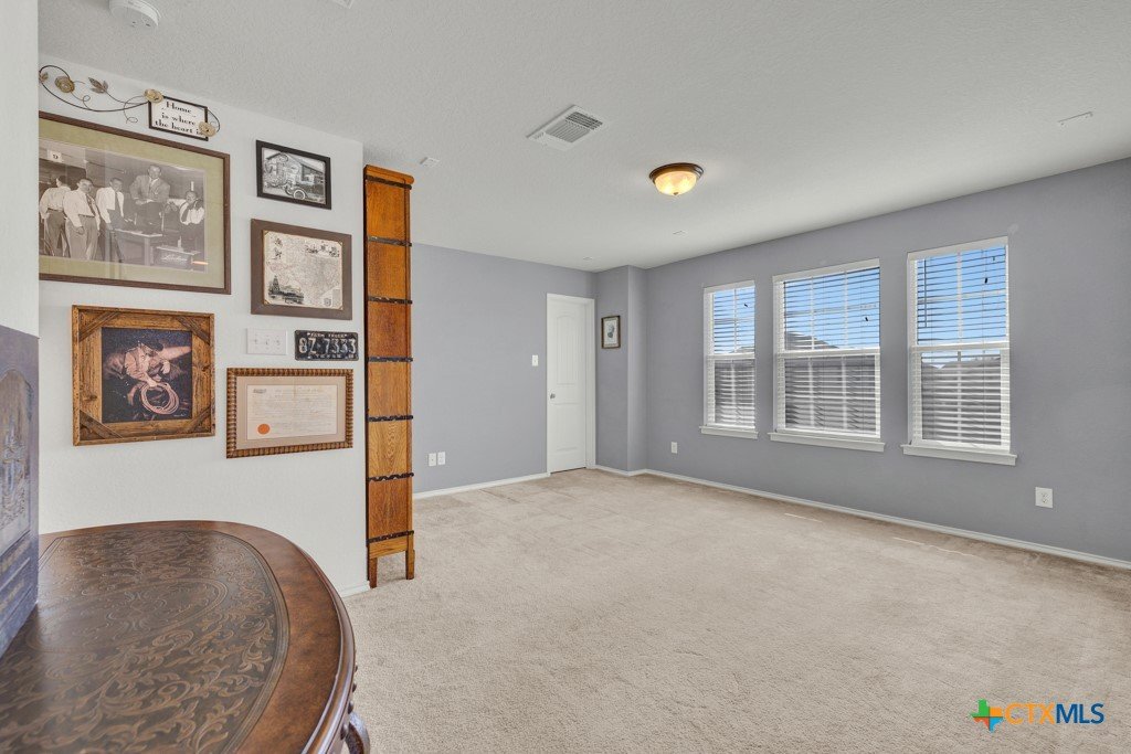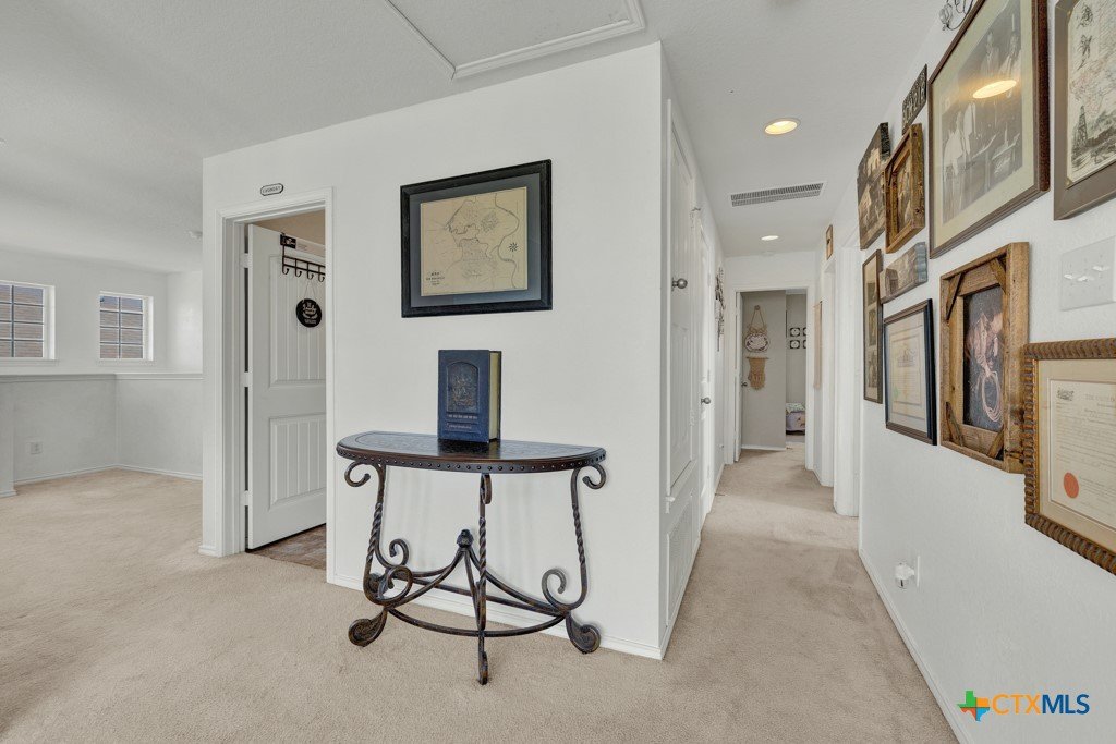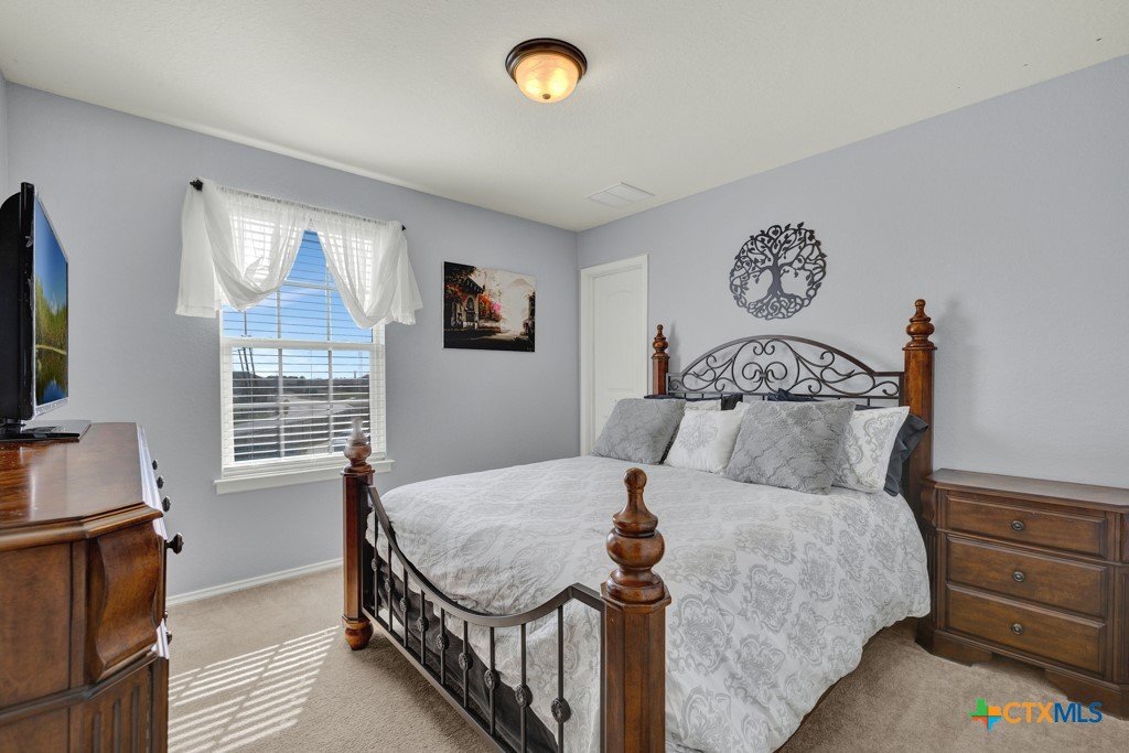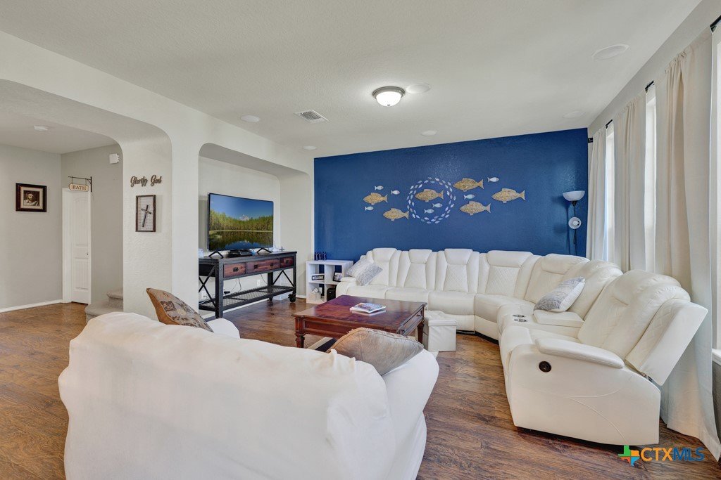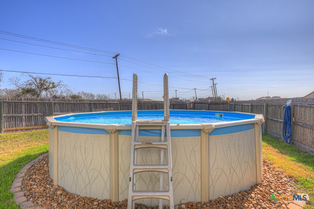 Located in New Braunfels, this 2,179-square-foot two-story home sits on a generously sized lot and features 3 bedrooms and 2.5 baths. The kitchen showcases a 3.5' x 10' peninsula with counter-height bar seating, and you'll have 9-foot ceilings, 42" cabinets, and room for a large dining table. Wood laminate and tile flooring grace the main level, while the open-concept living area is wired for surround sound, making entertaining effortless. Upstairs includes a 115-square-foot second living room with its own closet and a split-bedroom plan with the laundry adjacent for convenience. With no neighbors behind, the oversized backyard features an 18-foot-diameter above-ground pool, fruit and maple trees, and a patio slab for outdoor privacy and entertaining. The home is less than a mile from the Guadalupe River and close to shopping, medical facilities, downtown, and tubing. New Braunfels, known for Wurstfest, Schlitterbahn, Wassailfest, Nagelin's (the oldest bakery in Texas), and Gruene Hall (the oldest dance hall in Texas), was recognized in 2024 as one of the top 50 places to live in the United States.