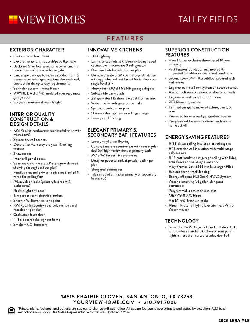 Beautiful two-story Wisteria floor plan offering 4 bedrooms, 3 full baths, and approximately 2,489 sq ft of thoughtfully designed living space. This home features an open concept main level with a spacious living area that flows into the dining room and modern kitchen. The kitchen includes solid surface countertops, stainless steel appliances, a center island, and ample cabinet storage. The first floor includes a secondary bedroom with access to a full bath, ideal for guests or multigenerational living. Upstairs, the private owner's suite features a large walk-in closet and an ensuite bath. Two additional bedrooms, a full bath, and a versatile game room complete the second level. Additional features include a two car garage, dedicated laundry room, and a covered outdoor area perfect for relaxing or entertaining. Located in the growing Talley Fields community with convenient access to Loop 1604, Hwy 211, 151, and nearby shopping, dining, and entertainment. Disclosure: All information, including square footage, schools, floor plan details, and community features, is deemed reliable but not guaranteed. Verify all information. Square footage, elevations, and school zoning should be confirmed directly with the builder and local school district.