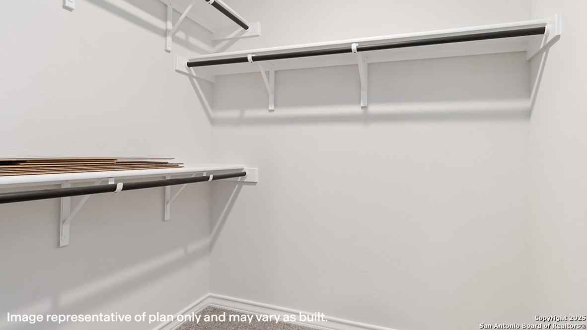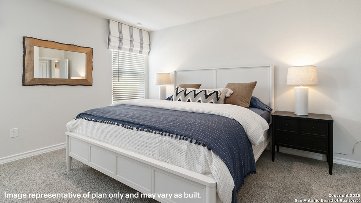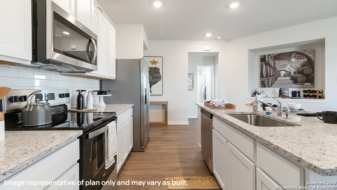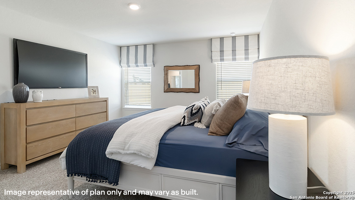 The Bryant is a stunning single-story home featured at Riverstone at Westpointe in San Antonio, TX. The Bryant is sure to impress with its selection of 3 front exteriors, 4 bedrooms, 2 bathrooms and 2-car garage. Welcome guests as they walk through the elongated foyer with a decorative nook wall feature to the spacious eat-in kitchen. Facing the blended dining area and living room, the kitchen includes an oversized island, corner pantry with shelving, plenty of cabinet storage, quartz countertops, stylish subway tile backsplash, stainless steel appliances, and a gas cooking range. The private main bedroom is located at the back of the house and features a relaxing ensuite bathroom complete with double vanities, a garden tub, walk-in shower, and a spacious walk-in closet. If privacy is your top priority, this bathroom comes standard with a separate water closet. Two secondary bedrooms are located off the entry and the other is centrally located off the kitchen. All have quality carpet, spacious closets and windows for plenty of natural lighting. Whether these rooms become bedrooms or other bonus spaces, there is sure to be comfort and functionality. Additional features include tall 9-foot ceilings, 2-inch faux wood blinds throughout the home, luxury vinyl plank flooring in the entry, family room, kitchen, and dining area, ceramic tile in the bathrooms and utility room, and pre-plumb for water softener loop. Relax outside on a covered patio (per plan) located off the family room and enjoy full yard landscaping and full yard irrigation. You'll enjoy added security in your new home with our Home is Connected features. Using one central hub that talks to all the devices in your home, you can control the lights, thermostat and locks, all from your cellular device.